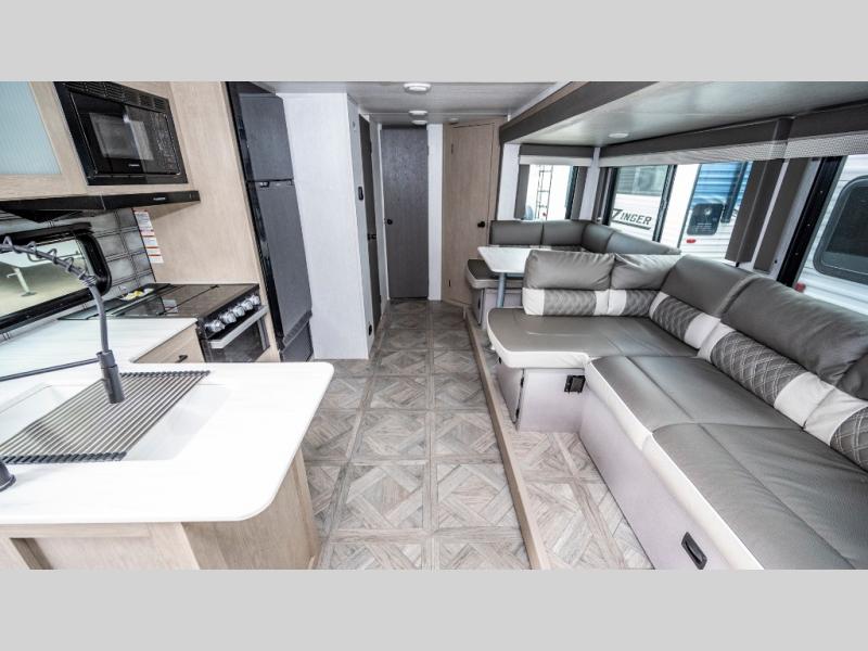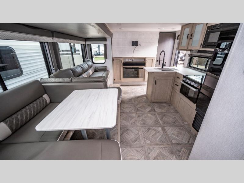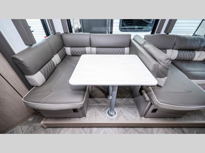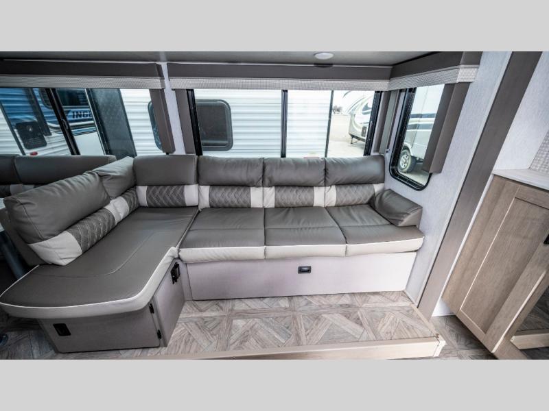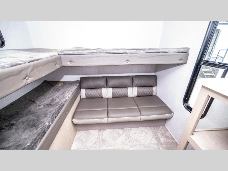 If you like to travel with a large crew, choose this Wildwood X-Lite Platinum trailer! This trailer has two private sleeping spaces with a private bedroom up front and a private bunkhouse in the back. Not only does the bunkhouse have three bunk beds, but it also has a closet for storage and a jiffy sofa for lounging. In the main living area, there is a large slide that holds the U-shaped dinette and sofa. These pieces of furniture are a part of the Versa Lounge, and you can customize them to function as you need them to. The panoramic windows surround the dinette and sofa so that you can take in the scenic views while you relax. You even have an outdoor camp kitchen to make it more convenient.