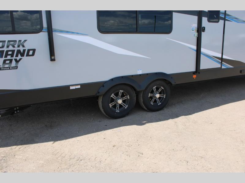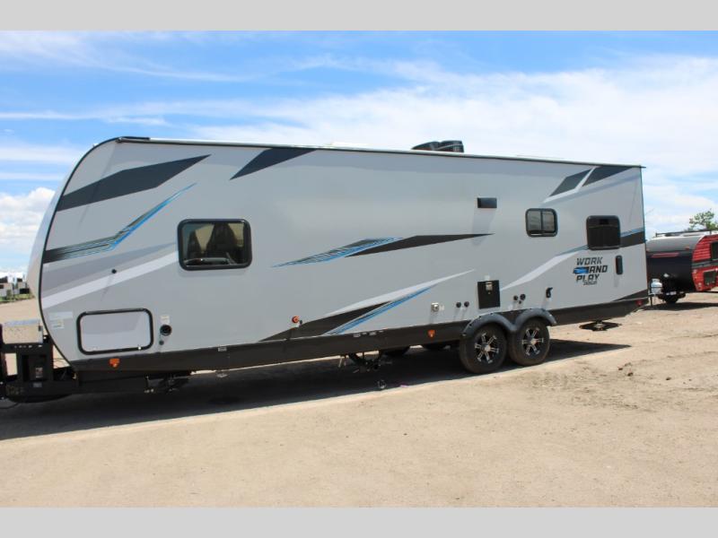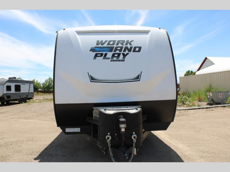 Each Work and Play toy hauler by Forest River is built tough with a mega rail powder coated chassis, a one-piece Tufflex PVC roof membrane, and a fiberglass front cap with rock guard. Towing is made hassle-free with the heavy duty Dexter axles with Nev-R-Adjust brakes and nitrogen filled tires. You will find many convenient features, such as a Winegard Air 360 and TV antenna, an outside spray port, and magnetic compartment door catches to store your riding gear. These toy haulers also include shaker style cabinets and doors, a residential bedspread, multiple USB ports for all your electronics, and many more amenities!