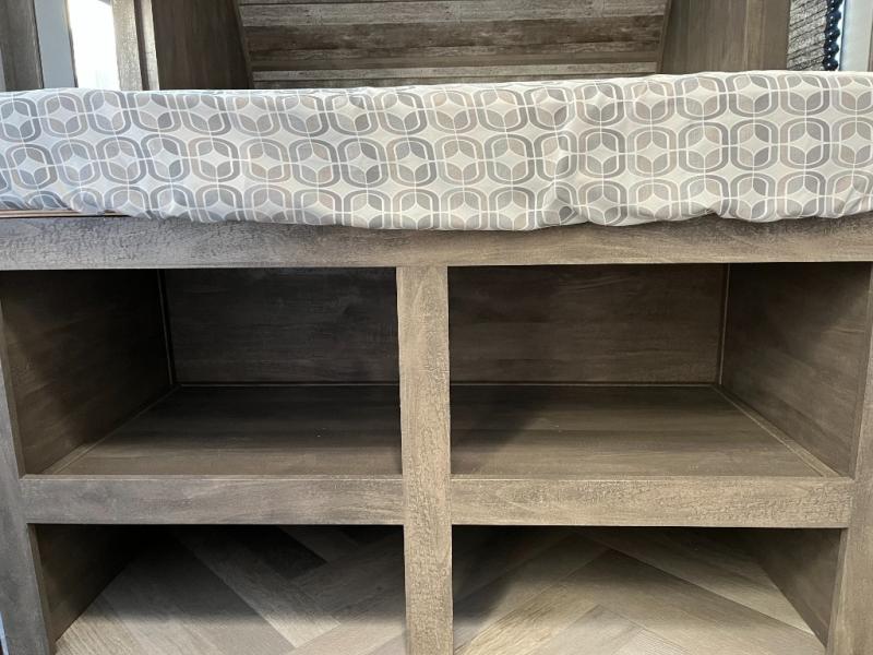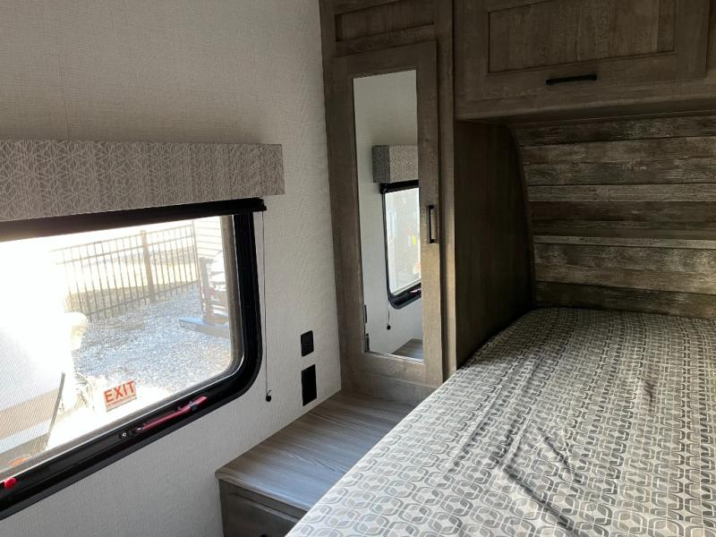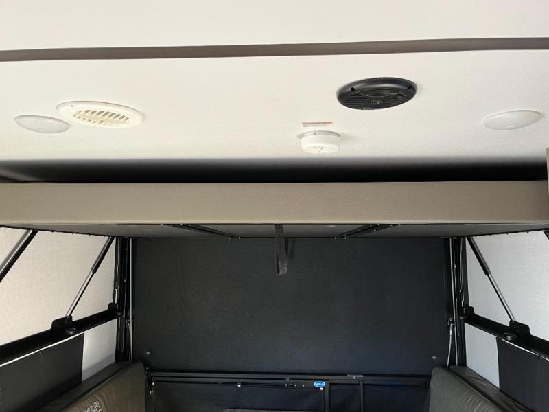 The main living area offers a comfortable and functional space where you can relax, dine, and unwind. A convertible dinette and seating area provide additional sleeping options when needed, making the 24LE ideal for families, groups of friends, or travelers who want flexible space. Large windows bring in plenty of natural light and scenic views, creating an inviting atmosphere inside.