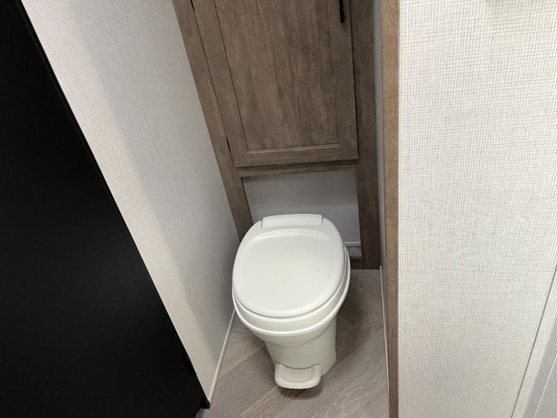 The private bedroom up front offers a peaceful retreat with a cozy bed, wardrobe storage, and convenience for overnight stays. The bathroom features a shower, toilet, and vanity, giving you everyday comfort no matter where you set up camp.