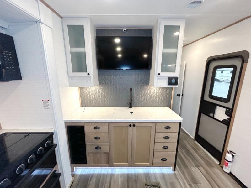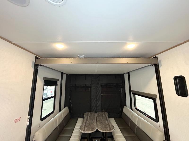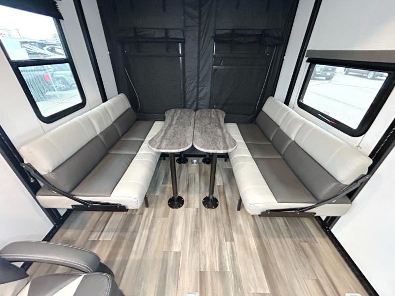 As you seek adventure with your toys, you can also require comfort in your own bedroom at the campsite! The front bedroom provides your own walk-around queen bed with dual wardrobes and windows with great views and natural lighting, plus access to the full bathroom with a radius shower. The main living and kitchen area offers two lounge chairs with end table in between to place your drinks on, dual sofas with dinettes in the rear to dine at, and a slide out with kitchen amenities plus there is extra counter space and a stainless steel single basin sink plus storage for the cook. You will love the hardwood cabinet doors, the grate style sink cover/drying rack, and the metropolitan grey countertops. And the furniture doubles as sleeping space, plus the electric bunk gives you room for two more.
