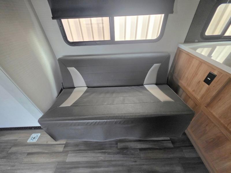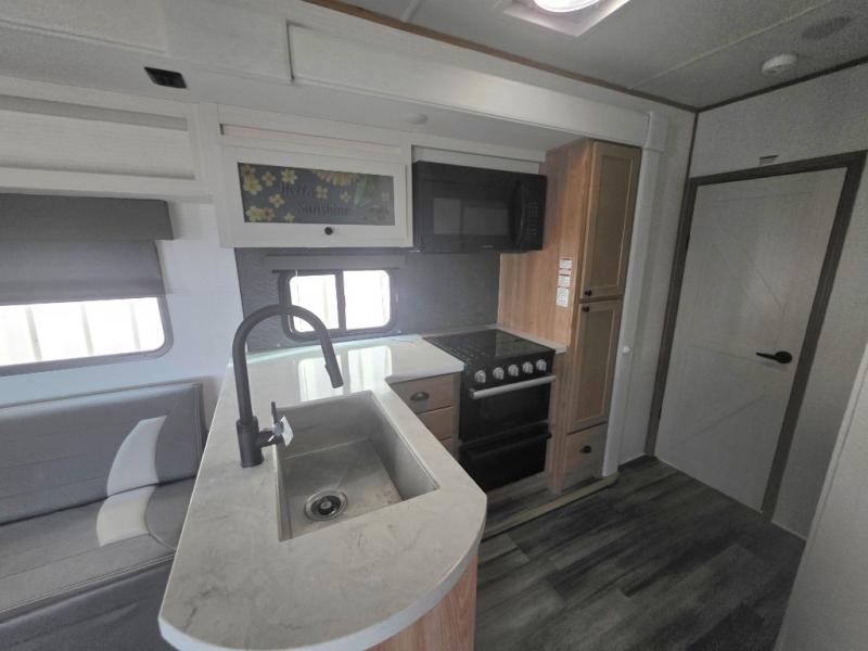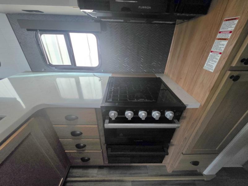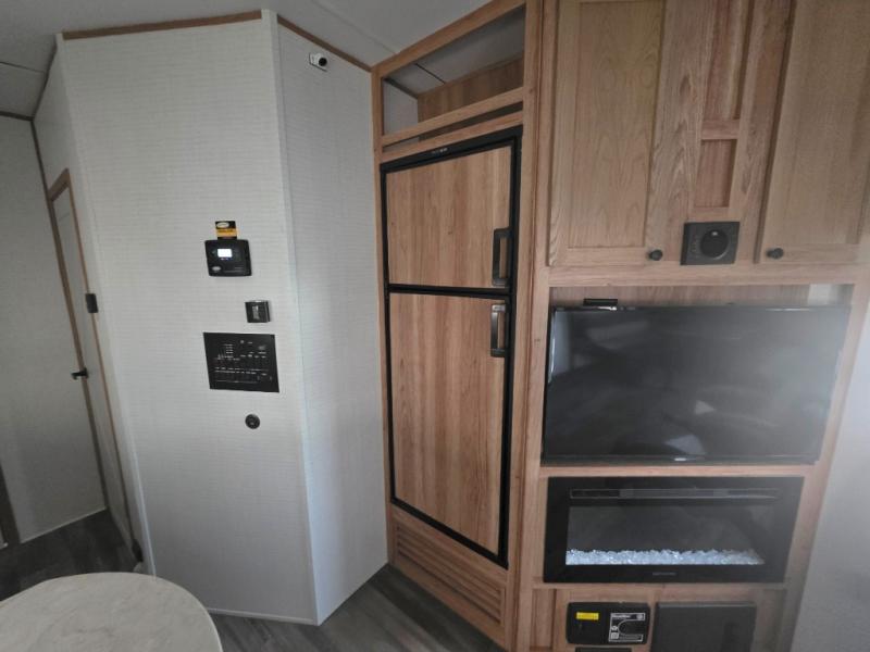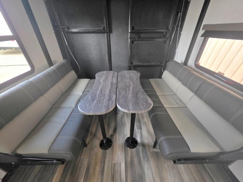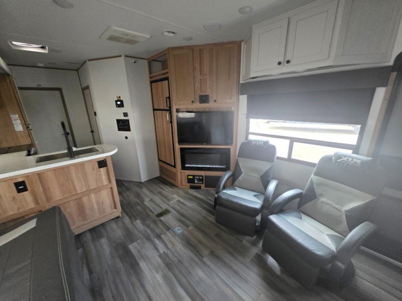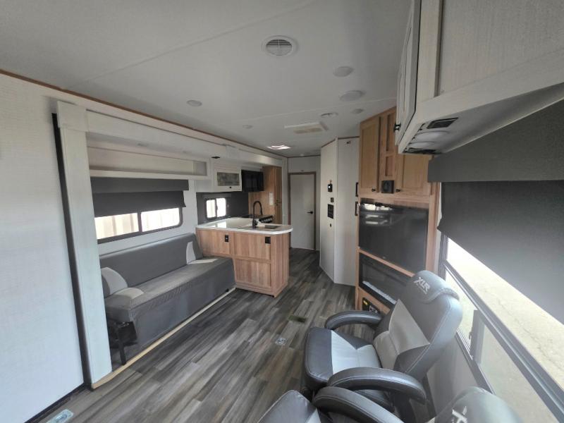 Load up your toys using the weather-proof ramp door into the garage to safely travel to your destination. After unloading, you can easily set up the ramp patio door kit, the 20' electric awning with LED lights, and the interior slide out so you can enjoy more floor space when cooking and relaxing in this combined living and kitchen area. You will have three sofas, removable dinette table, plus an end table between the two lounge chairs to sit and visit, dine at or watch the 39" TV with fireplace below. The cook will love the kitchen peninsula countertop, the stainless steel single basin sink, the 17" oven with cast iron three-burner cooktop, and the refrigerator to stock up on beverages and cold items. And there is sleeping space in the front master suite on the walk-around queen bed, and in the living area on the sofas and the electric bunk.