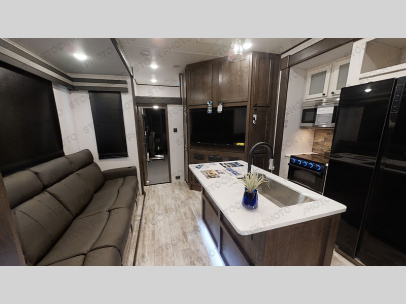 Pack your bags and load up your toys into the 15' garage area of this toy hauler with the spring assisted ramp door! The garage also has a set of opposing sofas with a table in between, a bed above them, a loft, and a half bathroom, plus one of the dual entry doors to the unit. The chef will enjoy cooking meals in the kitchen with the 17" oven, the cast iron cooktop, and the kitchen island which has two bar stools for you to sit while peeling potatoes. Relax in true comfort each night on the sofa slide across from the electric fireplace at the entertainment center which also has a 50" TV to watch your favorite movies. Clean up each morning in the full bathroom with a shower with a seat and skylight above for extra natural lighting. The front private bedroom has a king bed to lay your head on at night and a wardrobe slide to keep your clothes looking their best!