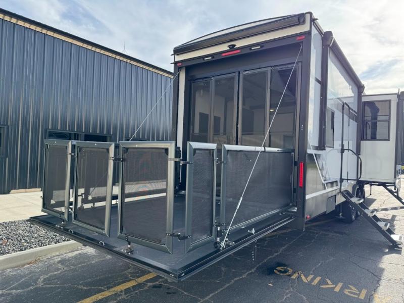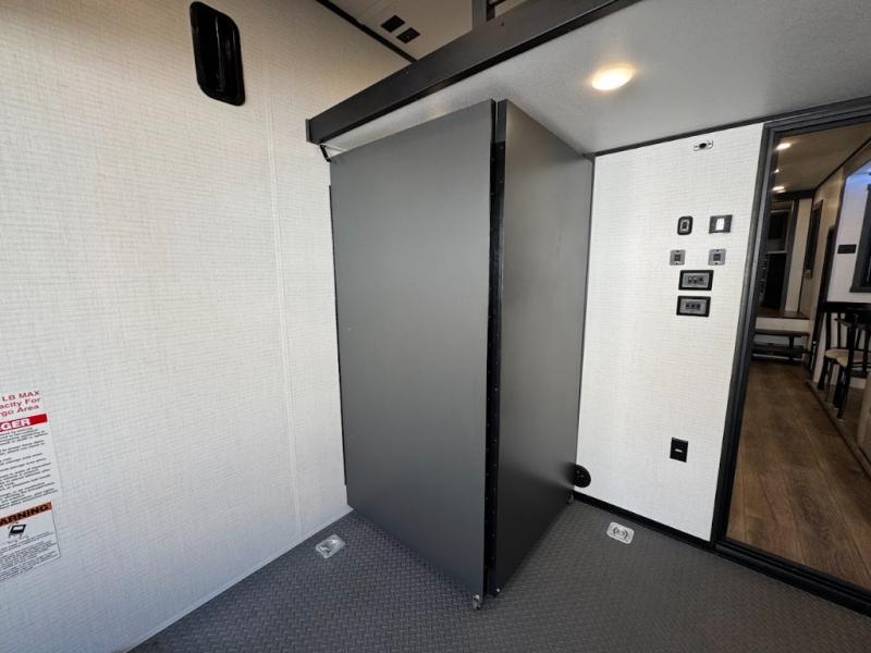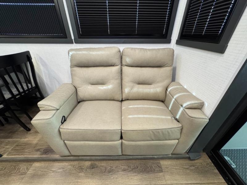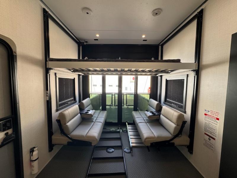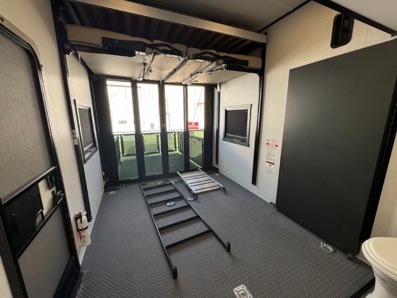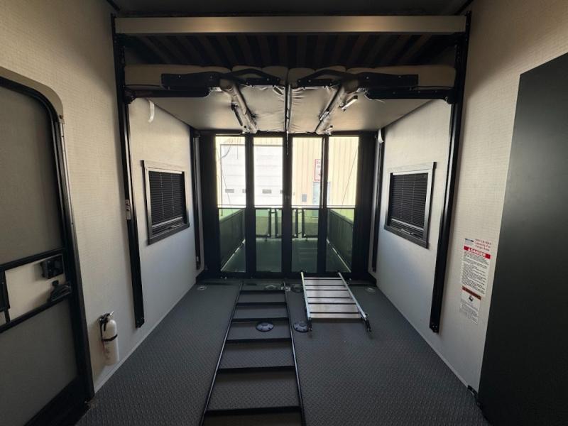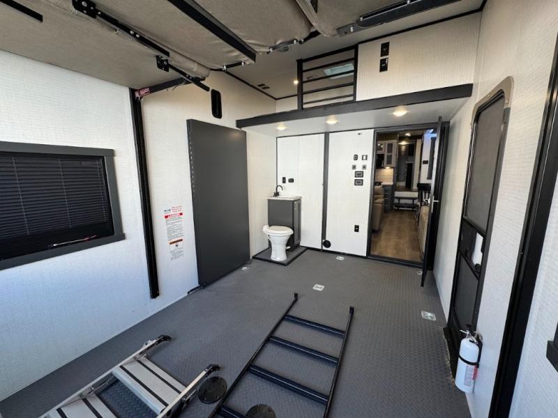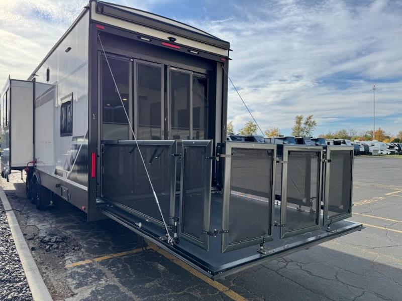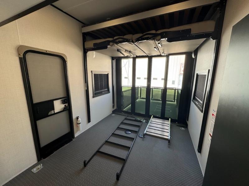 When you're ready to kick up some mud, hitch this toy hauler up and head out! You can set up the patio deck once your toys are removed from the 14' separate garage and relax with a cold drink. You'll find seating space on the Sit N Sleep roll-over sofas with a removable dinette table in between, and the Sleep N Store electric queen bed will provide sleeping space for your guests. There is also a loft and a half bath for even more convenience. Head through the garage glass sliding doors to the living area with an L-shaped sofa and theater seating, or start lunch in the shared middle kitchen with ample counter space. There is even a free-standing table and chairs like you would find at home. The full bath up front lets you clean up after a trail ride and the front private bedroom will have you feeling right at home. A king bed slide out comes standard, along with a large front wardrobe with washer and dryer prep, plus a dresser and TV backer if you want to add your own TV. Two power awnings provide tons of shade while you visit outdoors, and you can even choose a third optional awning for added comfort!