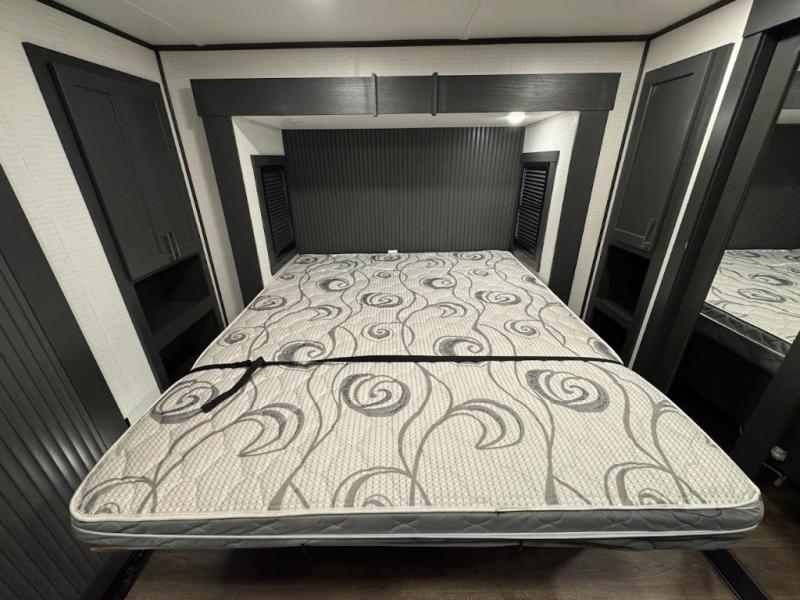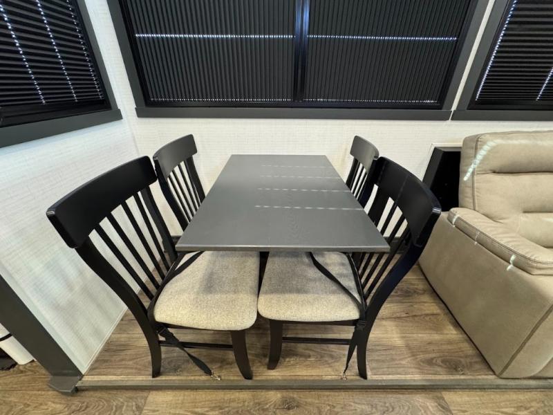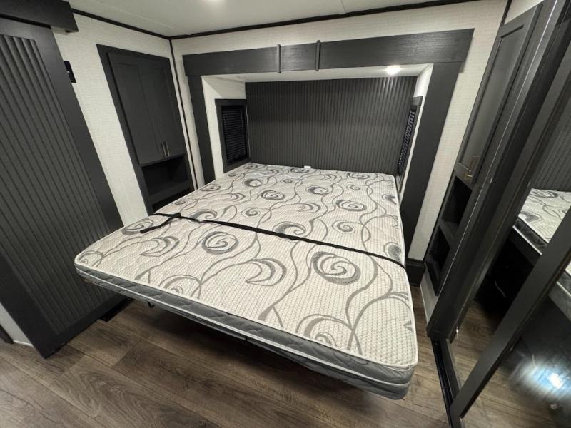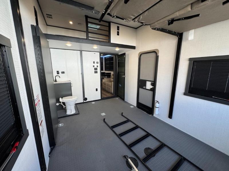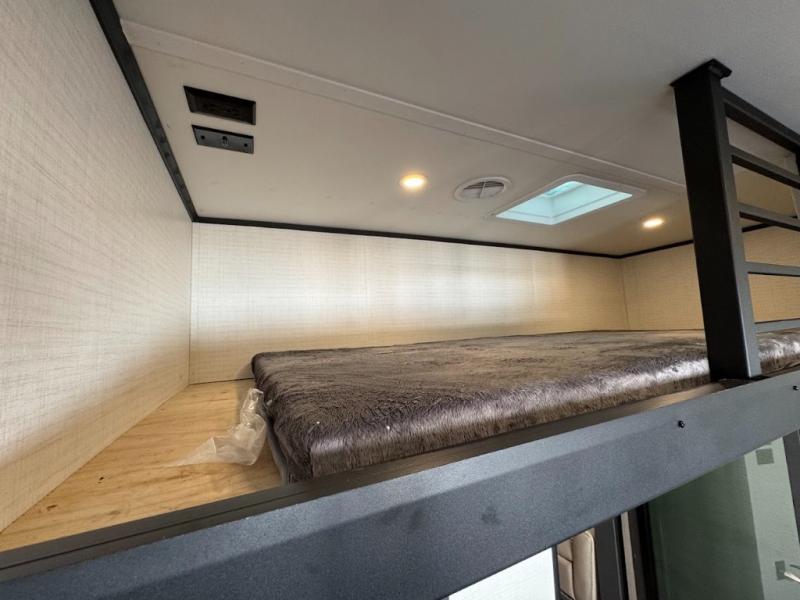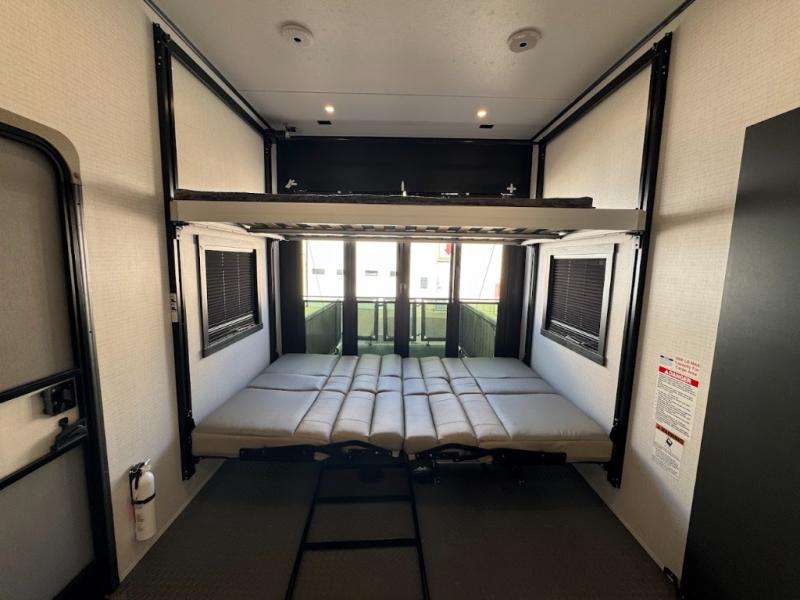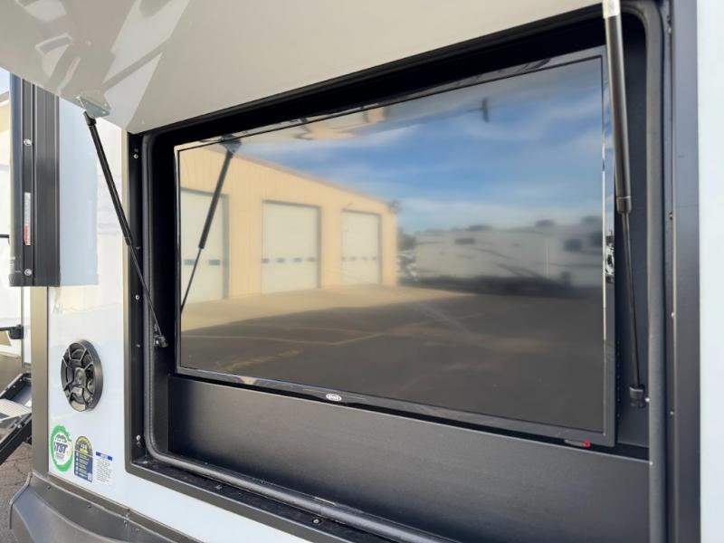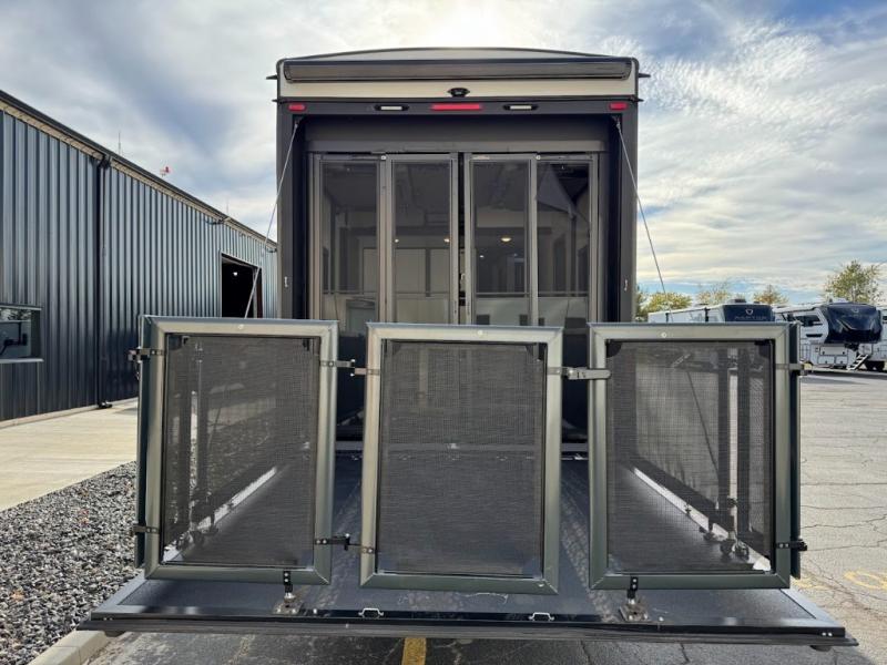 When you're ready to kick up some mud, hitch this toy hauler up and head out! You can set up the patio deck once your toys are removed from the 14' separate garage and relax with a cold drink. You'll find seating space on the Sit N Sleep roll-over sofas with a removable dinette table in between, and the Sleep N Store electric queen bed will provide sleeping space for your guests. There is also a loft and a half bath for even more convenience. Head through the garage glass sliding doors to the living area with an L-shaped sofa and theater seating, or start lunch in the shared middle kitchen with ample counter space. There is even a free-standing table and chairs like you would find at home. The full bath up front lets you clean up after a trail ride and the front private bedroom will have you feeling right at home. A king bed slide out comes standard, along with a large front wardrobe with washer and dryer prep, plus a dresser and TV backer if you want to add your own TV. Two power awnings provide tons of shade while you visit outdoors, and you can even choose a third optional awning for added comfort!