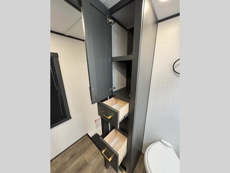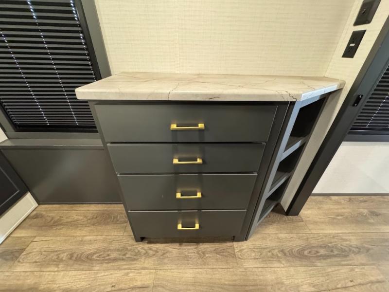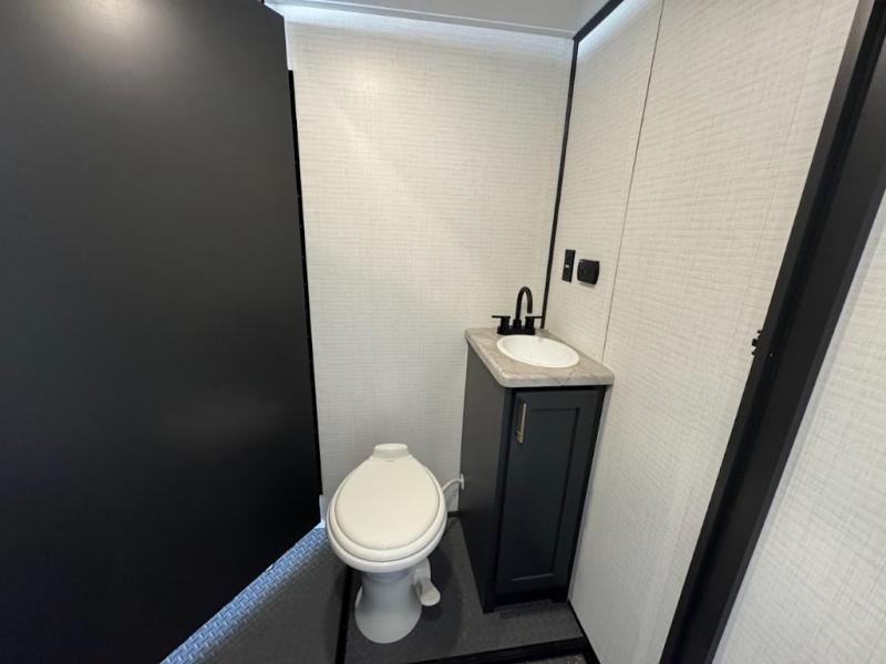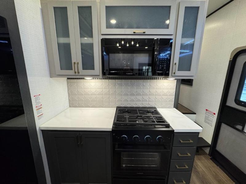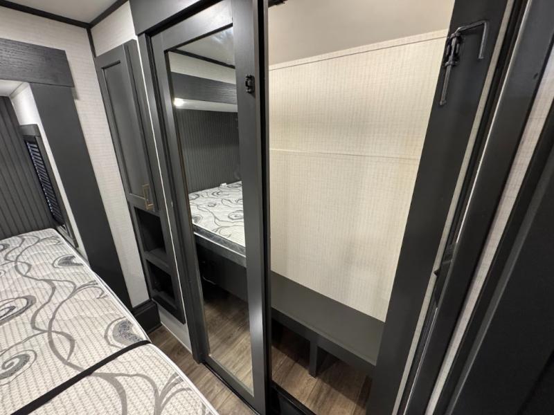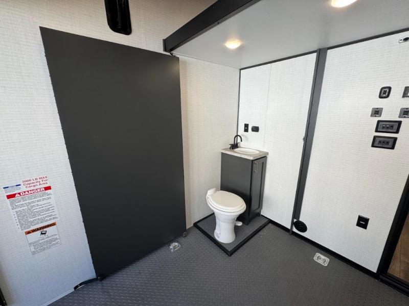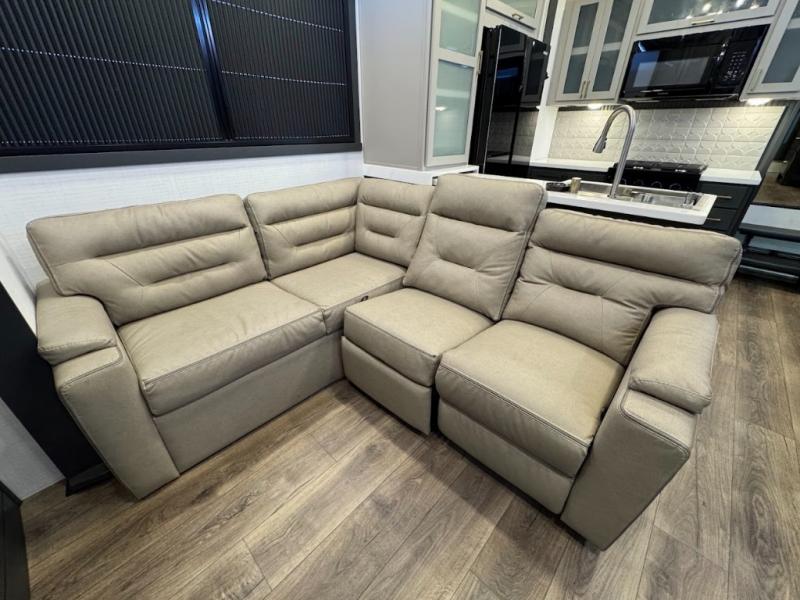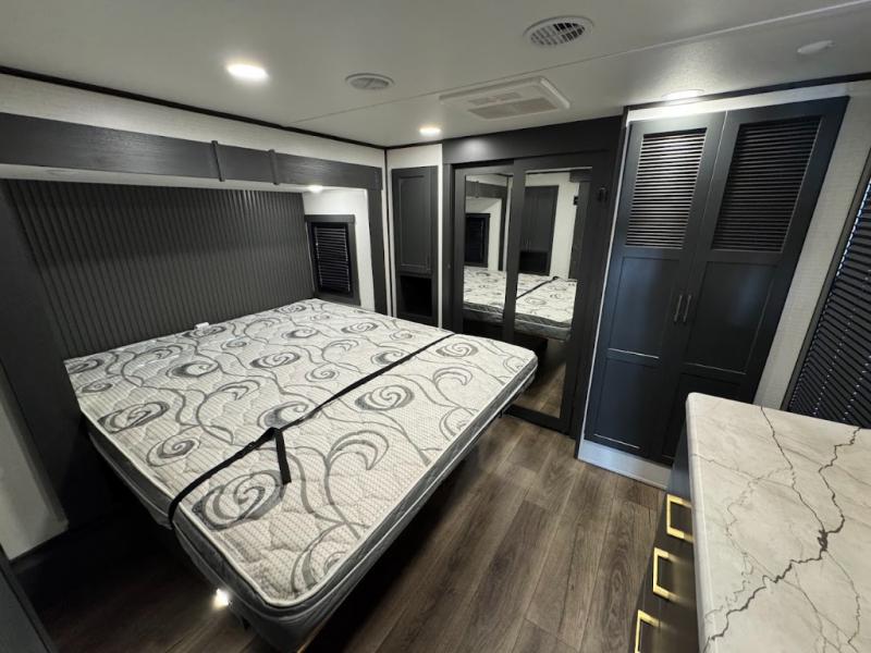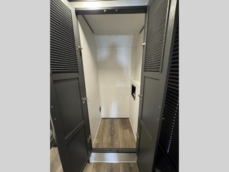 When you're ready to kick up some mud, hitch this toy hauler up and head out! You can set up the patio deck once your toys are removed from the 14' separate garage and relax with a cold drink. You'll find seating space on the Sit N Sleep roll-over sofas with a removable dinette table in between, and the Sleep N Store electric queen bed will provide sleeping space for your guests. There is also a loft and a half bath for even more convenience. Head through the garage glass sliding doors to the living area with an L-shaped sofa and theater seating, or start lunch in the shared middle kitchen with ample counter space. There is even a free-standing table and chairs like you would find at home. The full bath up front lets you clean up after a trail ride and the front private bedroom will have you feeling right at home. A king bed slide out comes standard, along with a large front wardrobe with washer and dryer prep, plus a dresser and TV backer if you want to add your own TV. Two power awnings provide tons of shade while you visit outdoors, and you can even choose a third optional awning for added comfort!