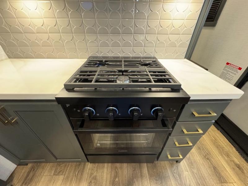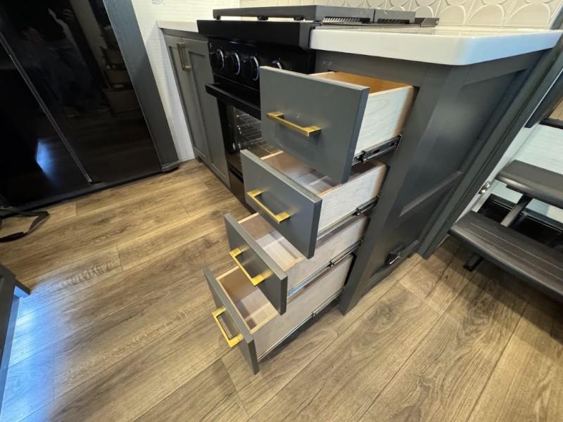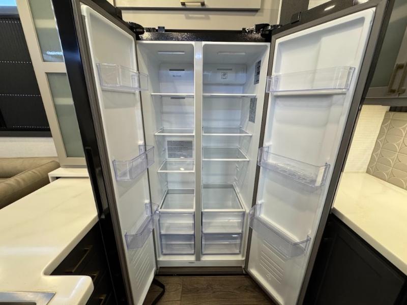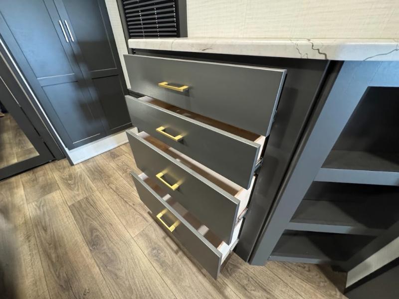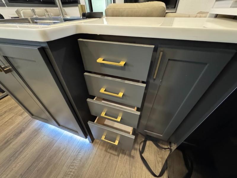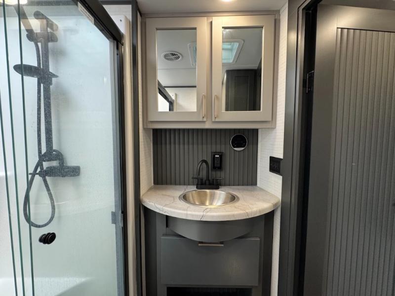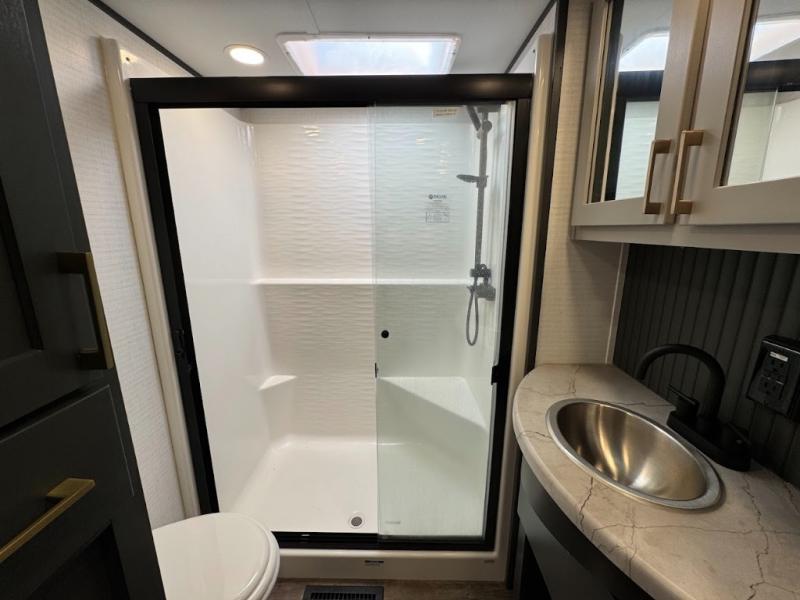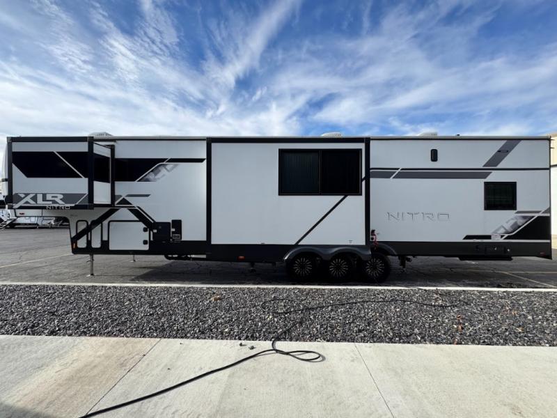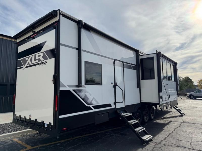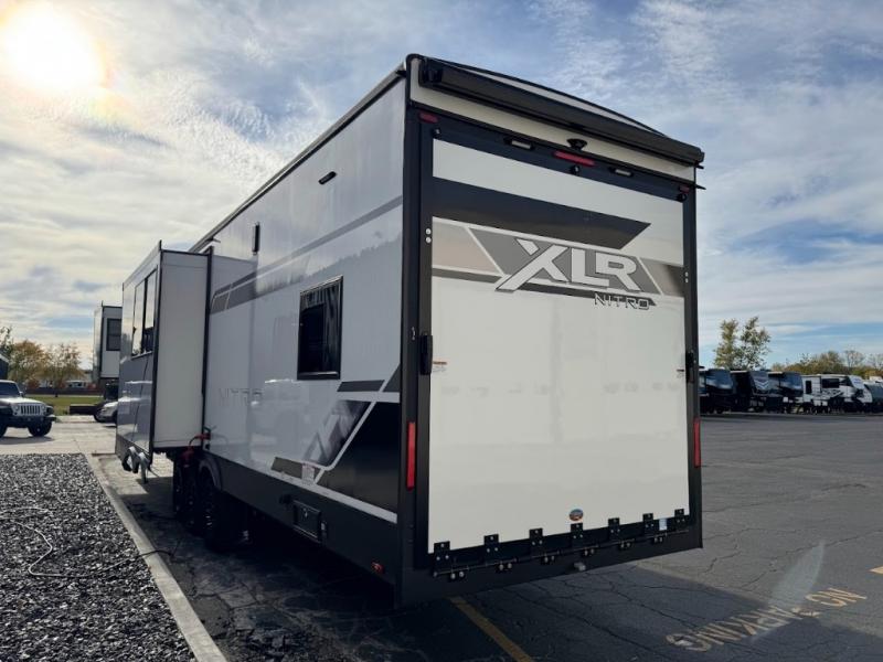 The outdoor enthusiasts has met their match with the XLR Nitro toy haulers by Forest River. The vacuum-bonded aluminum framed sidewalls, gel-coat fiberglass exterior, and singular roof membrane are just a few durable construction materials you will find on these models. There is a weatherproof insulated ramp door, 5,000 lb. cargo tie-downs, a 40 gallon fuel station, and more convenient garage features that will make camping with toys easier than ever. You'll appreciate smooth towing thanks to the MORryde CRE3000 suspension enhancement, Dexter EZ-Lube axles, and 16" Goodyear Endurance tires. A 200 watt roof-mounted solar panel also comes standard, along with two electric awnings with LED lights, undercarriage lighting, and friction hinge entry door(s). Some of the innovative technology features include a Winegard Air 360 antenna with WiFi prep and 4G LTE, convenient USB charging stations, and a Gear Guardian wireless camera for inside the garage to help keep your gear secure. You will also find diamonds solid surface kitchen countertops, Luna Quartz bathroom countertops, hardwood cabinet doors, stylish window trim package, and many more interior comforts.