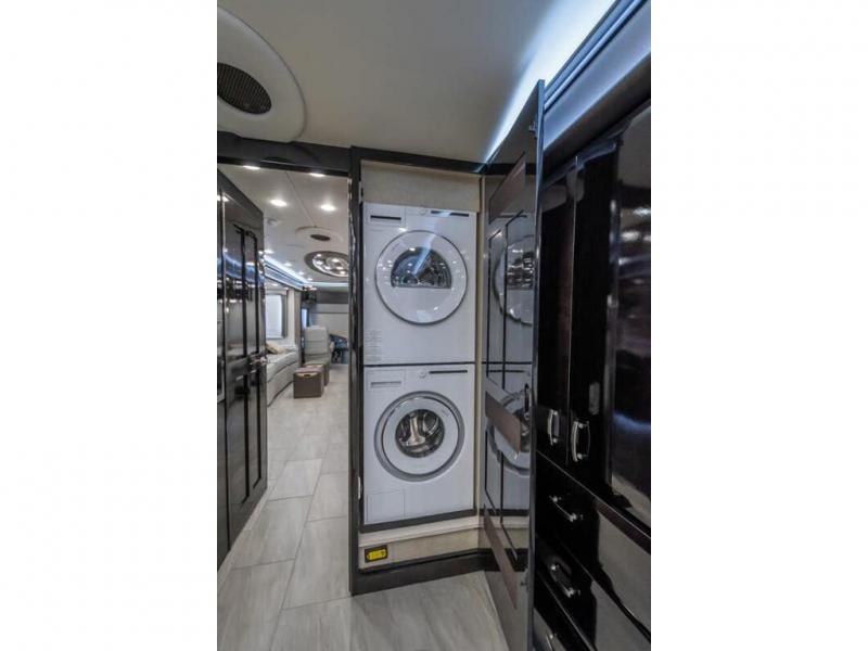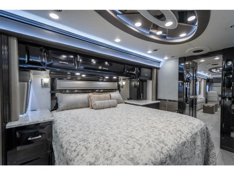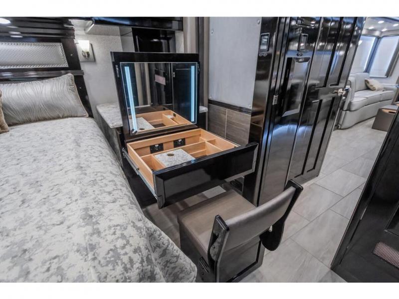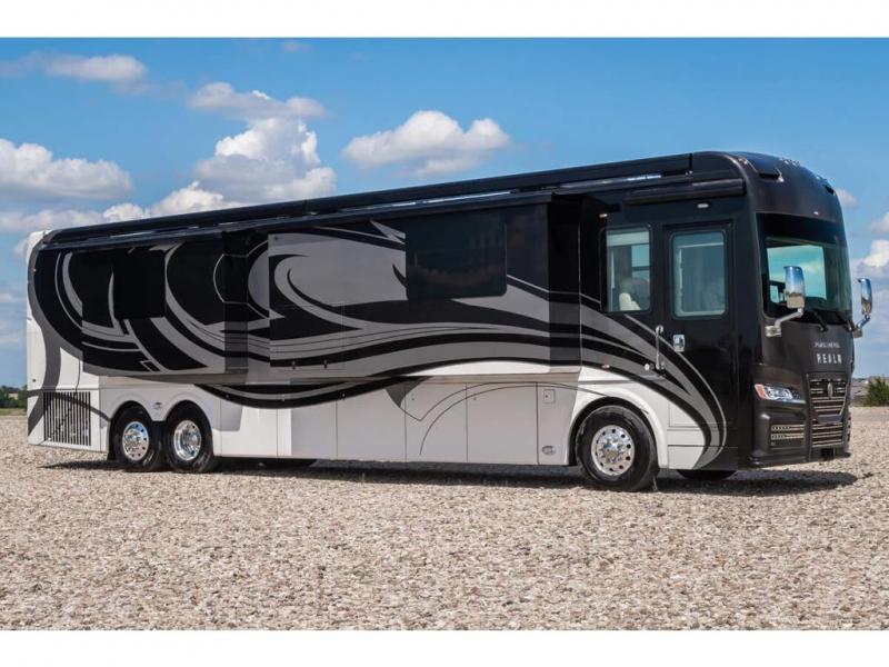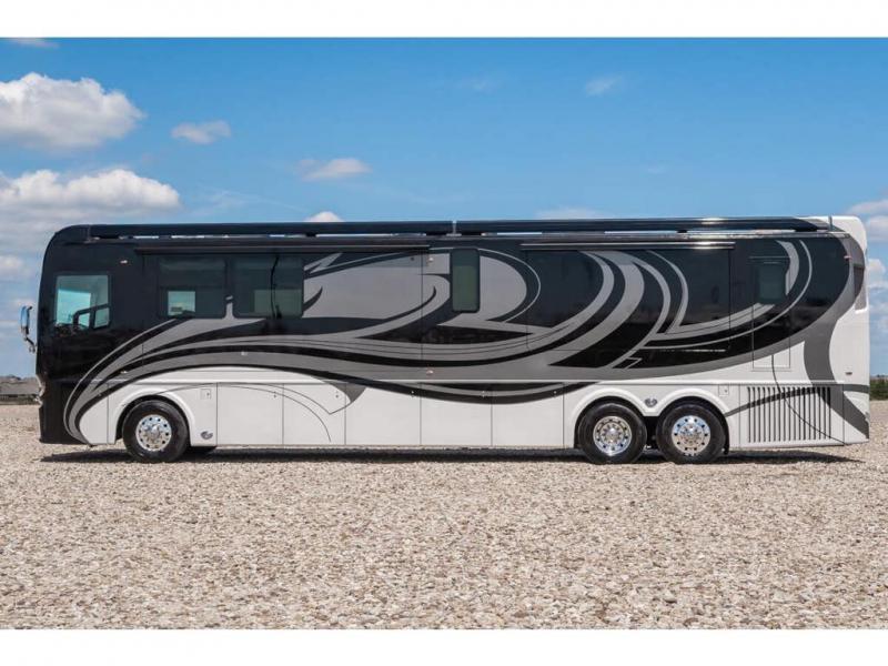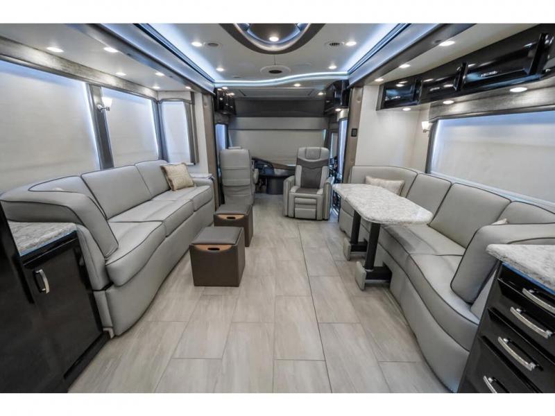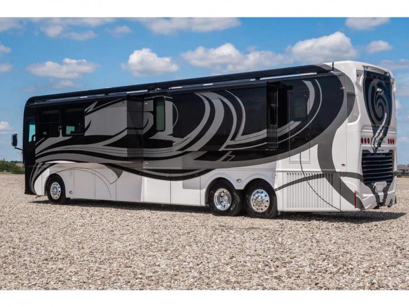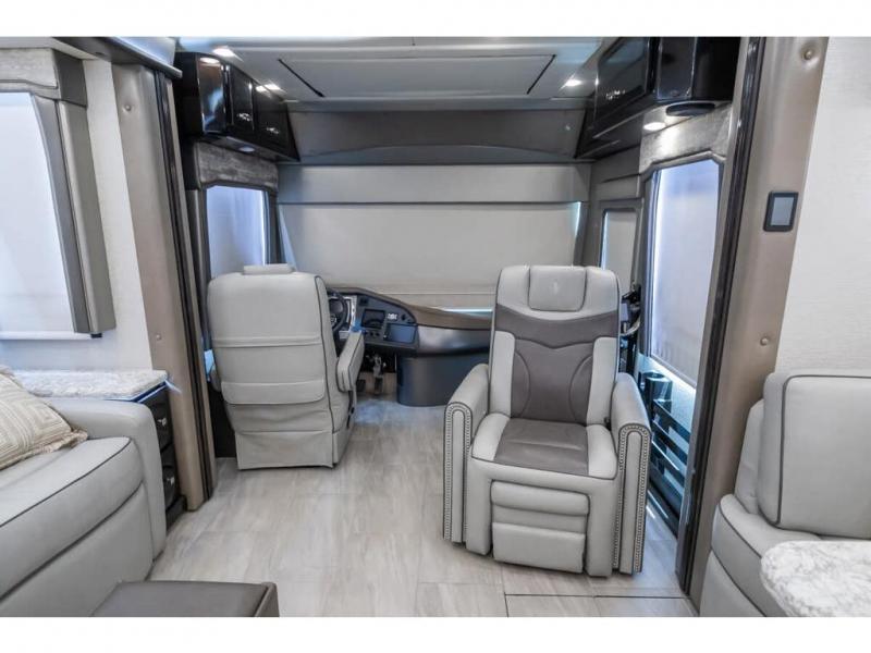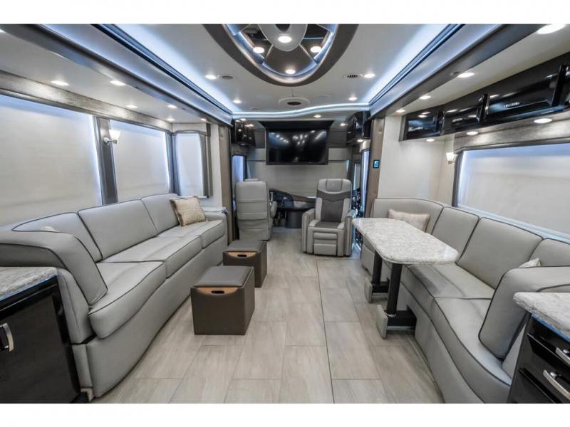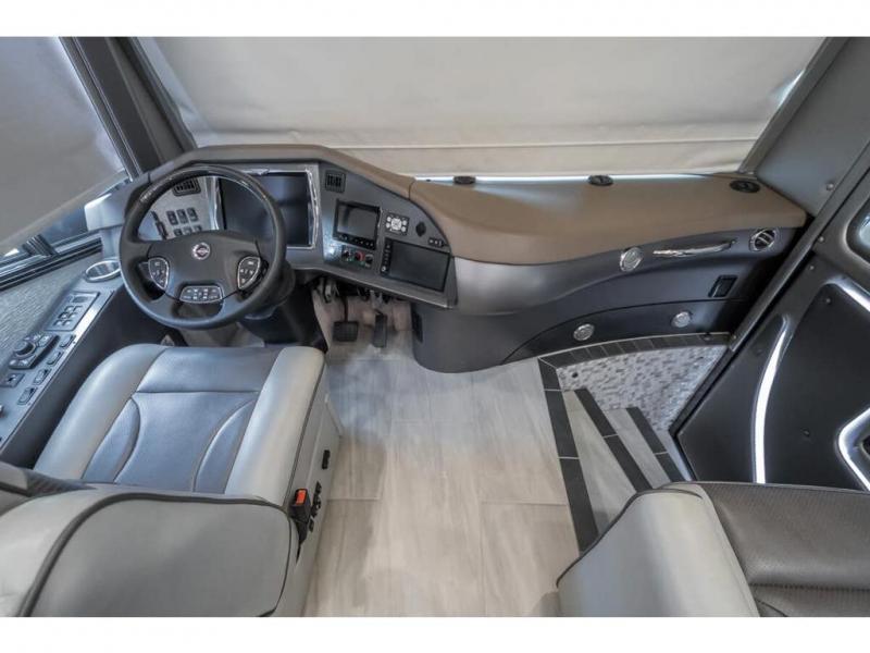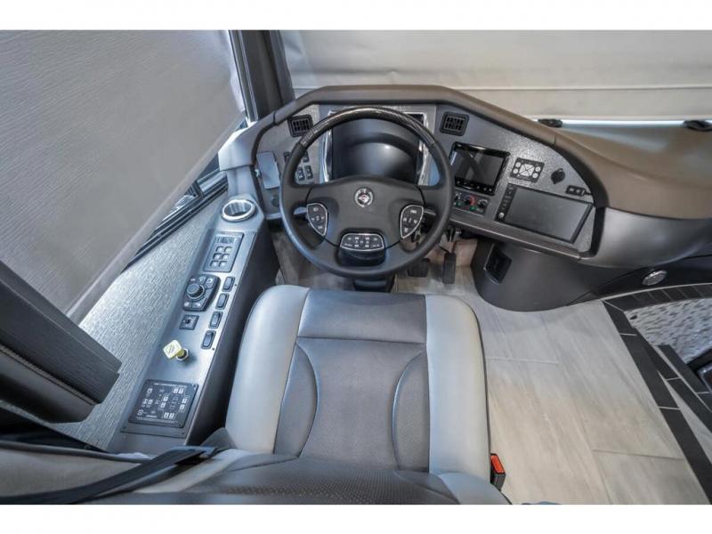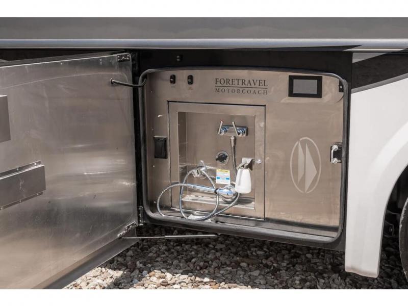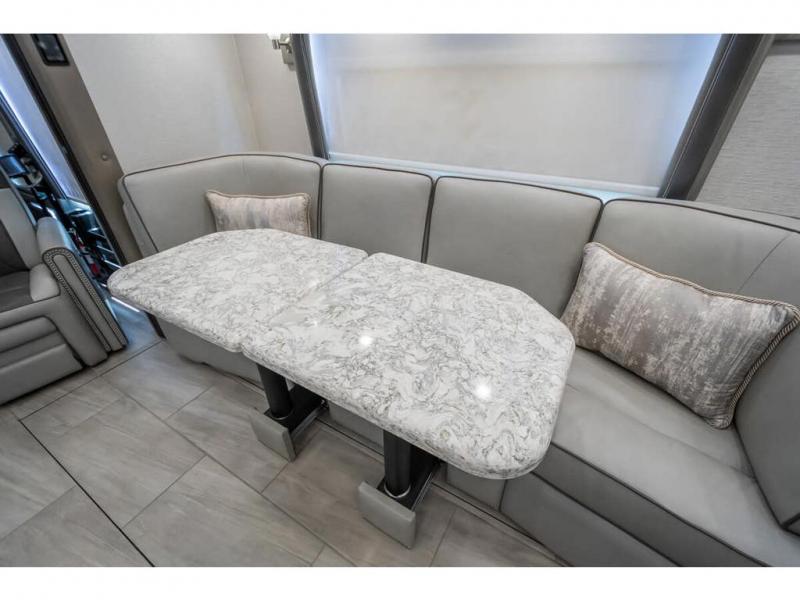 The 2024 Foretravel Realm FS6 is, not only, the premium luxury Motor-Coach on the market today, but the only coach in the industry built on Spartan's Premier K4 chassis offering incomparable ride, handling, and safety. This extraordinary motor coach is the Luxury Villa Master Suite (LVMS) floor plan featuring the incomparable Polished Stone and Cambridge interior décor package and is perfectly paired with the Armor exterior paint scheme with Diamond Pearl that you simply must see in person! The LVMS floorplan is unlike any luxury motor coach in the world; offering multiple living & dining arrangements highlighted by the dual power-adjustable dinette tables, an extra-long lounger, and a master suite arrangement that sets the LVMS apart from all other floor plans. You will find spacious wardrobes, a lavish custom-built vanity and chair, extra-large nightstands, convenient washer/dryer to closet accessibility, and exceptional storage throughout this one-of-a-kind floor plan. You will also find a multi-function digital dash and instrumentation display system, the Premier Steer adjustable driver's assist system, a Navigation system with in-dash and additional passenger side monitor, Total Coach Monitoring System, tire pressure sensors, beautiful tile floors and back-splashes, quartz counter tops throughout, ultra-high-end appliances, LED accent lighting throughout, a beautiful curved step entry way, Braun extra heavy duty power entrance step, a designer entry door with LED accent lighting, iPad launch system, 4K TVs where applicable, upgraded cab stereo and sub-woofer, heated and cooled pilot and co-pilot seats, recessed and upgraded ceiling features in the galley, recessed cook top, Mobile Eye Collision Avoidance System, a "Bird's Eye View" camera system for the ultimate in coach visibility along with an additional 3-camera coach monitoring system with power rear camera, dual integrated power awnings, power entry door awning, exterior entertainment center, (2) electric sliding cargo trays, exterior freezer, full coach and multi-color LED ground effect lighting package, Xtreme-Schemes full body paint exterior with Armor-Coat sprayed protection below windshield, all new chrome grill and accent package, (2) 2800 watt inverters, electric floor heat, (2) solar panels, dishwasher drawer, HD satellite and WiFi Ranger. The Realm FS6 rides exclusively on the all-new Spartan® K4 chassis. The K4 is not only massive in stature but boasts a best-in-class 20,000 lb. Independent Front Suspension, Premier Steer (adjustable steering control system), a Torqued-Box Frame, a passive steering rear tag axle for incomparable handling and maneuverability as well as the Spartan’s Advanced Protection System® which includes OnGuard Active™ a collision mitigation system with adaptive cruise control, Cummins Connected Diagnostics™, electronic stability control, and automatic traction control. You will know instantly, once behind the wheel of a Realm FS6, that this chassis is truly a cut above all other luxury motor coach chassis. It is powered by a Cummins X15 605HP diesel. You will also find additional advanced safety features on a Realm FS6 including a fire suppression system for the engine, Tyron Bead-Lock wheel safety bands, and steel construction rather than an aluminum cage found in the competition. You will also enjoy the ultimate in slide-out room fit and finish. These slides are undoubtedly head and shoulders above the competition. They feature pneumatic seals that provide a literal airtight seal completely around the entire slide-out room regardless of slide position for the premium in fit, finish, and function. They also feature a power drop-down flooring system that gives the Realm not only a flat-floor when extended, but a true flat floor when retracted as well. (No carpet lips, uneven floor surfaces, damaging rollers, poorly sealed rubber gaskets, etc.) The Realm also features a flat floor bedroom to master bath transition.