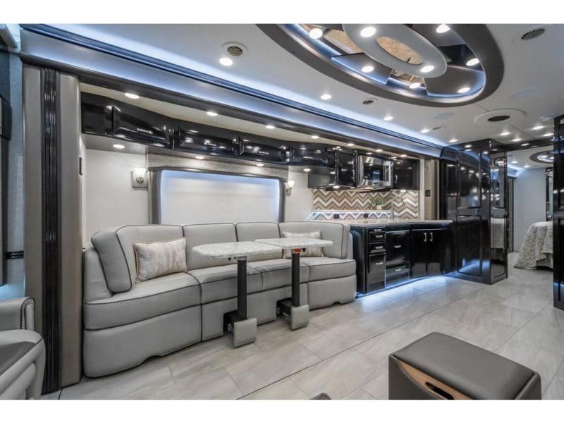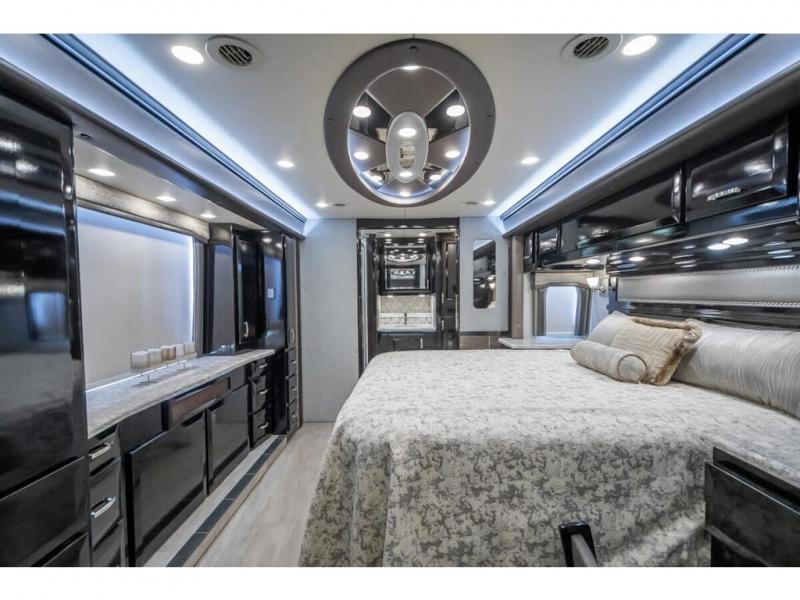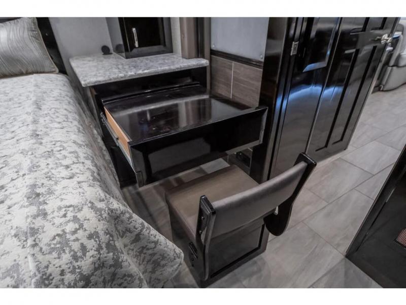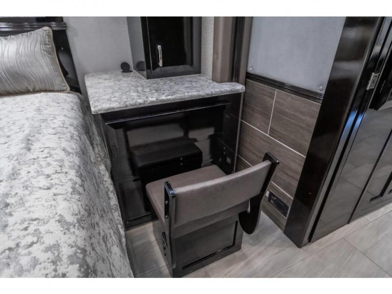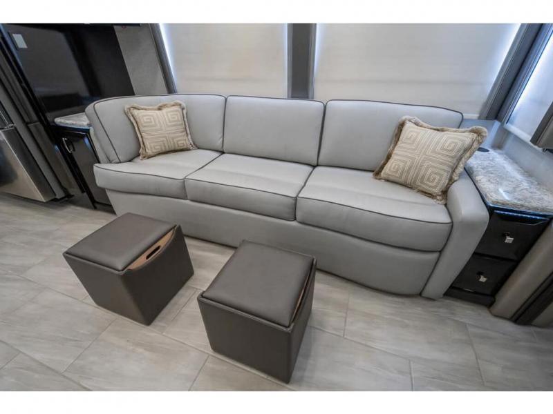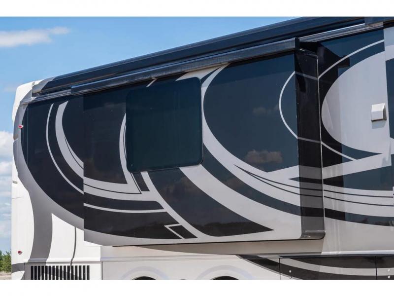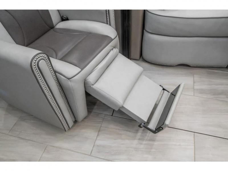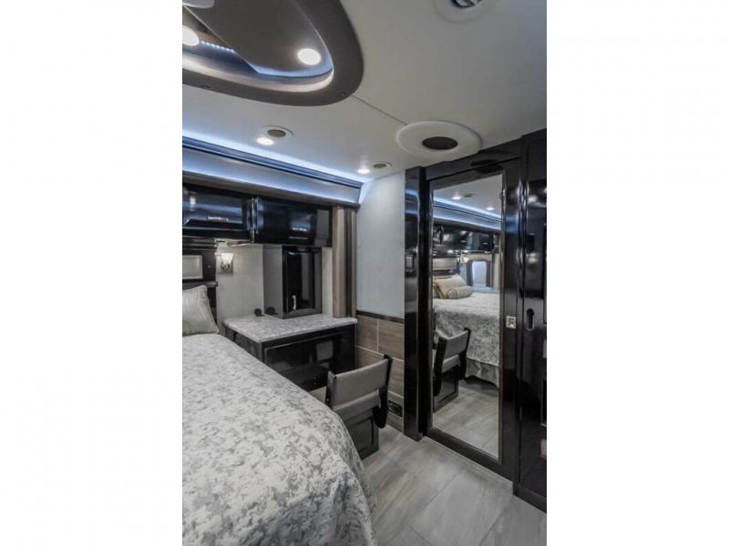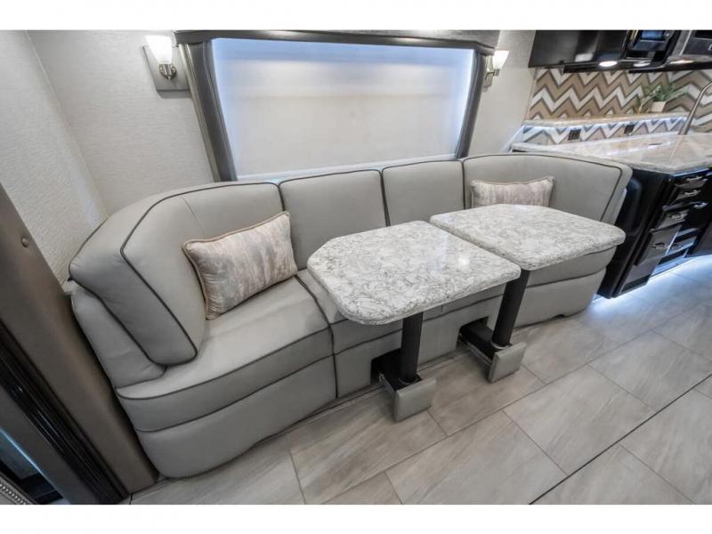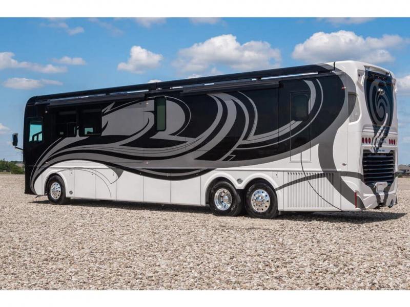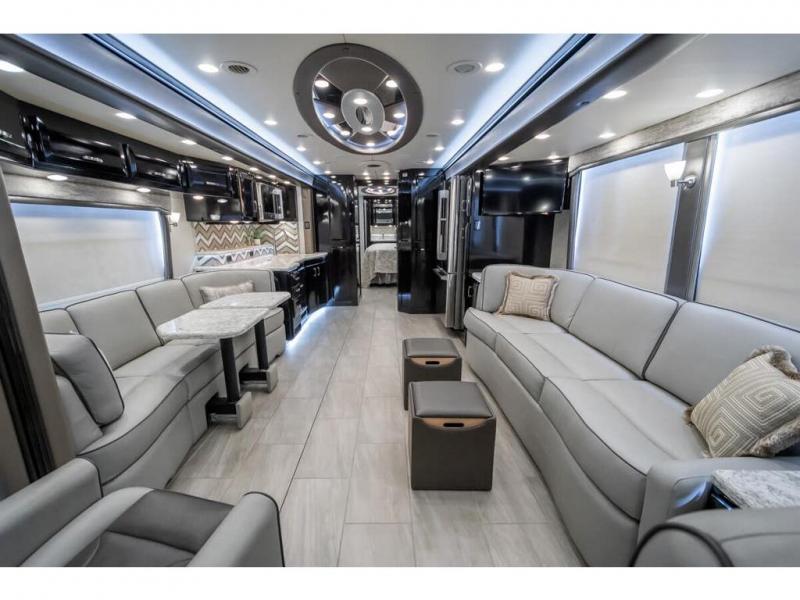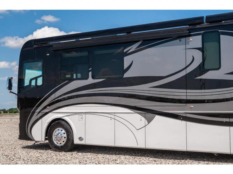 The 2024 Foretravel Realm FS6 is, not only, the premium luxury Motor-Coach on the market today, but the only coach in the industry built on Spartan's Premier K4 chassis offering incomparable ride, handling, and safety. This extraordinary motor coach is the Luxury Villa Master Suite (LVMS) floor plan featuring the incomparable Polished Stone and Cambridge interior décor package and is perfectly paired with the Armor exterior paint scheme with Diamond Pearl that you simply must see in person! The LVMS floorplan is unlike any luxury motor coach in the world; offering multiple living & dining arrangements highlighted by the dual power-adjustable dinette tables, an extra-long lounger, and a master suite arrangement that sets the LVMS apart from all other floor plans. You will find spacious wardrobes, a lavish custom-built vanity and chair, extra-large nightstands, convenient washer/dryer to closet accessibility, and exceptional storage throughout this one-of-a-kind floor plan. You will also find a multi-function digital dash and instrumentation display system, the Premier Steer adjustable driver's assist system, a Navigation system with in-dash and additional passenger side monitor, Total Coach Monitoring System, tire pressure sensors, beautiful tile floors and back-splashes, quartz counter tops throughout, ultra-high-end appliances, LED accent lighting throughout, a beautiful curved step entry way, Braun extra heavy duty power entrance step, a designer entry door with LED accent lighting, iPad launch system, 4K TVs where applicable, upgraded cab stereo and sub-woofer, heated and cooled pilot and co-pilot seats, recessed and upgraded ceiling features in the galley, recessed cook top, Mobile Eye Collision Avoidance System, a "Bird's Eye View" camera system for the ultimate in coach visibility along with an additional 3-camera coach monitoring system with power rear camera, dual integrated power awnings, power entry door awning, exterior entertainment center, (2) electric sliding cargo trays, exterior freezer, full coach and multi-color LED ground effect lighting package, Xtreme-Schemes full body paint exterior with Armor-Coat sprayed protection below windshield, all new chrome grill and accent package, (2) 2800 watt inverters, electric floor heat, (2) solar panels, dishwasher drawer, HD satellite and WiFi Ranger. The Realm FS6 rides exclusively on the all-new Spartan® K4 chassis. The K4 is not only massive in stature but boasts a best-in-class 20,000 lb. Independent Front Suspension, Premier Steer (adjustable steering control system), a Torqued-Box Frame, a passive steering rear tag axle for incomparable handling and maneuverability as well as the Spartan’s Advanced Protection System® which includes OnGuard Active™ a collision mitigation system with adaptive cruise control, Cummins Connected Diagnostics™, electronic stability control, and automatic traction control. You will know instantly, once behind the wheel of a Realm FS6, that this chassis is truly a cut above all other luxury motor coach chassis. It is powered by a Cummins X15 605HP diesel. You will also find additional advanced safety features on a Realm FS6 including a fire suppression system for the engine, Tyron Bead-Lock wheel safety bands, and steel construction rather than an aluminum cage found in the competition. You will also enjoy the ultimate in slide-out room fit and finish. These slides are undoubtedly head and shoulders above the competition. They feature pneumatic seals that provide a literal airtight seal completely around the entire slide-out room regardless of slide position for the premium in fit, finish, and function. They also feature a power drop-down flooring system that gives the Realm not only a flat-floor when extended, but a true flat floor when retracted as well. (No carpet lips, uneven floor surfaces, damaging rollers, poorly sealed rubber gaskets, etc.) The Realm also features a flat floor bedroom to master bath transition.