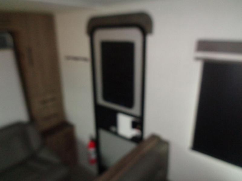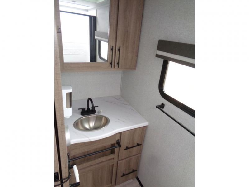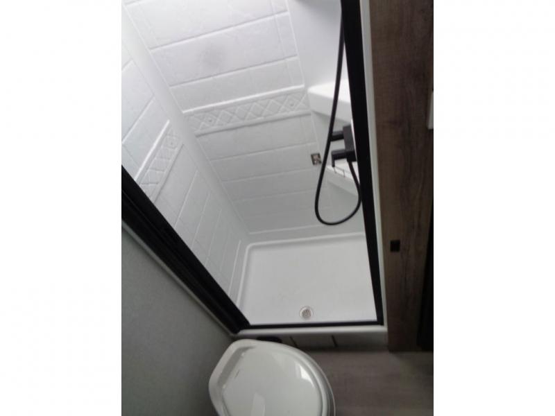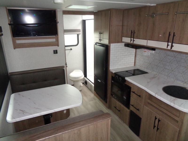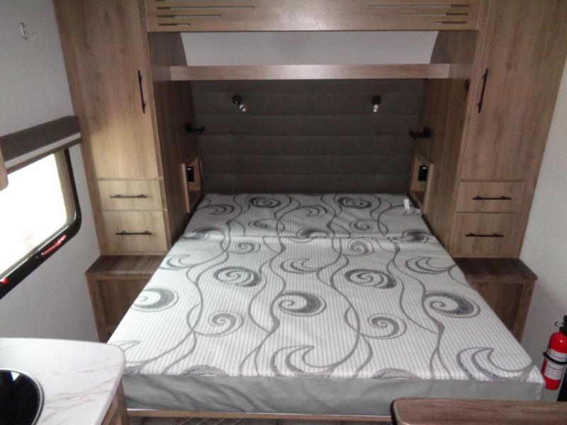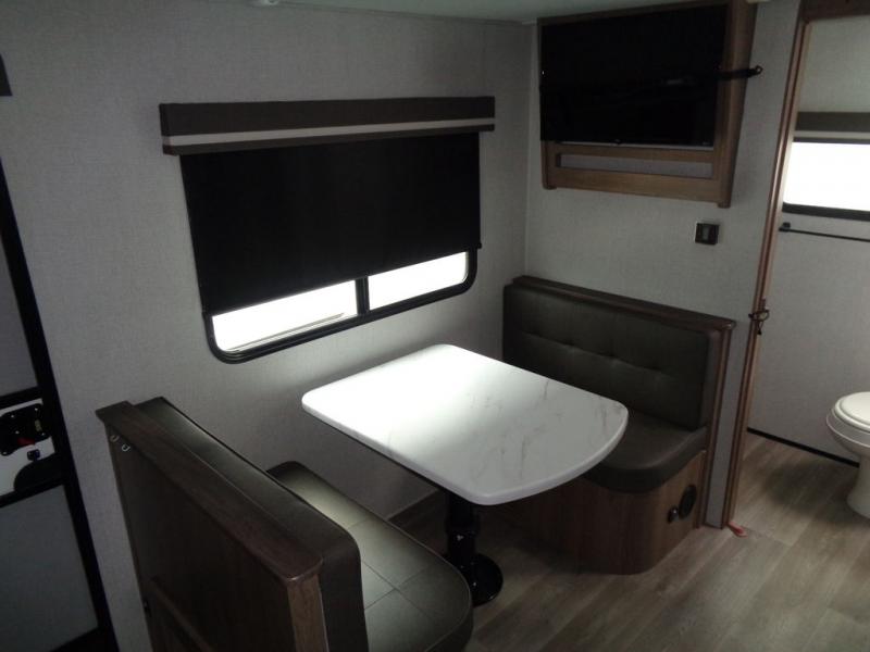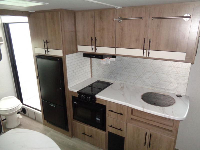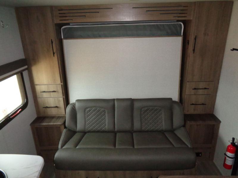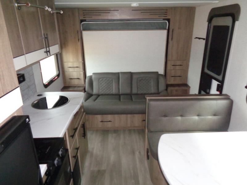 Start looking for your favorite campground to take this travel trailer to! After a fun day at the beach, you can rinse the sand out of your hair with the walk-in shower with a skylight in the full rear bathroom. Depending on what time you enter the unit will determine whether you see the Murphy bed or sofa with drawers underneath and wardrobes on either side of it. The booth dinette is not only great for enjoying meals prepared with the two burner cooktop or outside griddle, but also for transforming into an extra sleeping space!