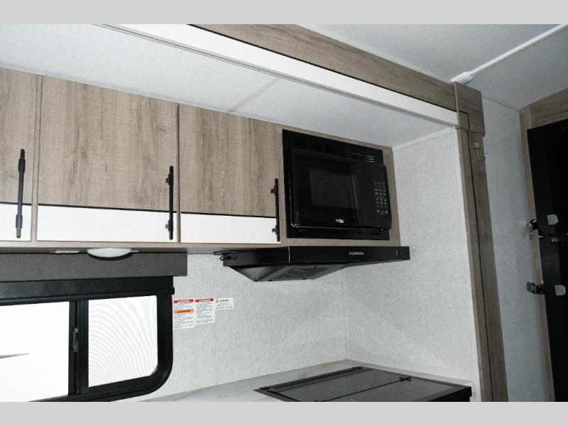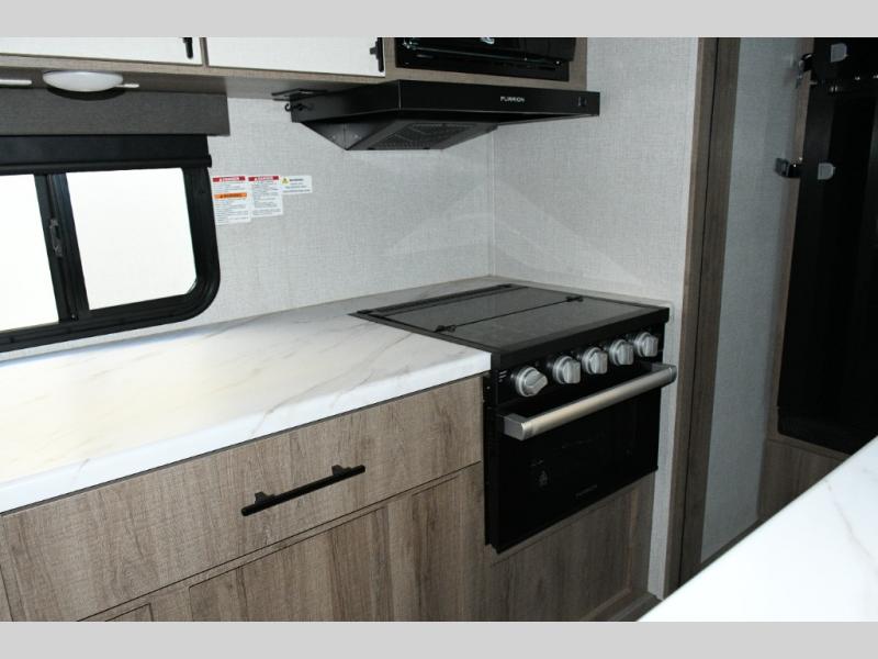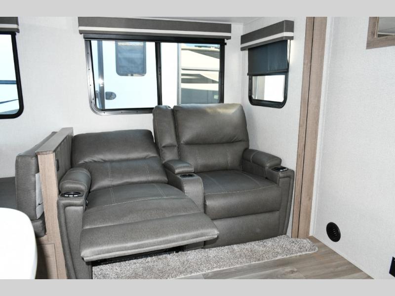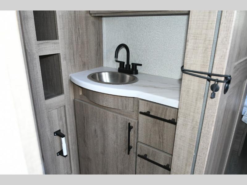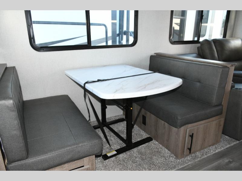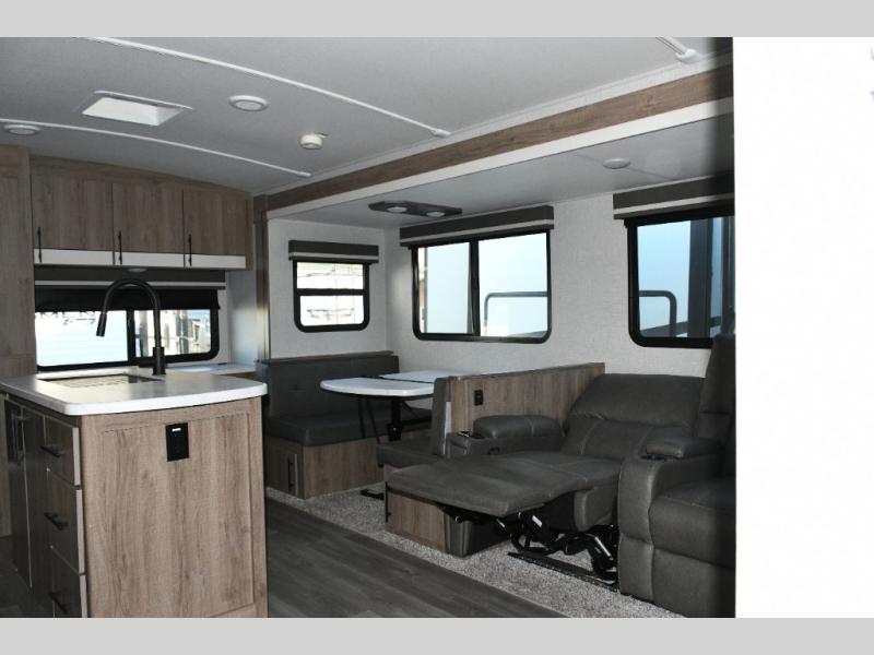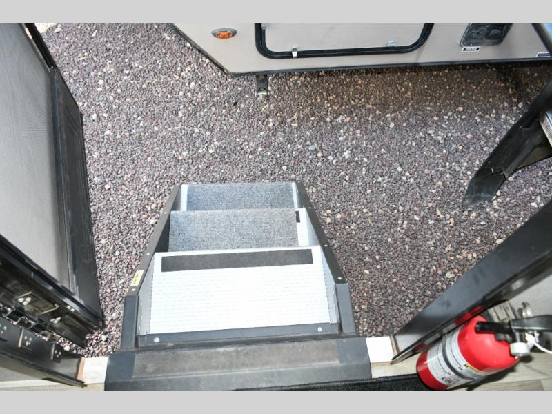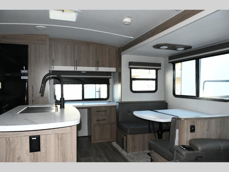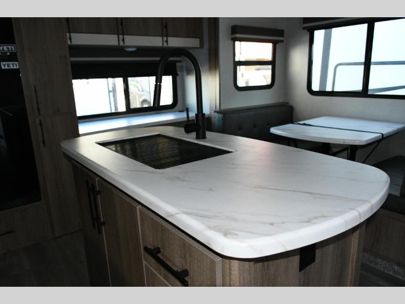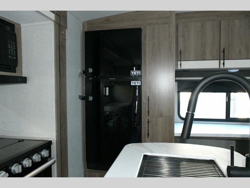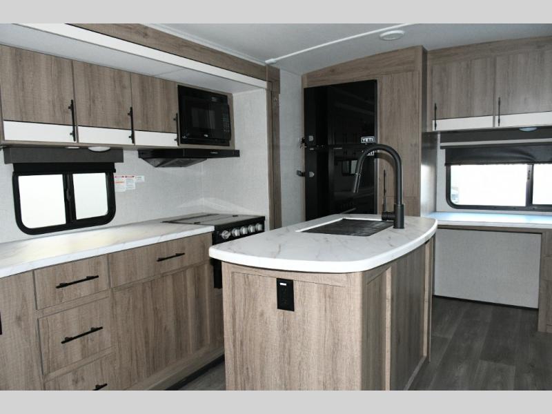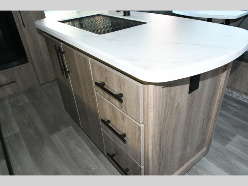 Meal prep is a joy in the spacious kitchen with its center island, deep stainless-steel sink, and ample counter space. You’ll appreciate the pantry for storage and the pet dish drawer, a thoughtful touch for your furry travel companions. Outside, the griddle and 1.6 cu. ft. refrigerator make outdoor cooking fun and easy.