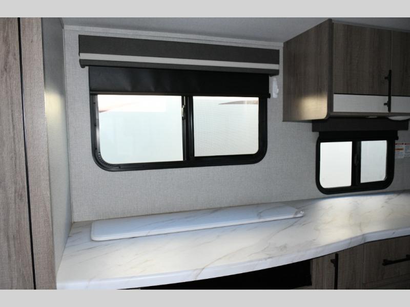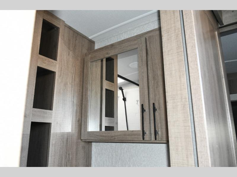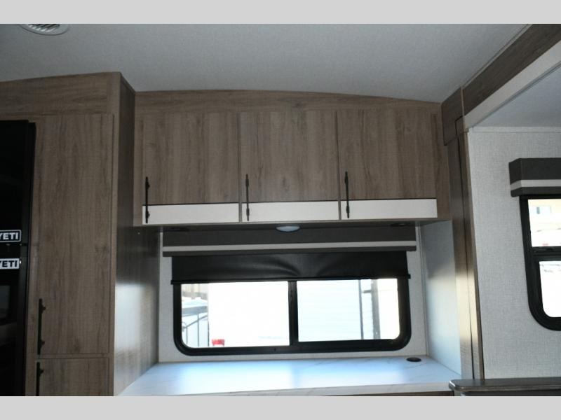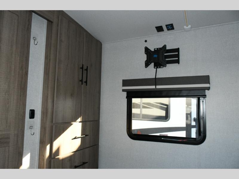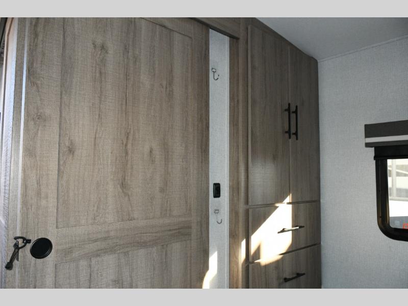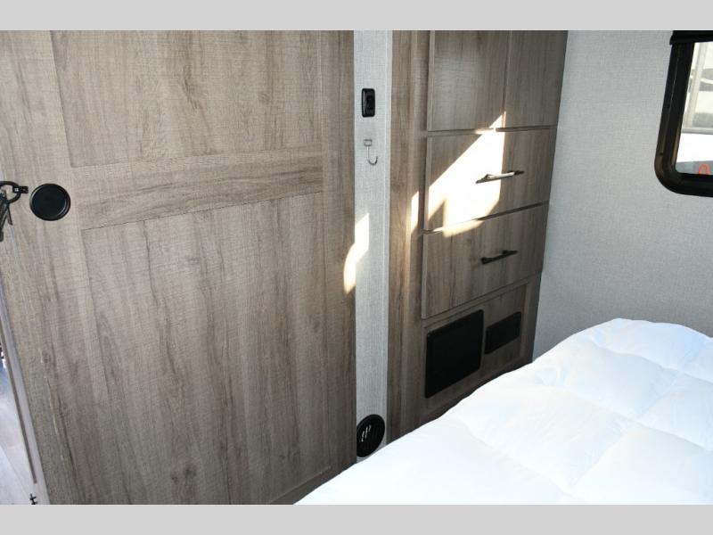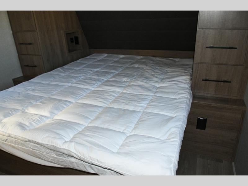 After a long day, retreat to the front private bedroom, complete with a 60" x 80" queen bed, overhead cabinets, and side wardrobes. It’s a cozy, peaceful space designed for true rest and relaxation.