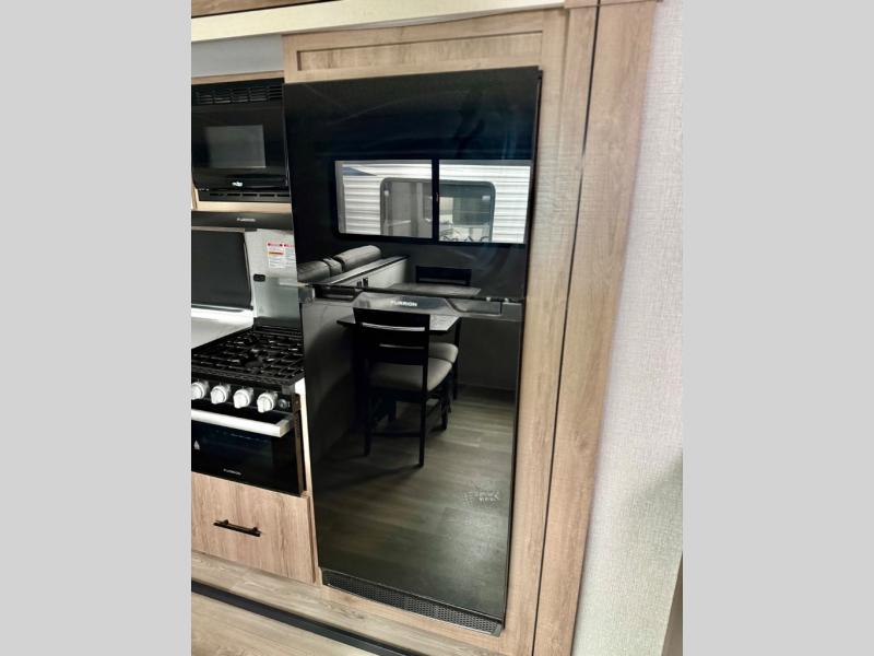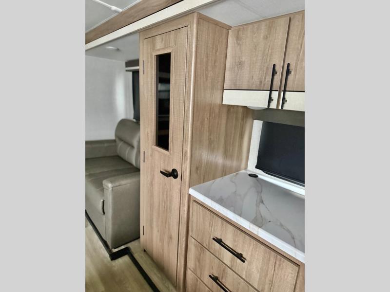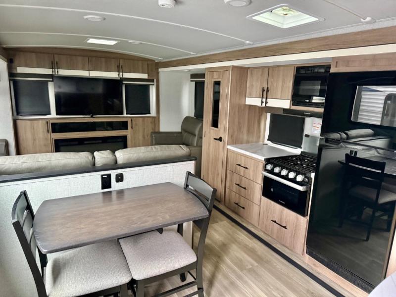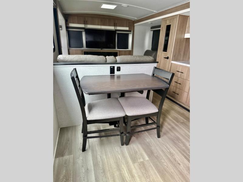 The rear living room on this Imagine travel trailer is just what you'll want when you're looking for a little down time. This room has opposing tri-fold sofas within slides, theater seating, a 50" LED HDTV, and a 48" fireplace. Another place that you can sit down at is the free-standing dinette. You can sit here with a fresh cup of coffee in the afternoon as you map out your hike for tomorrow. The kitchen offers you a microwave, a three-burner range with oven, a 10-cubic foot 12V double door refrigerator, and pantry to help you make meals, and there is a private bedroom with a 60" x 80" bed to rest on at the end of the day.