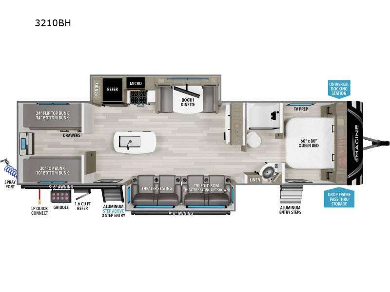 A great travel trailer for larger families or those that enjoy traveling with a few friends! This Imagine quad bunk model features two private bedrooms, with the master up front including a private entry/exit door just beyond a spacious walk-through bathroom that features a 30" x 36" shower with skylight to bring in more natural lighting each day, plus a toilet, sink and linen storage. In the kitchen, a nice island for food prep and cleaning up makes it easy to be part of the conversation in the room while you get meals ready for everyone. Speaking of food prep, how about the outside griddle and 1.6 cu. ft. refrigerator which is perfect for cooking outside, or for making late night snacks when all are enjoying the evening under the stars or in lawn chairs under one of two 9' 6" awnings with LED lighting. Your kids can bring along extra guests with the added sleeping that a quad bunk model provides. And, there is plenty of storage in the private bunkroom with drawers beneath for their things, plus a rear baggage door that is 42" x 22" for even more storage space for extra toys and gear.