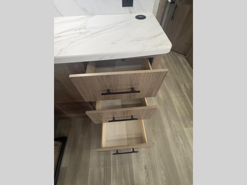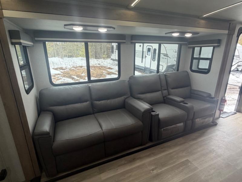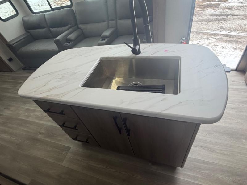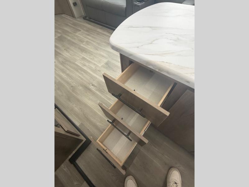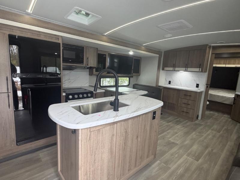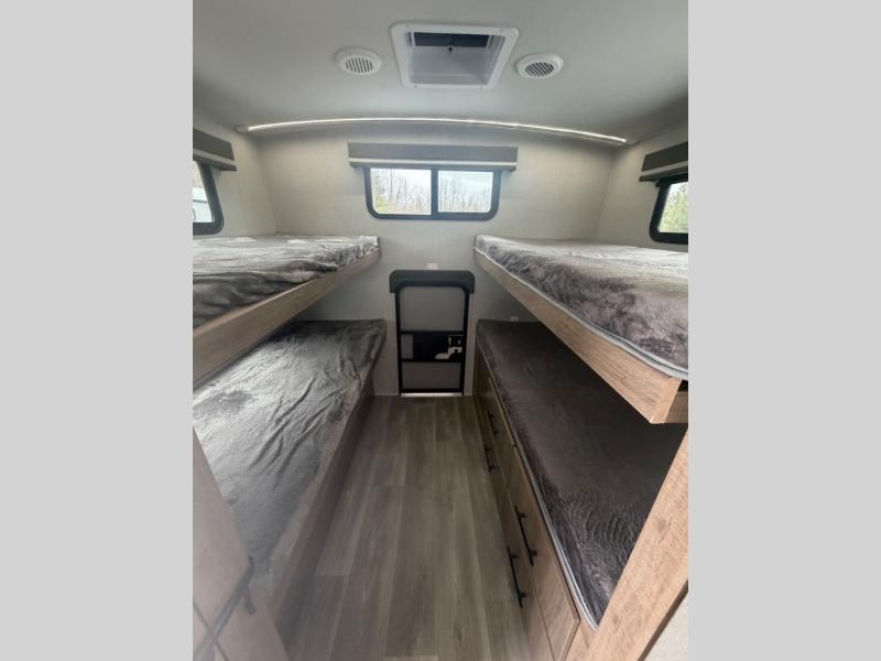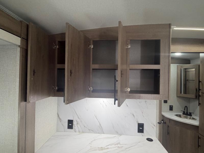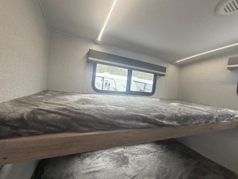 A great travel trailer for larger families or those that enjoy traveling with a few friends! This Imagine quad bunk model features two private bedrooms, with the master up front including a private entry/exit door just beyond a spacious walk-through bathroom that features a 30" x 36" shower with skylight to bring in more natural lighting each day, plus a toilet, sink and linen storage. In the kitchen, a nice island for food prep and cleaning up makes it easy to be part of the conversation in the room while you get meals ready for everyone. Speaking of food prep, how about the outside griddle and 1.6 cu. ft. refrigerator which is perfect for cooking outside, or for making late night snacks when all are enjoying the evening under the stars or in lawn chairs under one of two 9' 6" awnings with LED lighting. Your kids can bring along extra guests with the added sleeping that a quad bunk model provides. And, there is plenty of storage in the private bunkroom with drawers beneath for their things, plus a rear baggage door that is 42" x 22" for even more storage space for extra toys and gear.