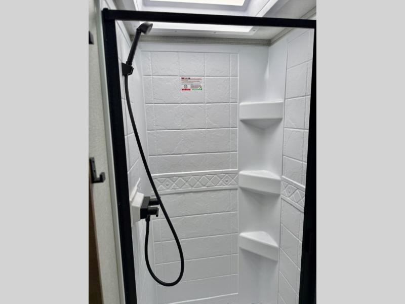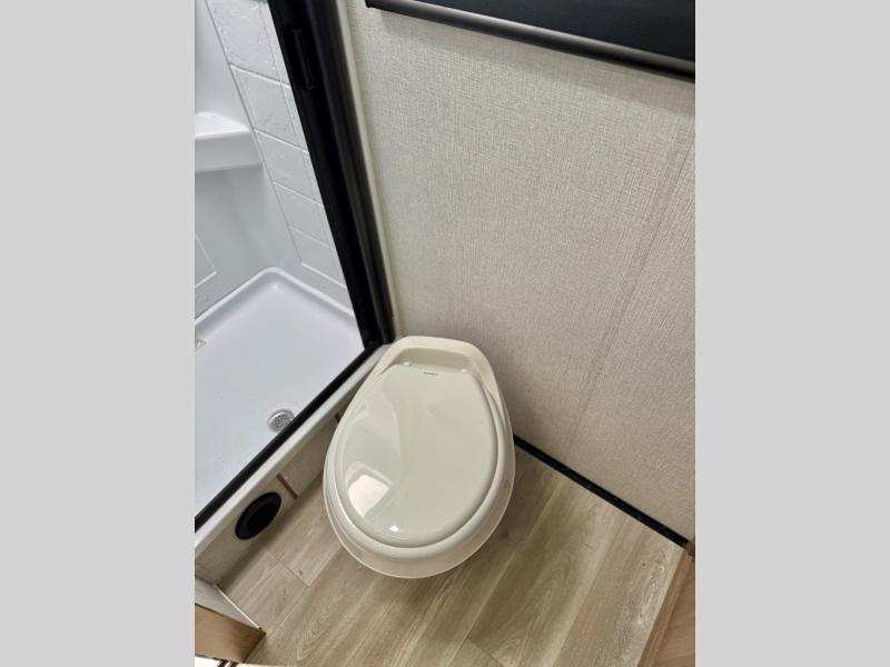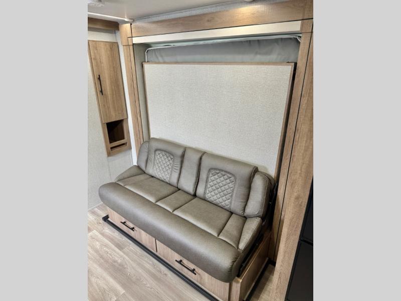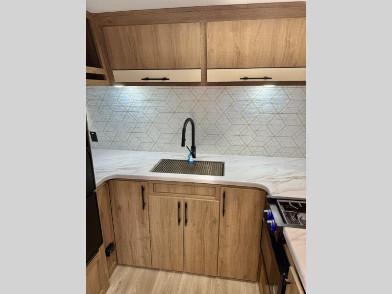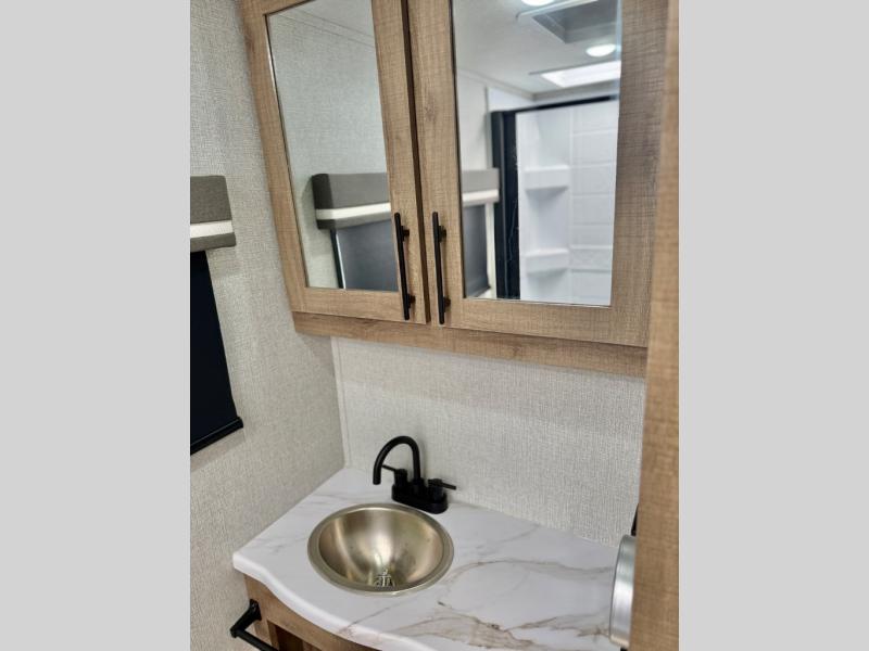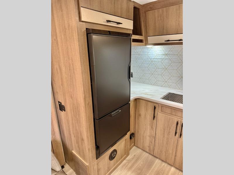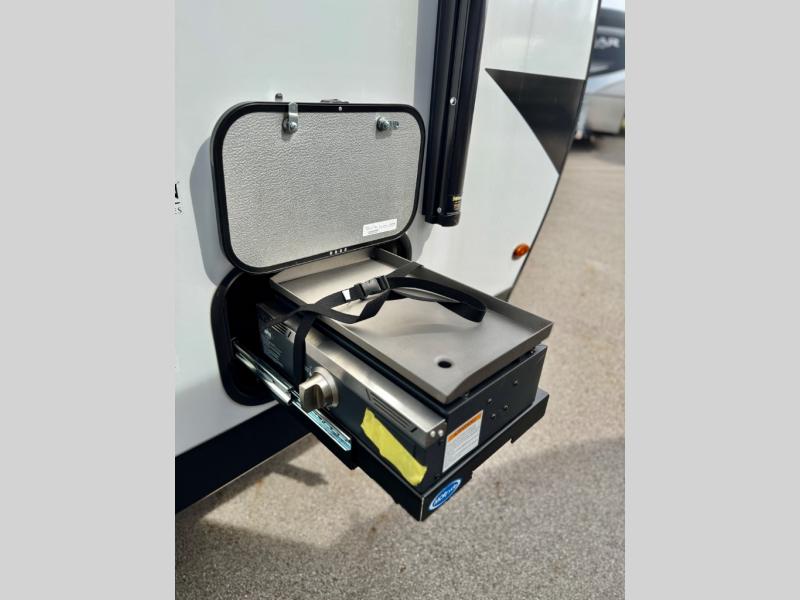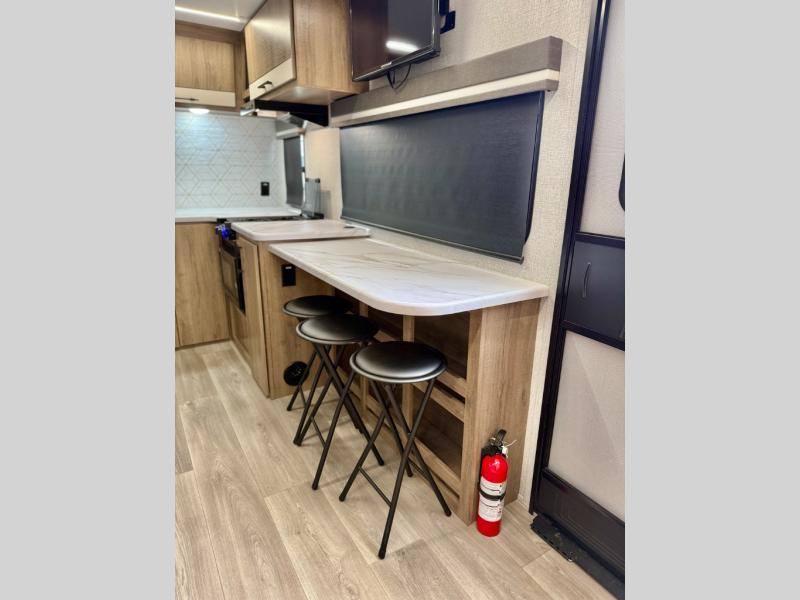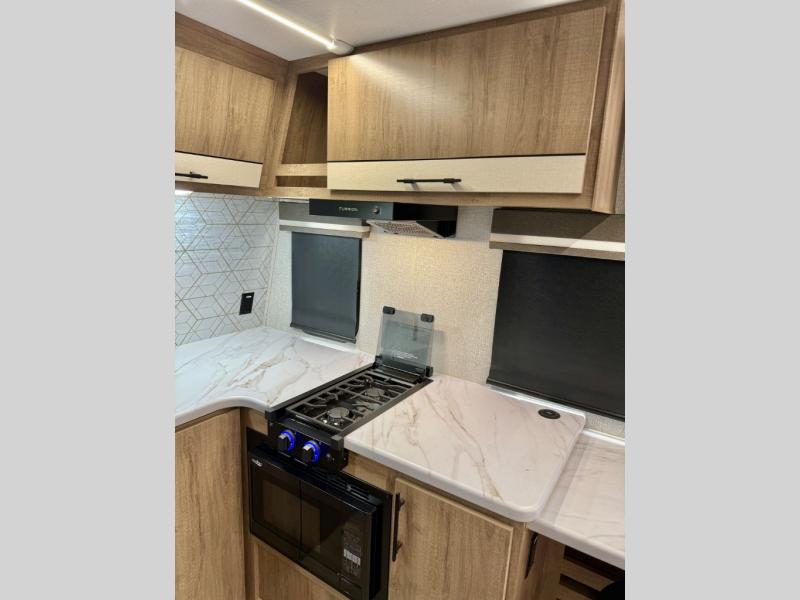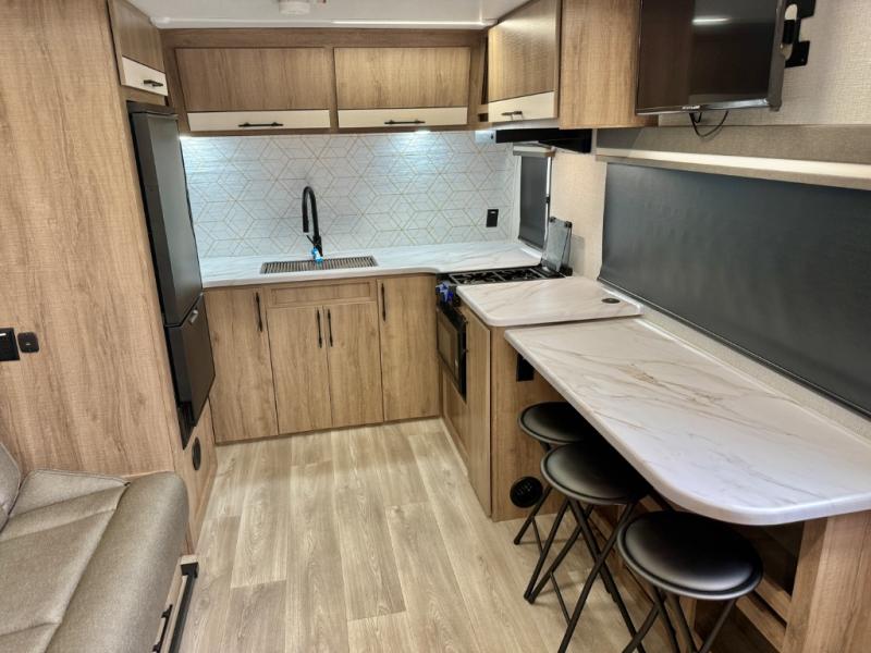 This simple, but cozy travel trailer is sure to meet all of your camping needs. There is a full rear bath with a shower skylight and wardrobe to keep your things tidy. The front kitchen includes ample counter space to prep meals and a bar tabletop dinette with three stools you are sure to love. A two burner cooktop also comes standard, along with a convection microwave, and an exterior griddle for when you want to cook outdoors under the 12' awning! The versatile Murphy bed provides seating and sleeping space each day, and the hi-definition LED TV across from the bed will let you watch movies at night.