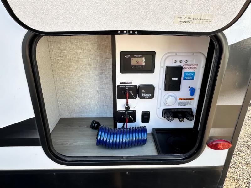 This simple, but cozy travel trailer is sure to meet all of your camping needs. There is a full rear bath with a shower skylight and wardrobe to keep your things tidy. The front kitchen includes ample counter space to prep meals and a bar tabletop dinette with three stools you are sure to love. A two burner cooktop also comes standard, along with a convection microwave, and an exterior griddle for when you want to cook outdoors under the 12' awning! The versatile Murphy bed provides seating and sleeping space each day, and the hi-definition LED TV across from the bed will let you watch movies at night.