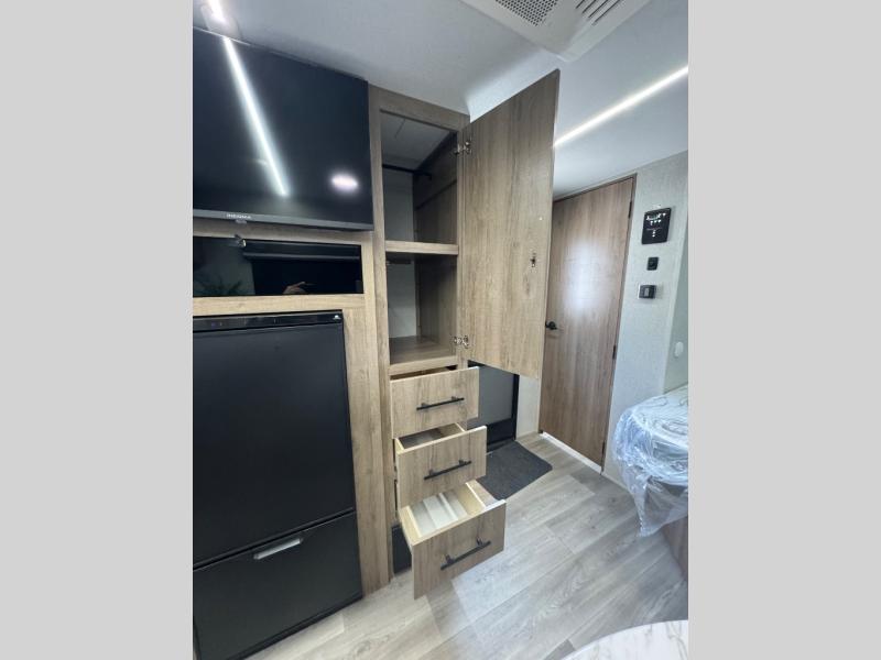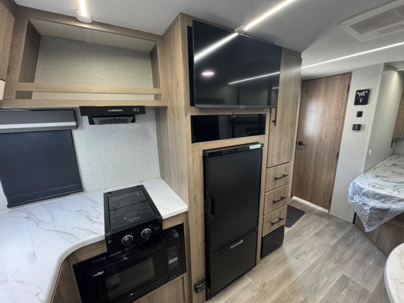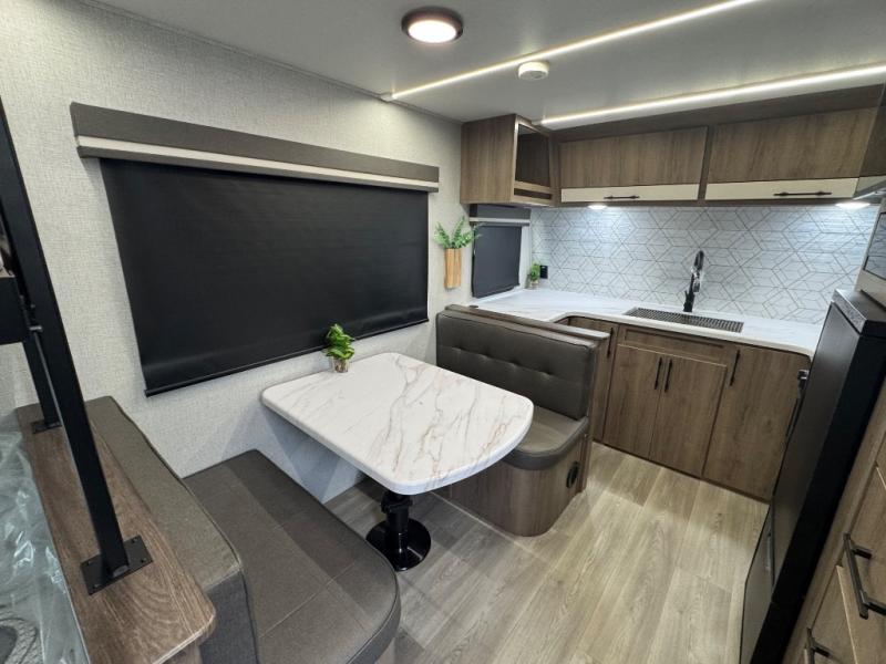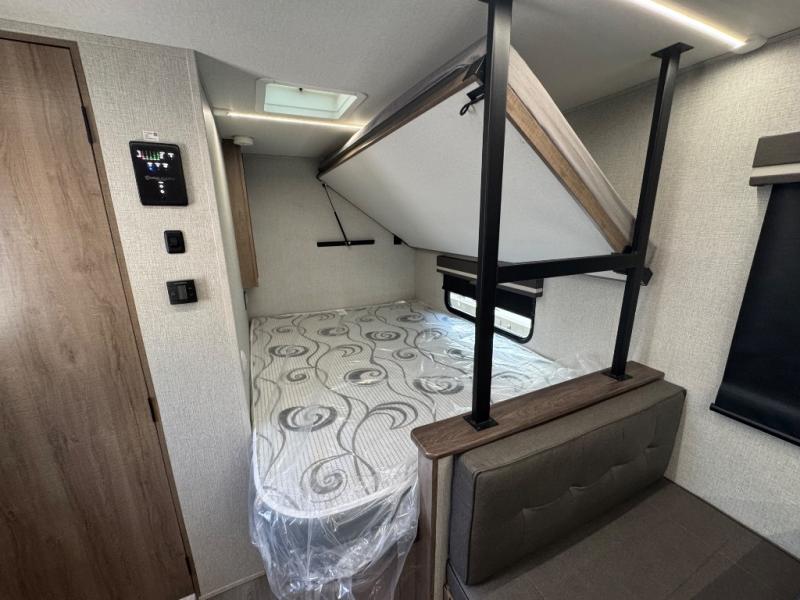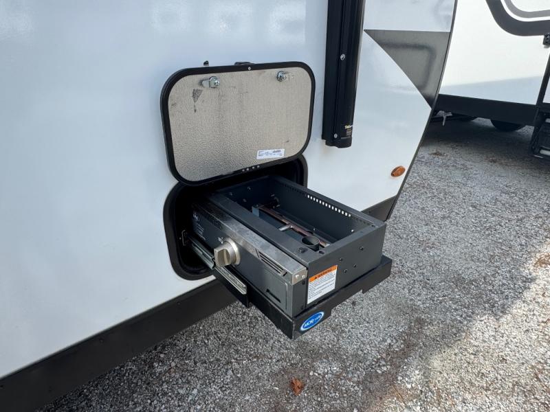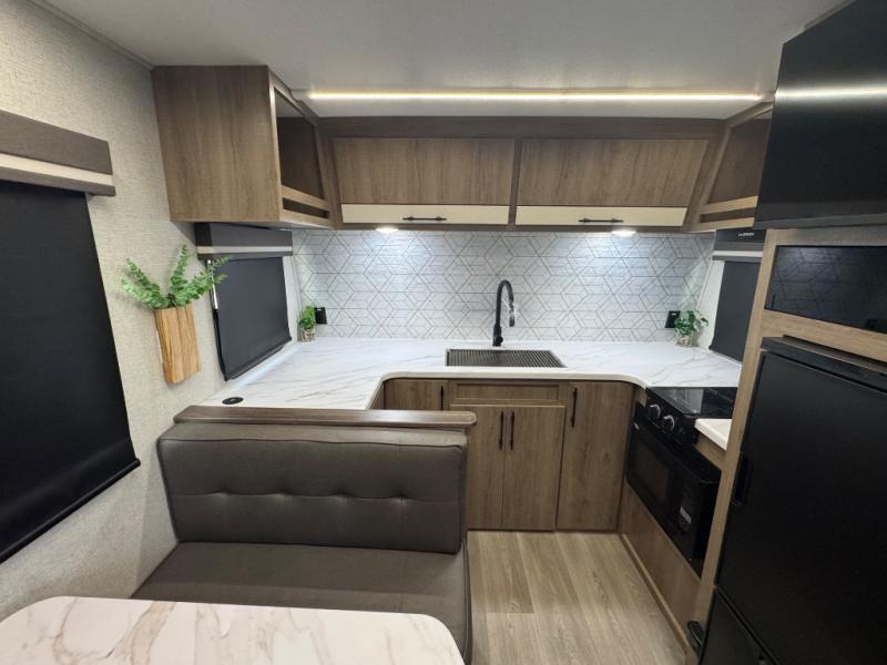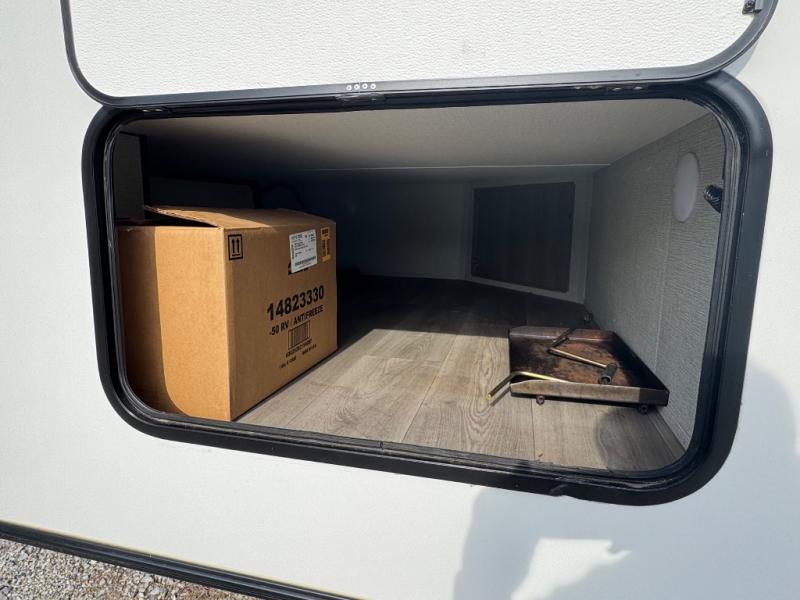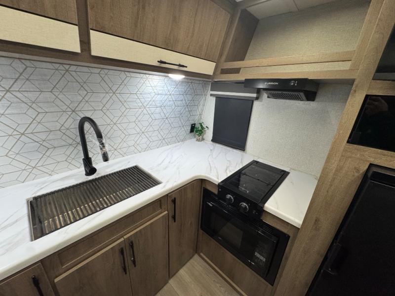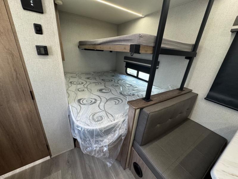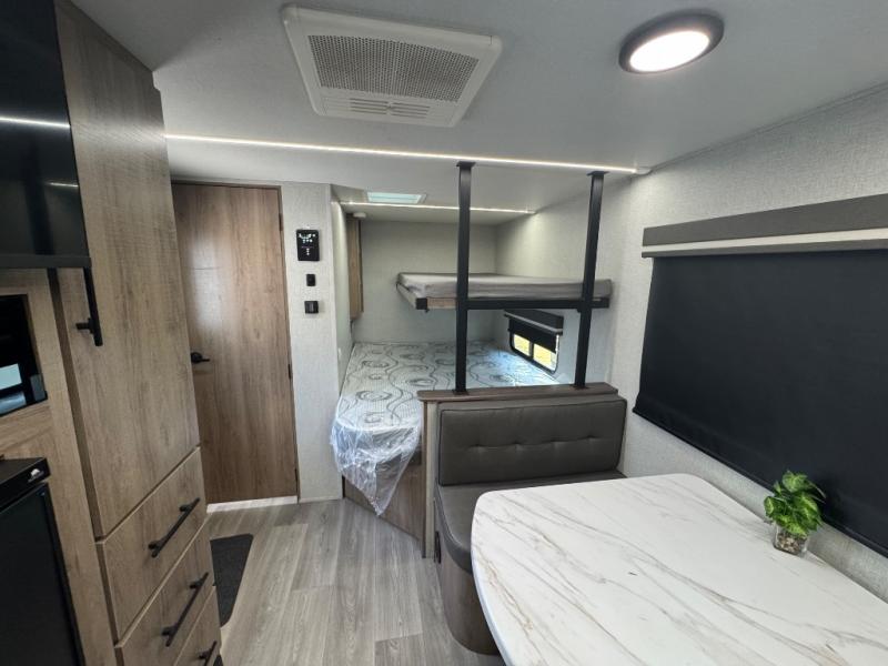 Your small family or group will have a fun time camping in this travel trailer! There is a queen bed below a 40" x 80" flip top bunk above it for comfortable sleeping spaces. You could even transform the booth dinette into an extra sleeping space when you aren't using it to enjoy a meal prepared with the front kitchen. You could even grill up some burgers on the outside griddle. Underneath the queen bed is a storage portal and the exterior has baggage doors to keep all of your gear out of the way. A unique feature on this model is the full bath with a flip-up bath sink that will provide more space when you're getting dressed!