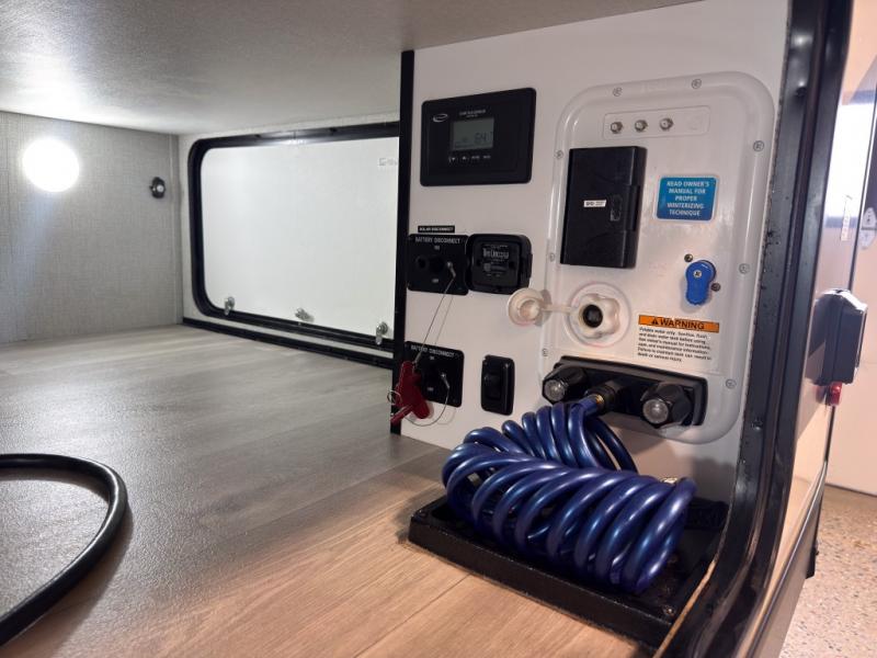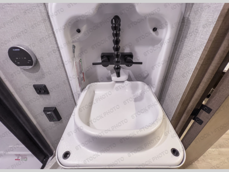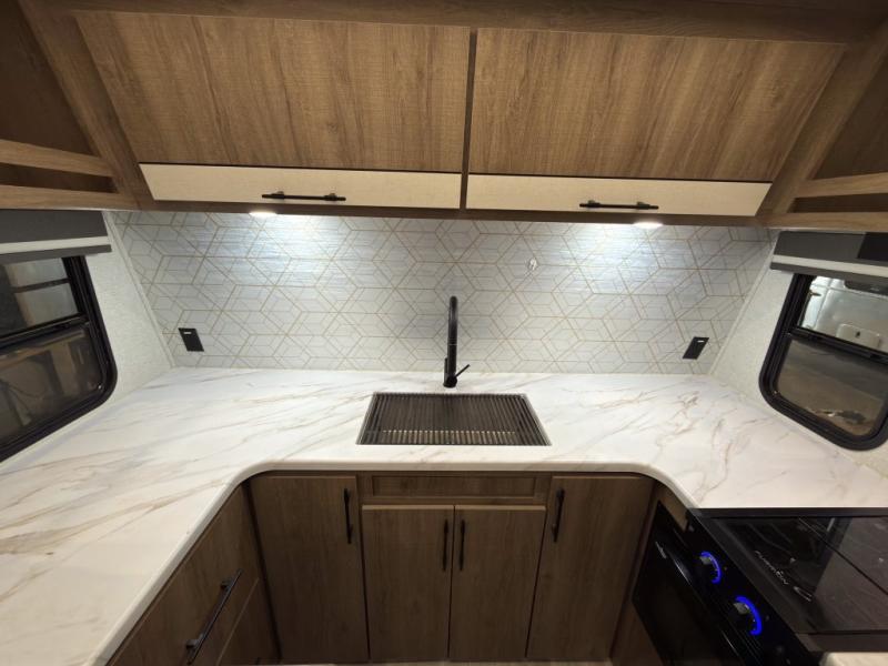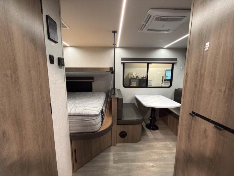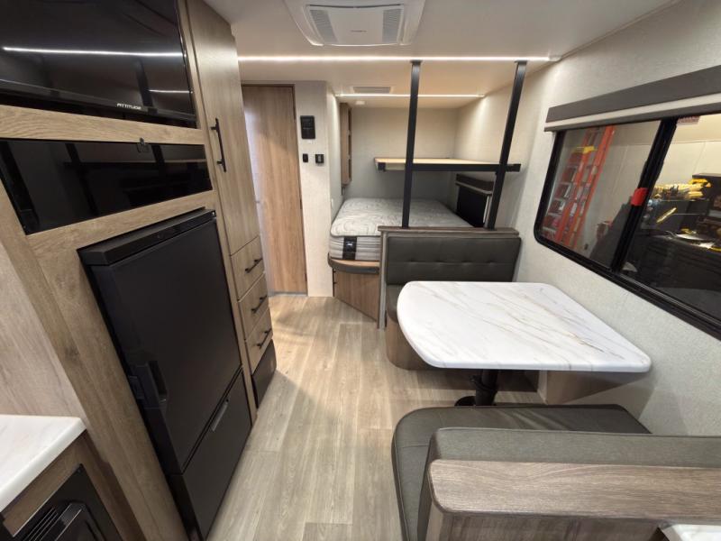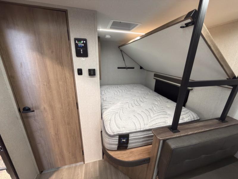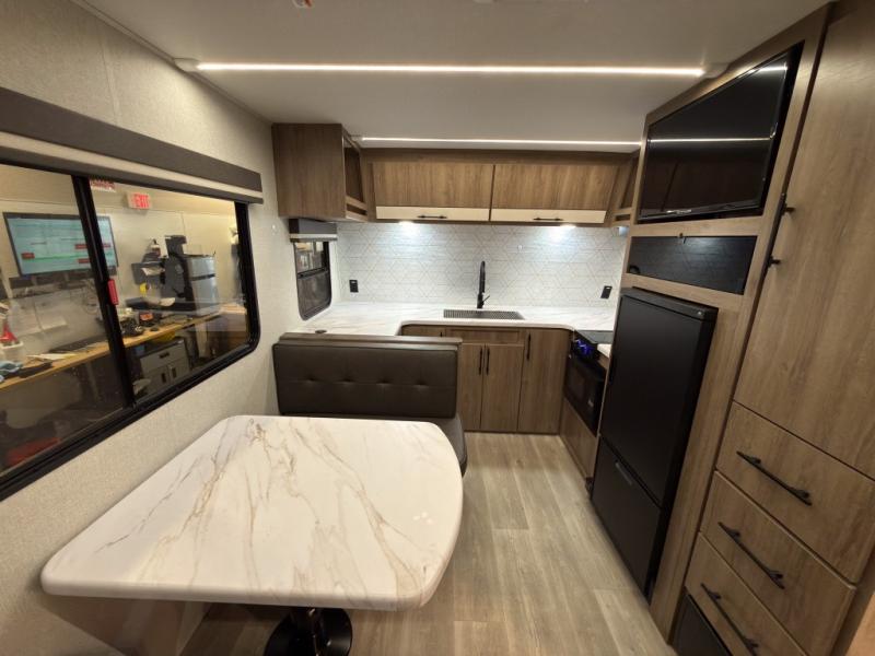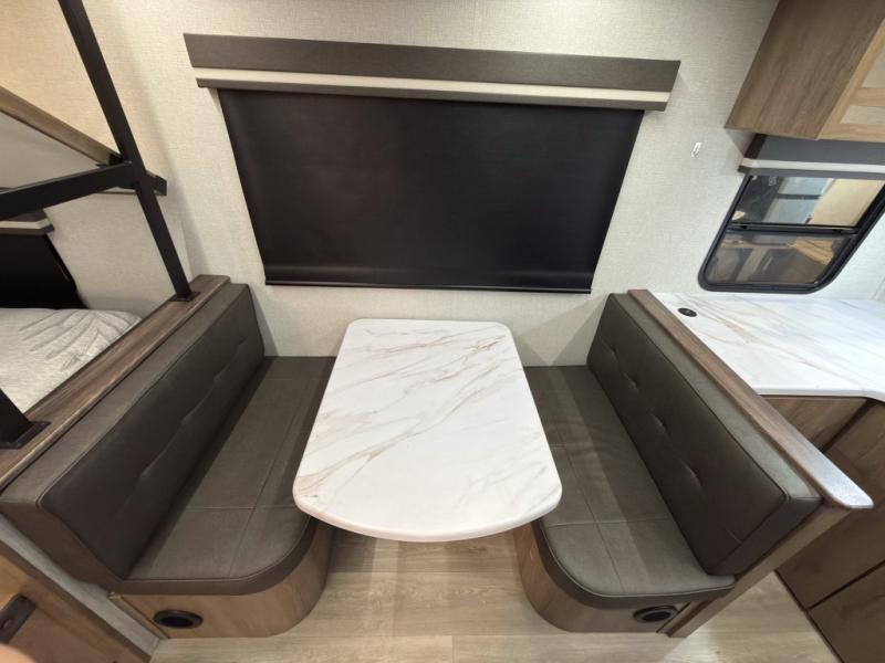 Your small family or group will have a fun time camping in this travel trailer! There is a queen bed below a 40" x 80" flip top bunk above it for comfortable sleeping spaces. You could even transform the booth dinette into an extra sleeping space when you aren't using it to enjoy a meal prepared with the front kitchen. You could even grill up some burgers on the outside griddle. Underneath the queen bed is a storage portal and the exterior has baggage doors to keep all of your gear out of the way. A unique feature on this model is the full bath with a flip-up bath sink that will provide more space when you're getting dressed!