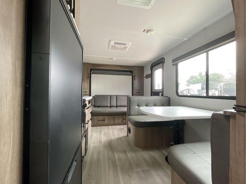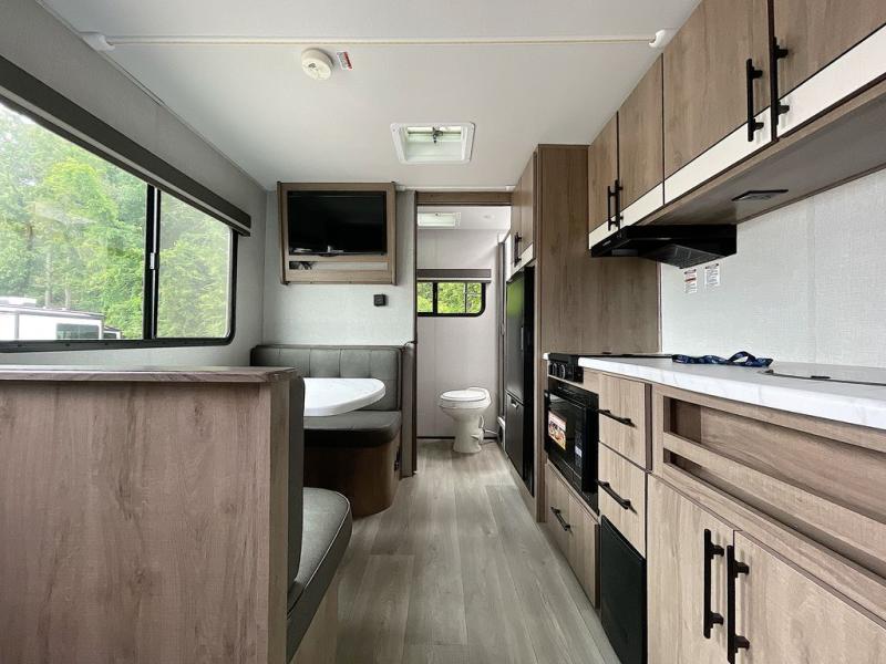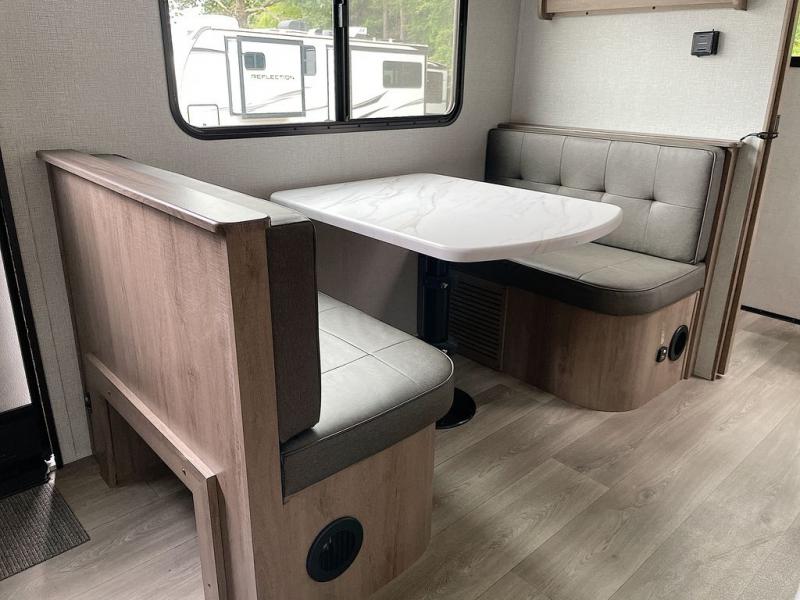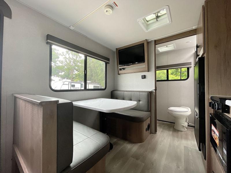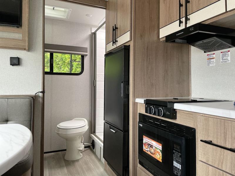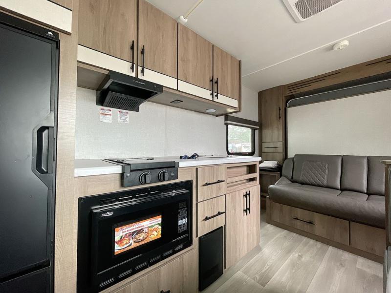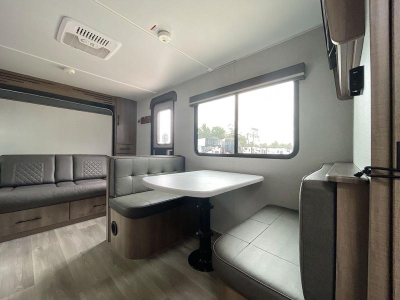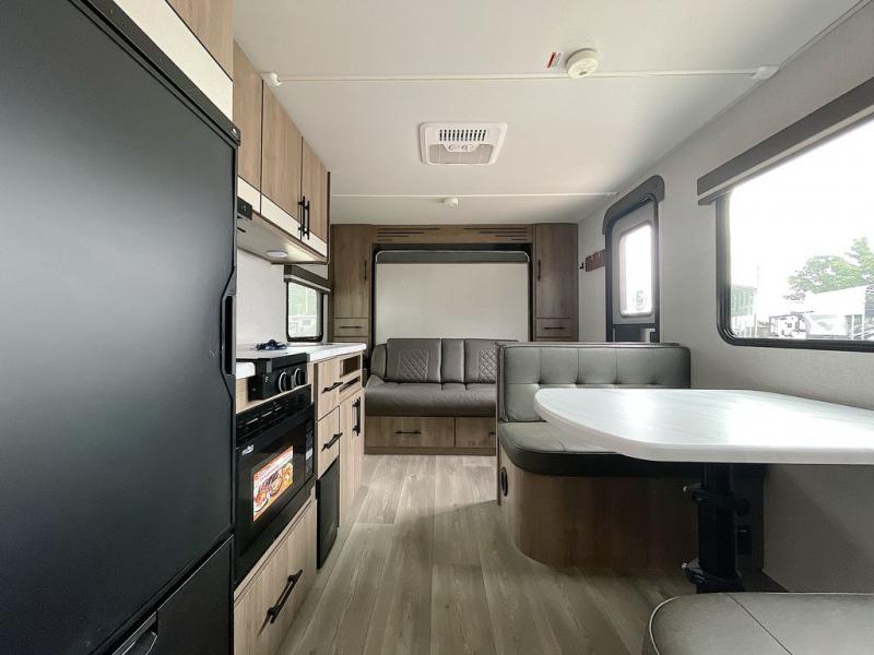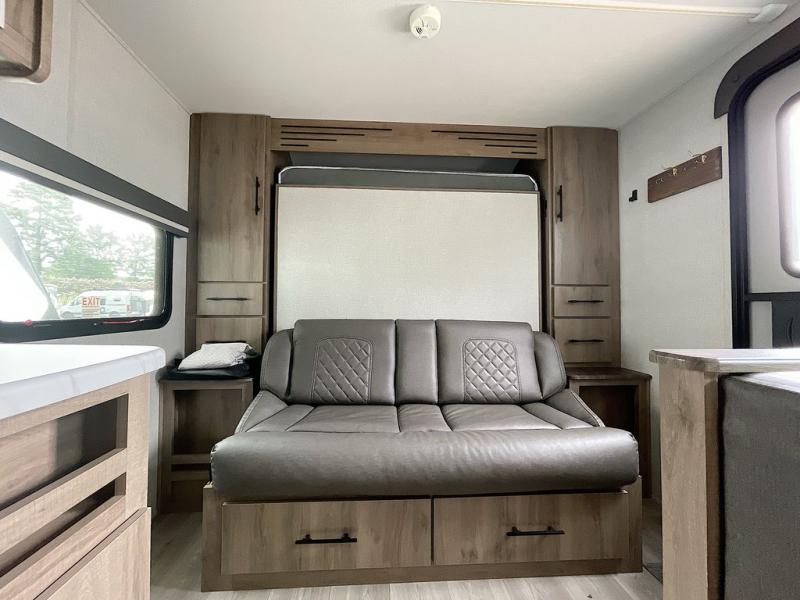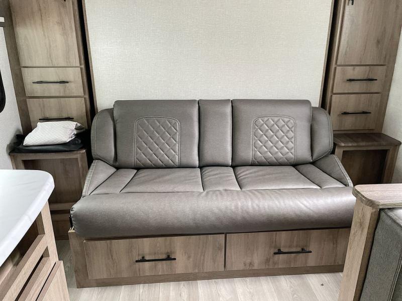 Start looking for your favorite campground to take this travel trailer to! After a fun day at the beach, you can rinse the sand out of your hair with the walk-in shower with a skylight in the full rear bathroom. Depending on what time you enter the unit will determine whether you see the Murphy bed or sofa with drawers underneath and wardrobes on either side of it. The booth dinette is not only great for enjoying meals prepared with the two burner cooktop or outside griddle, but also for transforming into an extra sleeping space!