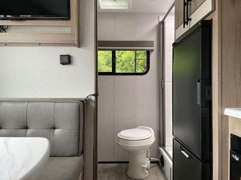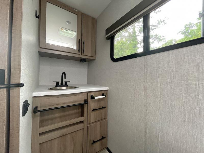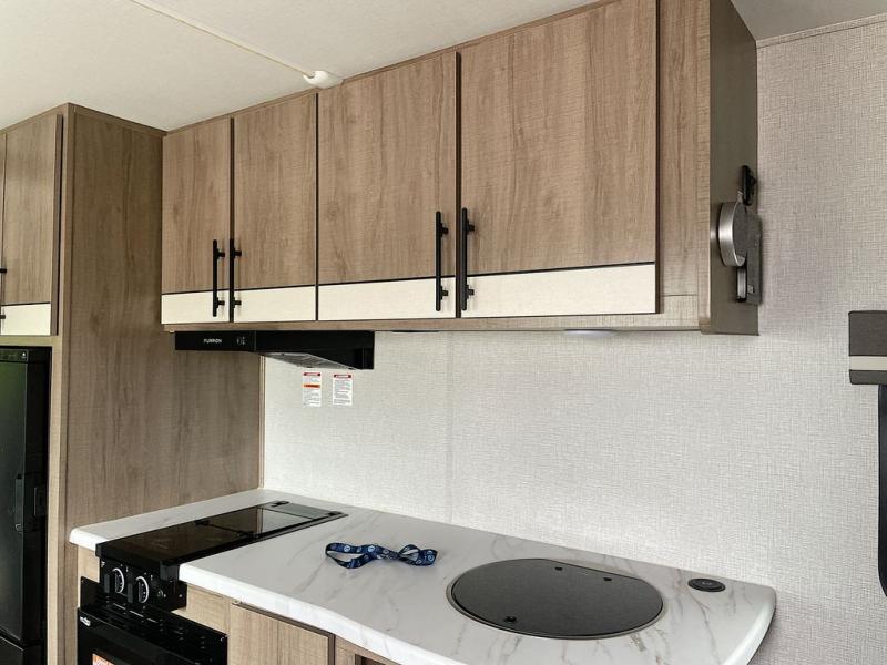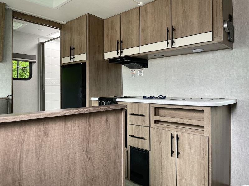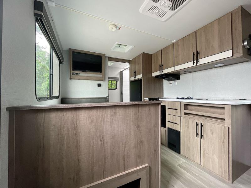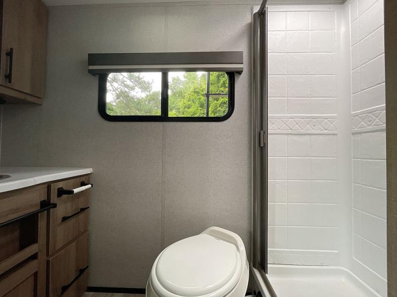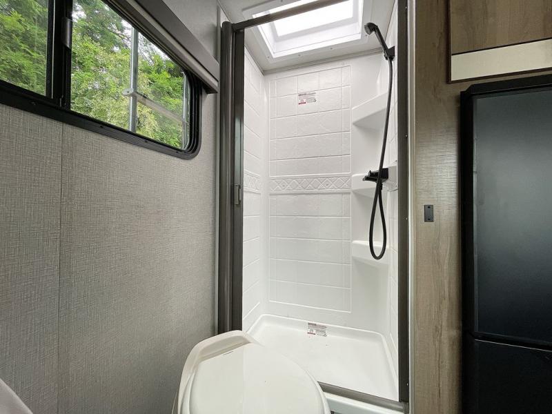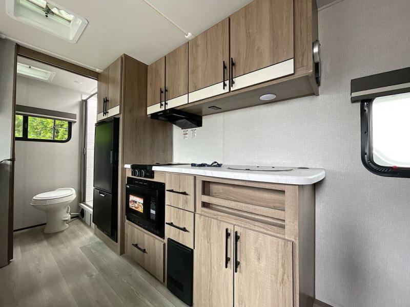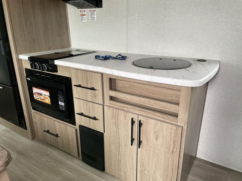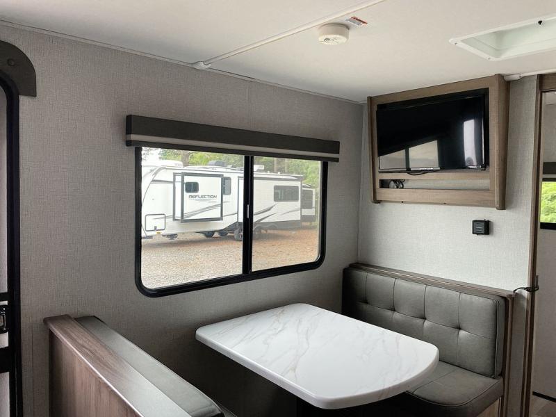 Start looking for your favorite campground to take this travel trailer to! After a fun day at the beach, you can rinse the sand out of your hair with the walk-in shower with a skylight in the full rear bathroom. Depending on what time you enter the unit will determine whether you see the Murphy bed or sofa with drawers underneath and wardrobes on either side of it. The booth dinette is not only great for enjoying meals prepared with the two burner cooktop or outside griddle, but also for transforming into an extra sleeping space!