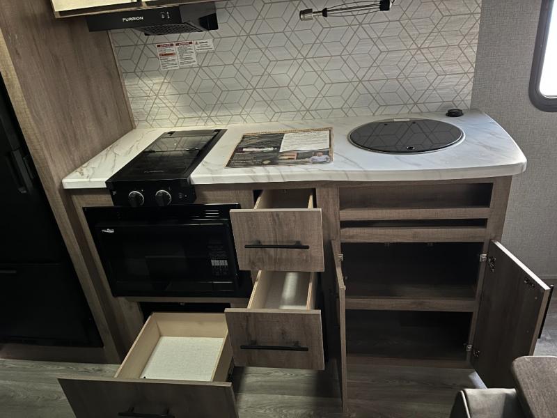 Cooktop, microwave, refrigerator, and storage make meal prep a breeze.