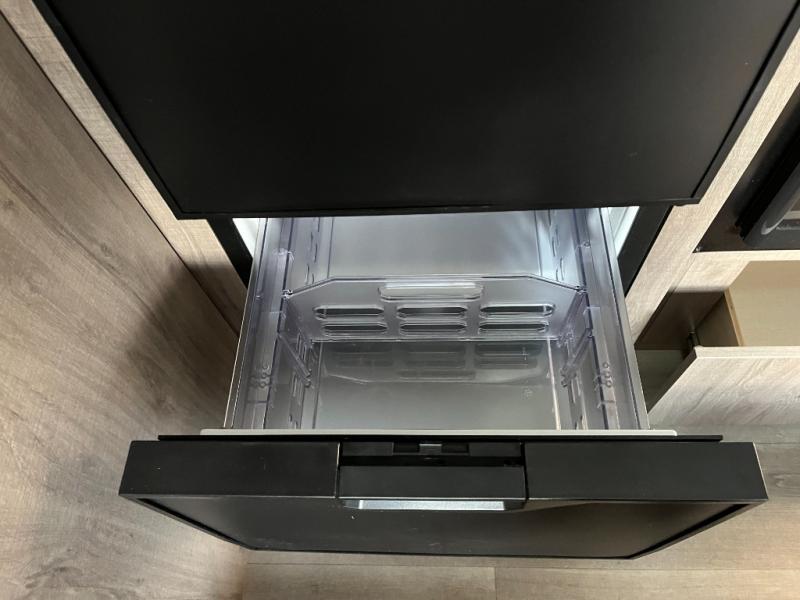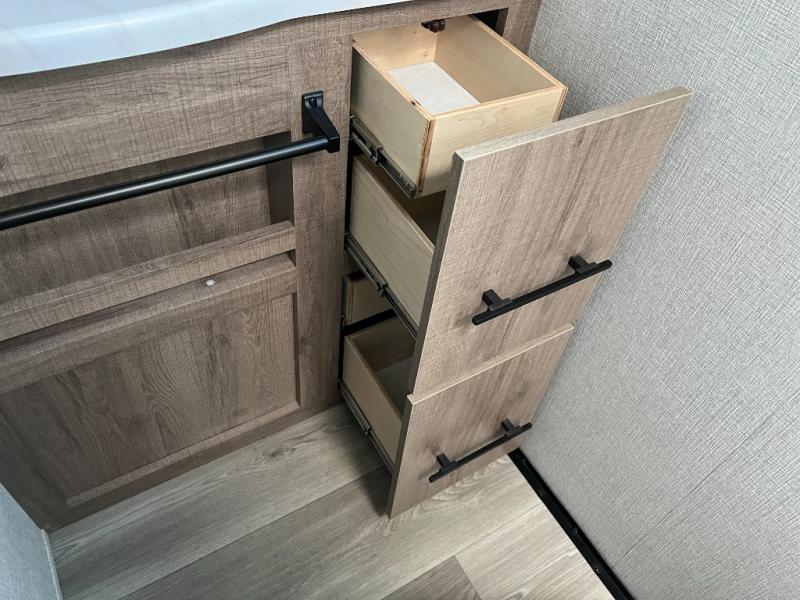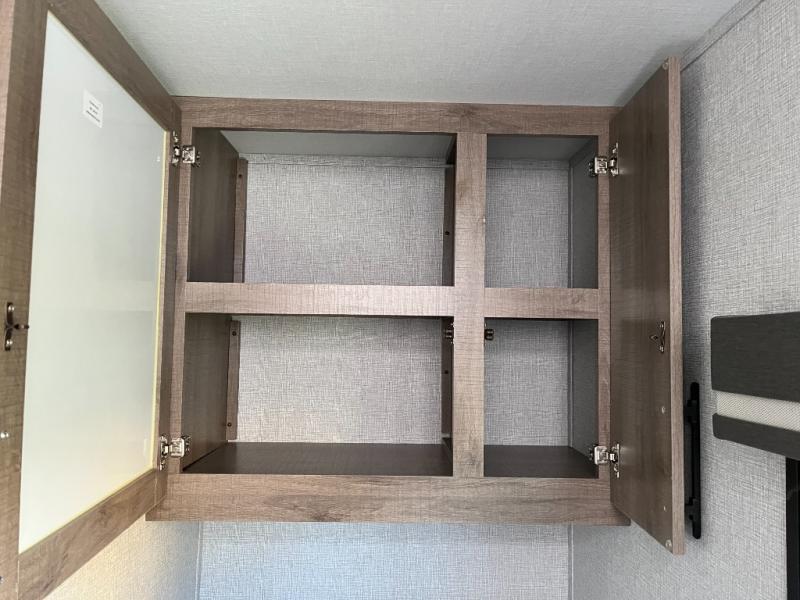 The kitchen is designed to make meal preparation simple and enjoyable while you’re on the road. With a cooktop, microwave, refrigerator, and generous countertop space, you’ll have what you need to prepare breakfasts before hikes and home-style dinners at your campsite. Storage cabinets keep cookware, utensils, and pantry items organized and within reach, so meal prep stays easy and efficient.