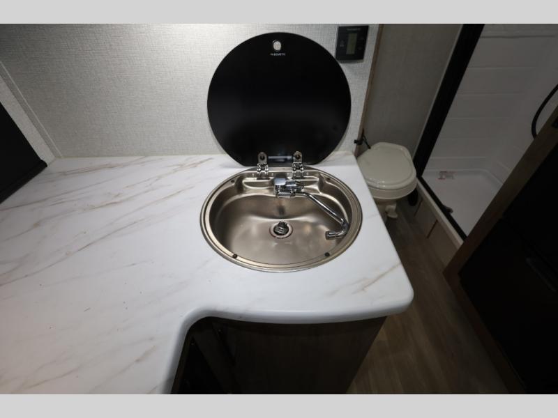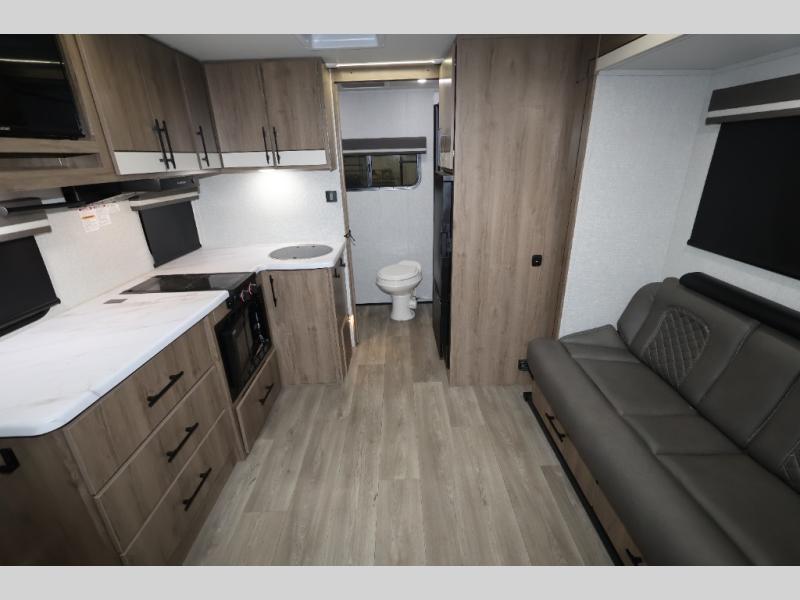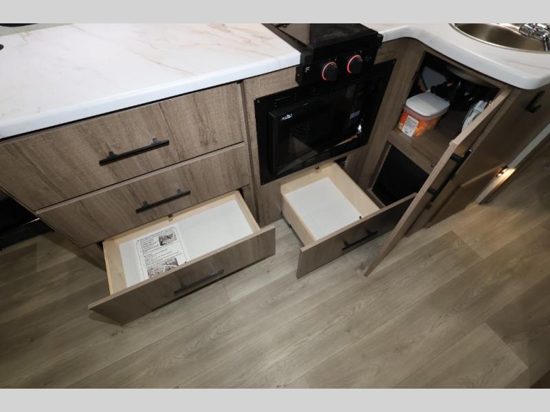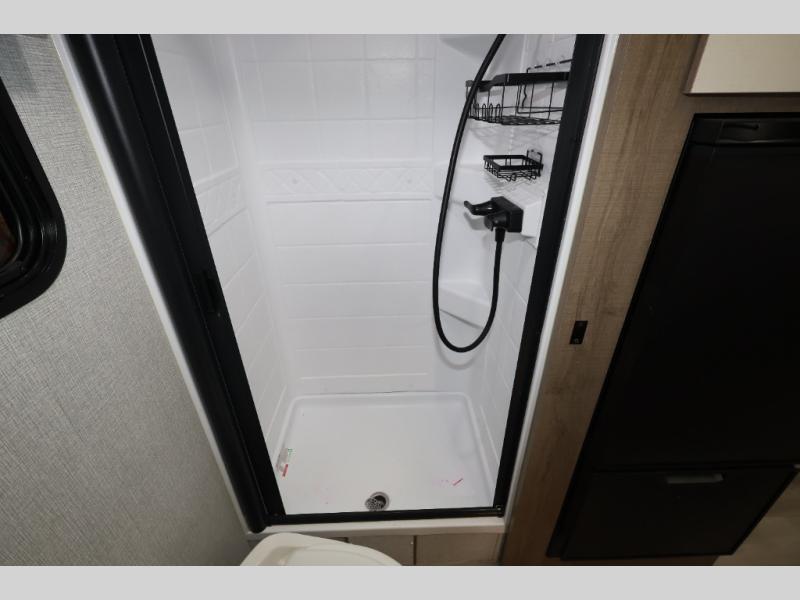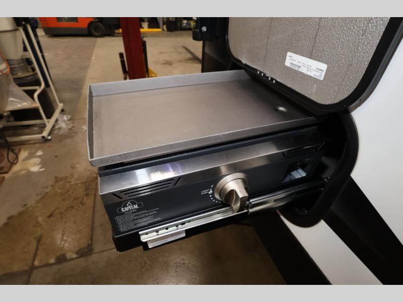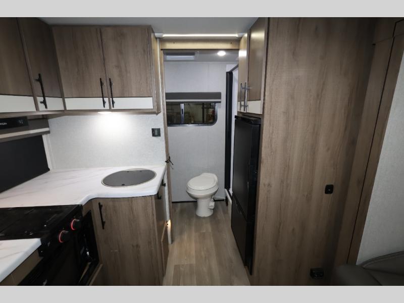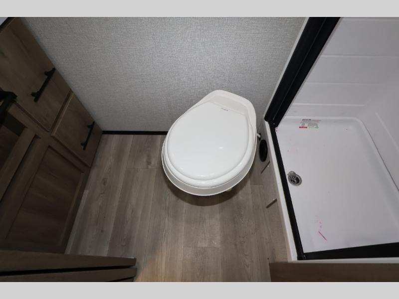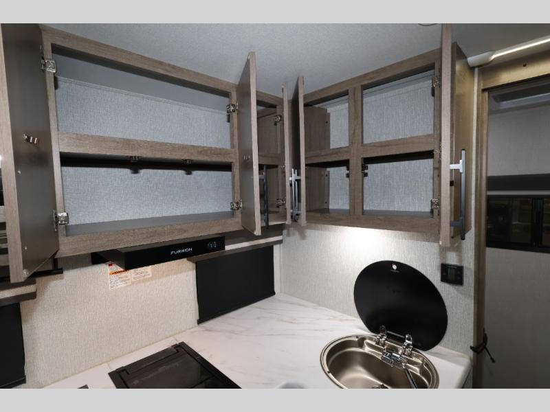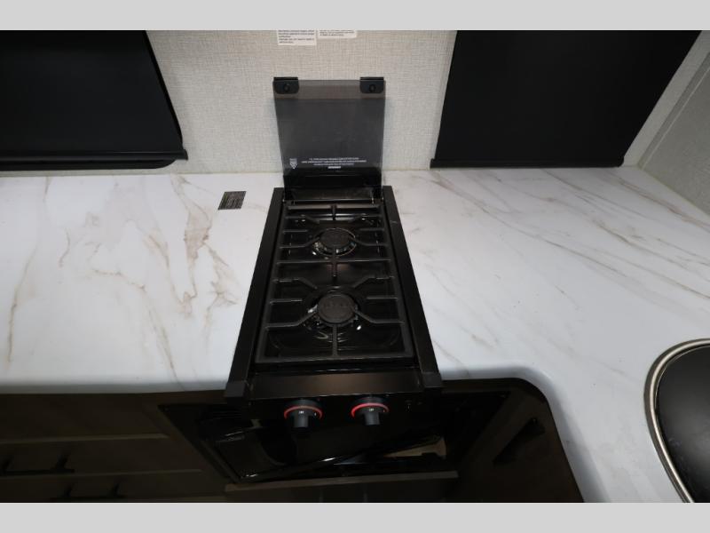 Pack your bags and head out on a fun camping trip in this travel trailer! The front queen bed offers a comfortable place to sleep at night, as well as the roll-over sleeper sofa slide with drawers for storage. You can hang your jacket up on one of the coat hooks when you enter, and then start preparing a delicious meal on the two burner cooktop. You even have an outside griddle to fry up the catch of the day. The full rear bathroom has a walk-in shower with skylight to freshen up in and overhead cabinets for your toiletries!