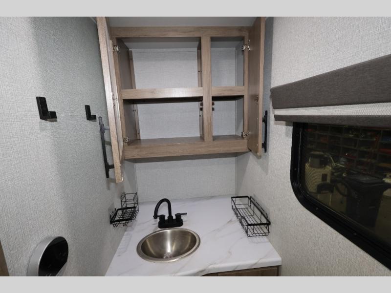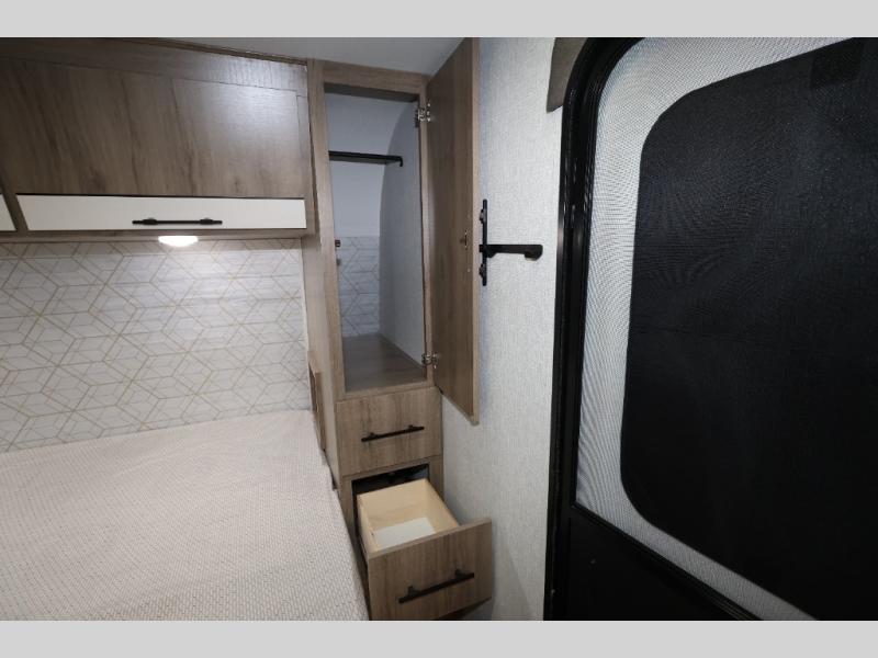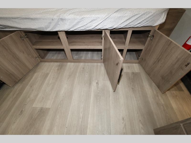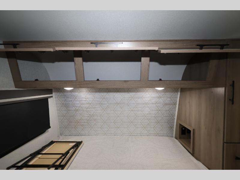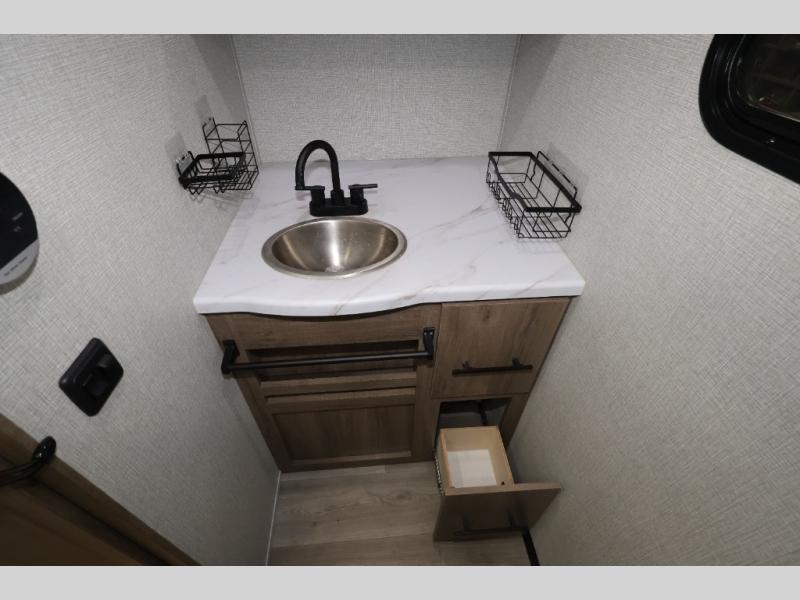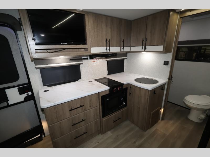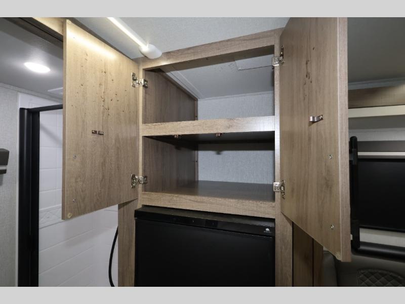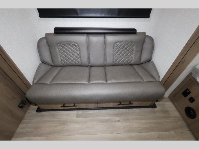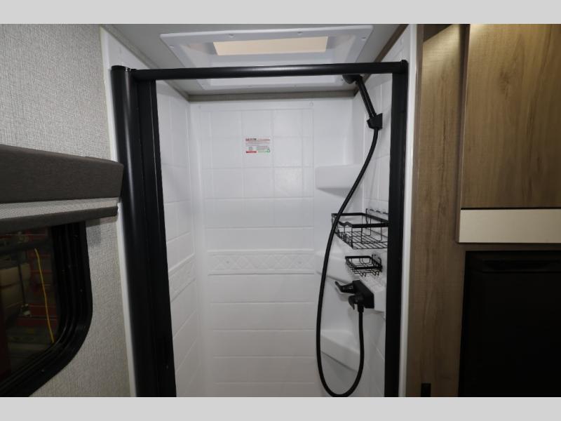 Pack your bags and head out on a fun camping trip in this travel trailer! The front queen bed offers a comfortable place to sleep at night, as well as the roll-over sleeper sofa slide with drawers for storage. You can hang your jacket up on one of the coat hooks when you enter, and then start preparing a delicious meal on the two burner cooktop. You even have an outside griddle to fry up the catch of the day. The full rear bathroom has a walk-in shower with skylight to freshen up in and overhead cabinets for your toiletries!