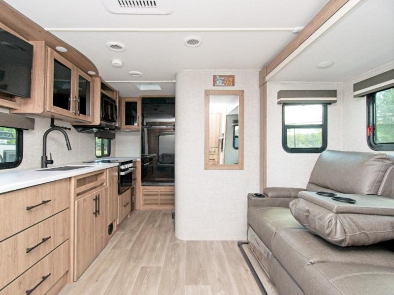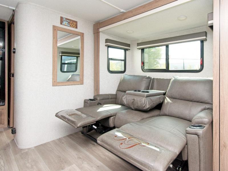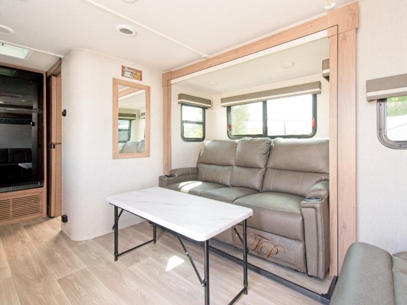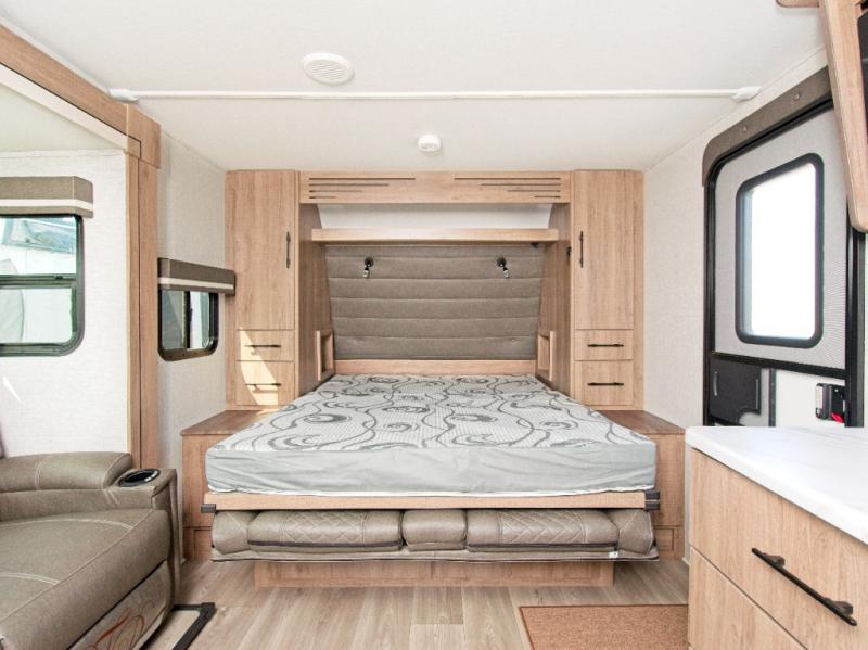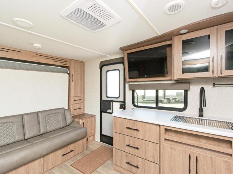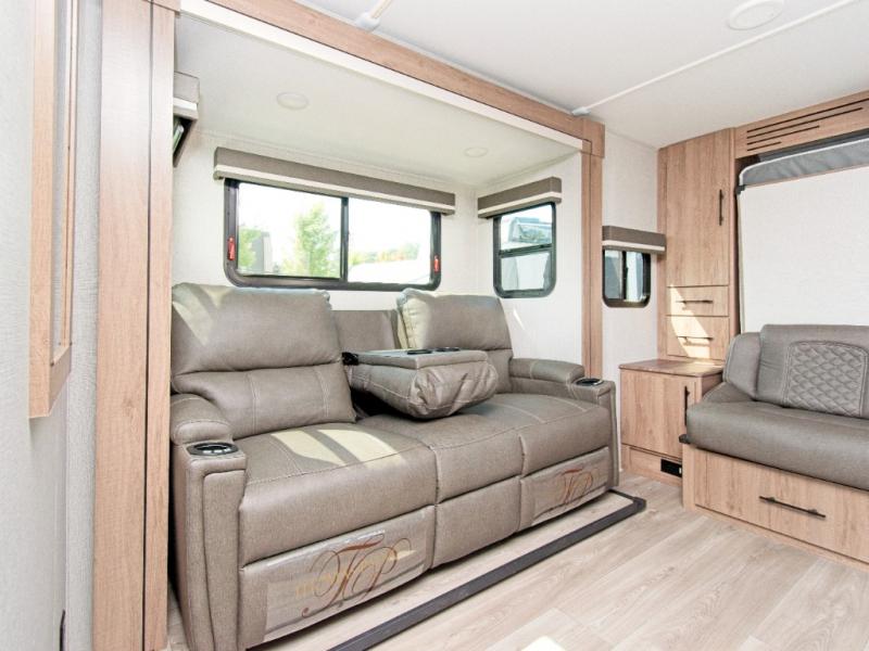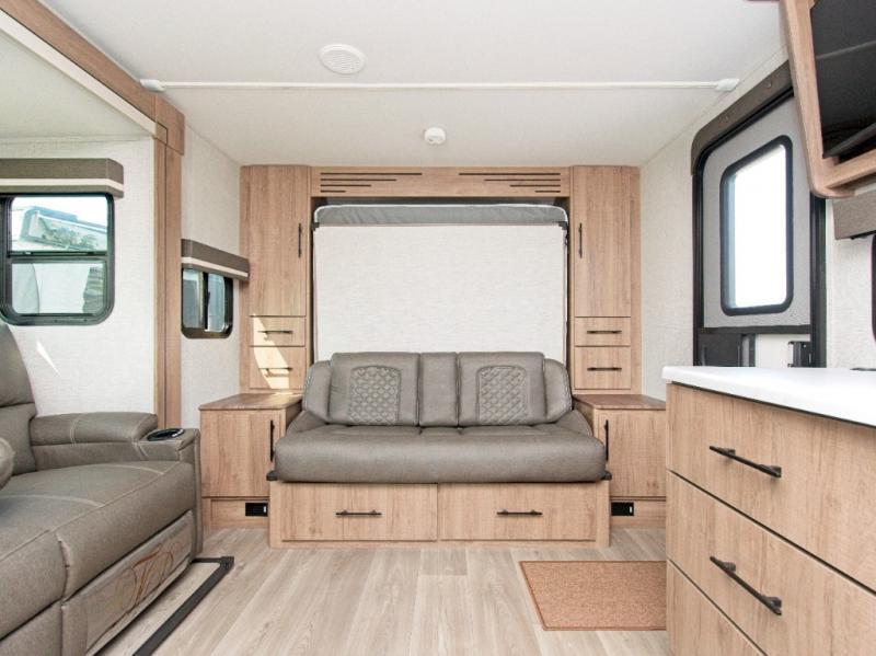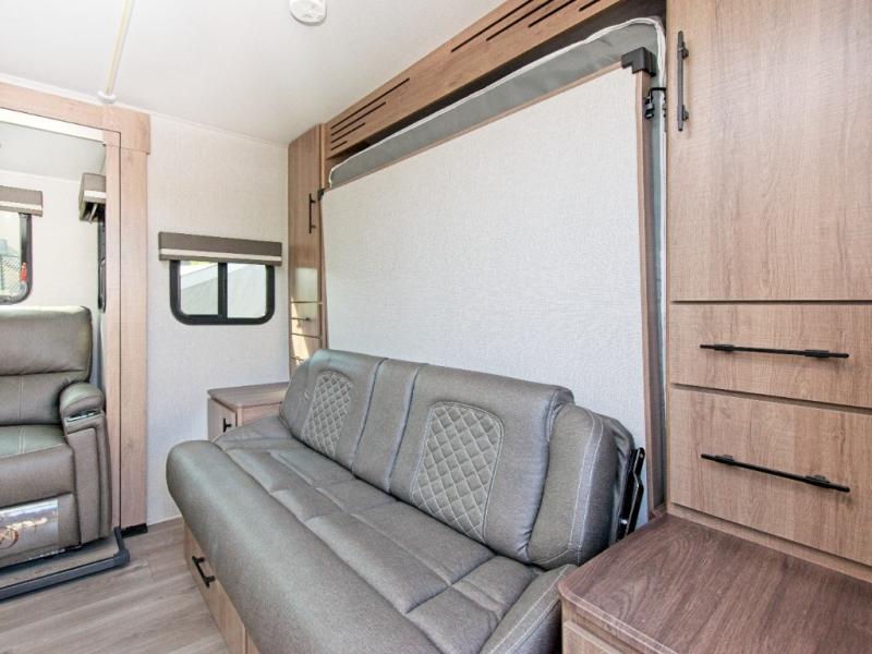 The Imagine XLS 17MKE is the perfect blend of space-saving innovation and residential comfort. The versatile Queen Murphy Bed transforms your sleeping area into a cozy sofa lounge by day, complete with convenient drawer storage underneath. Enjoy meals or game nights at the theater dinette, or upgrade to the optional U-shaped dinette for even more seating.