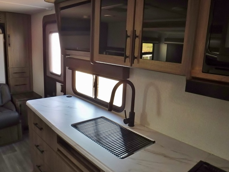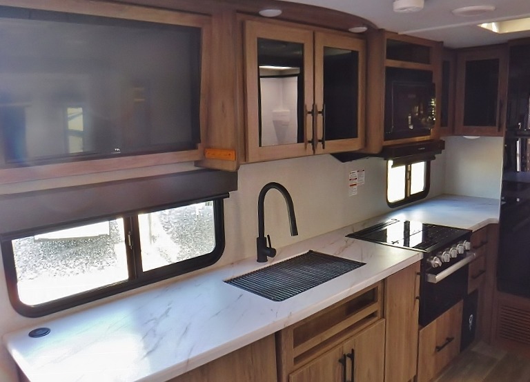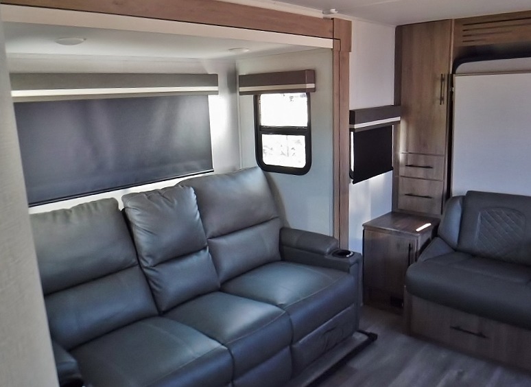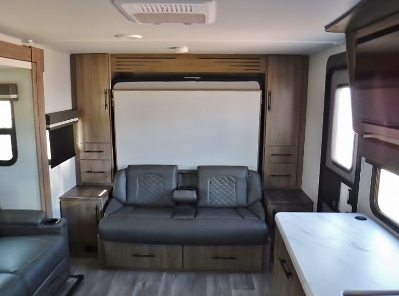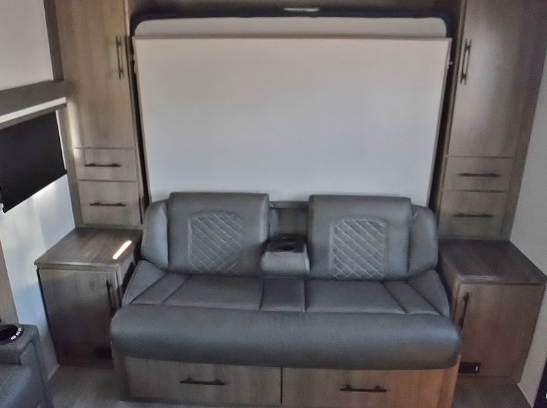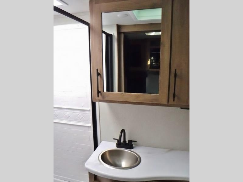 The Murphy bed is the eye-catching feature on this Imagine XLS travel trailer! Not only can it fold away in the morning to reveal a sofa for lounging, but it will also provide you with drawer storage under the sofa. Another functional feature is the theater dinette with a removable table in front or you can choose the optional U-shaped dinette if you like to gather around for game night. It rests on the single slide so that there is more floor space, and it offers you great comfort while you dine across from the LED HDTV. A full bathroom will keep you clean and fresh with its residential walk-in shower, skylight, linen closet, vanity, toilet, and power vent fan.