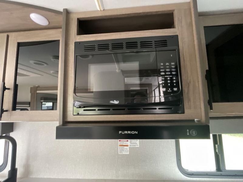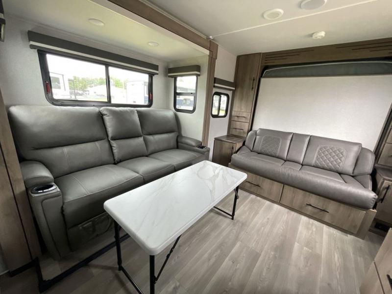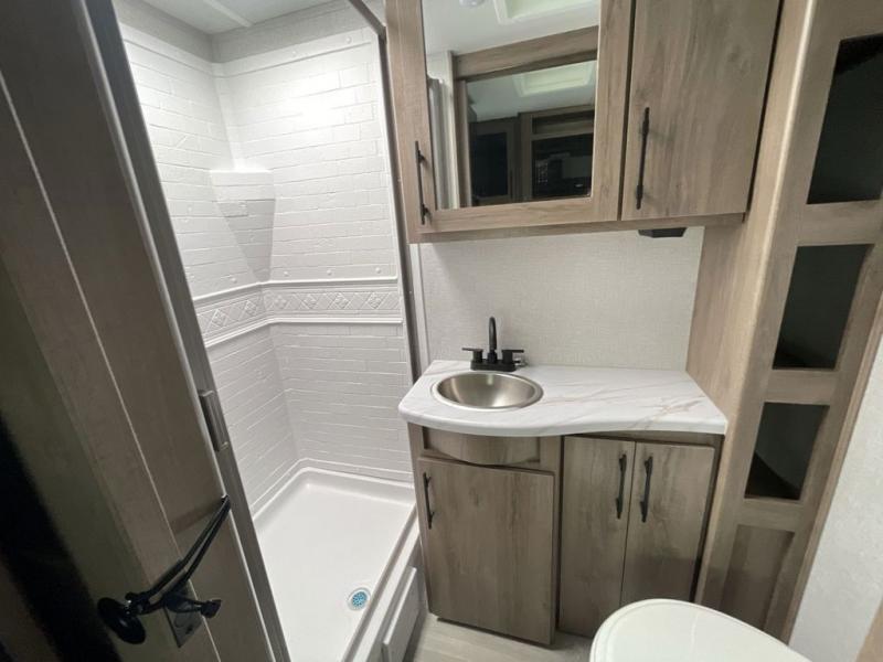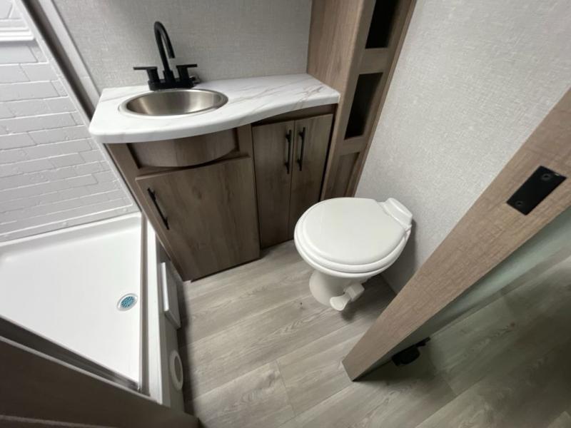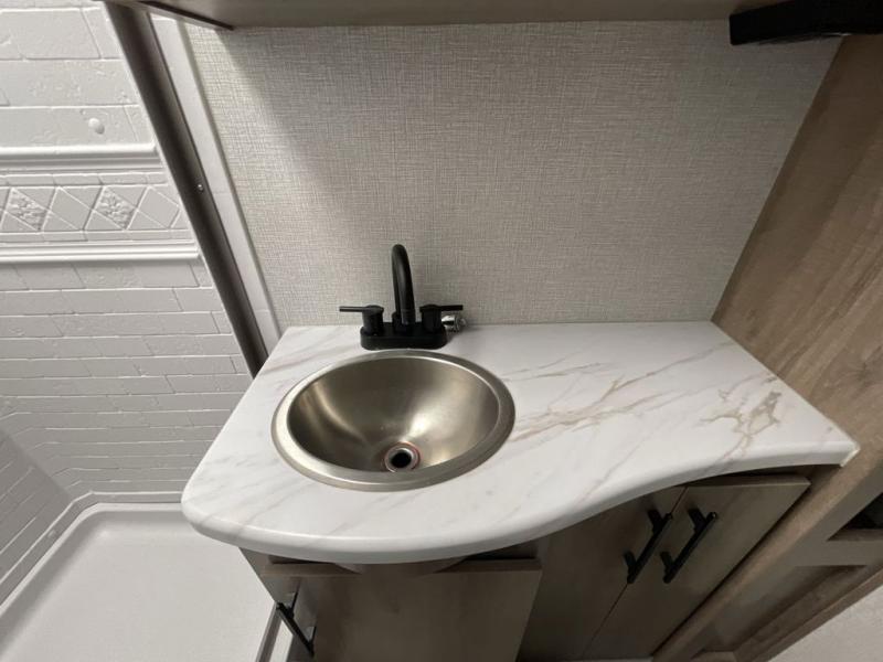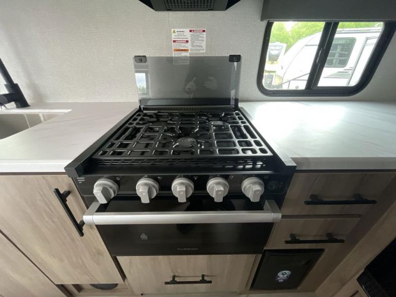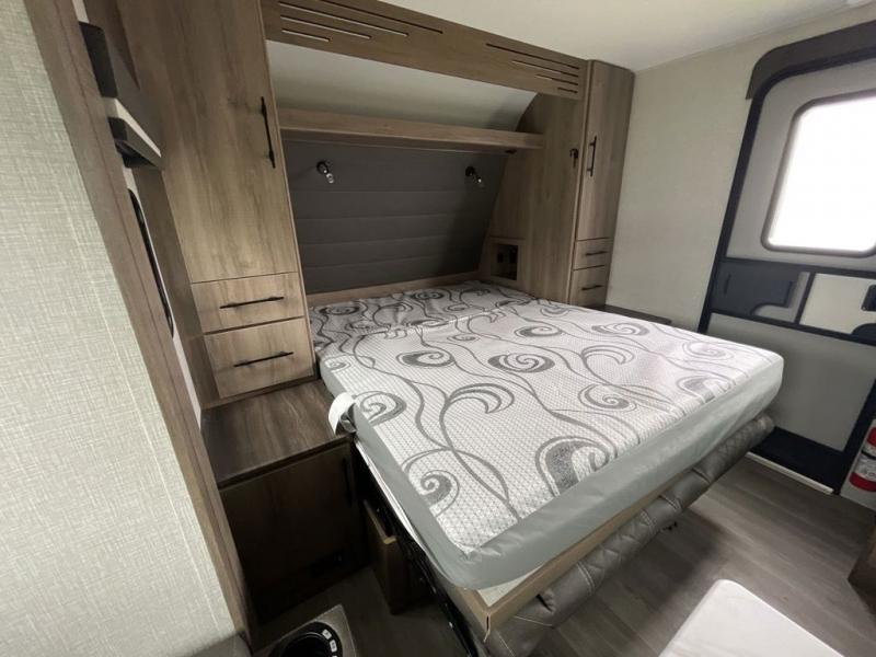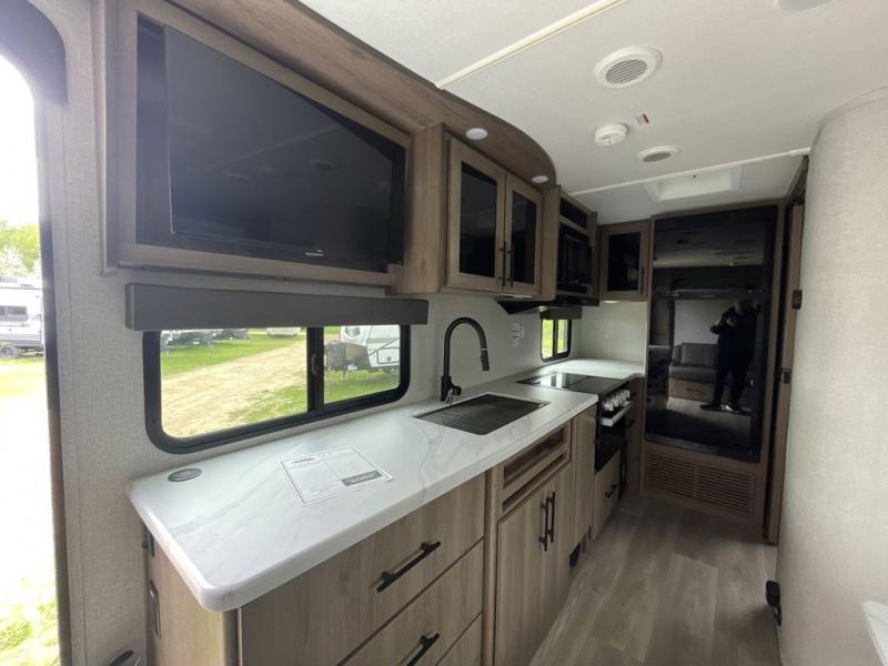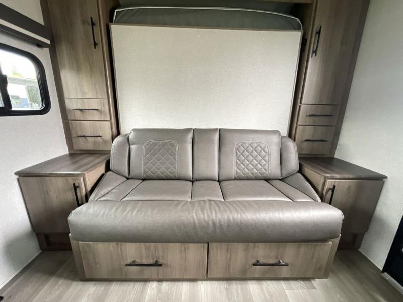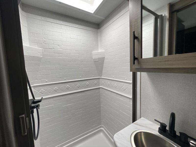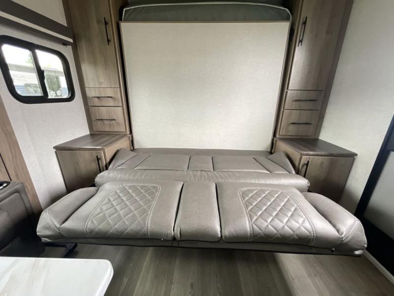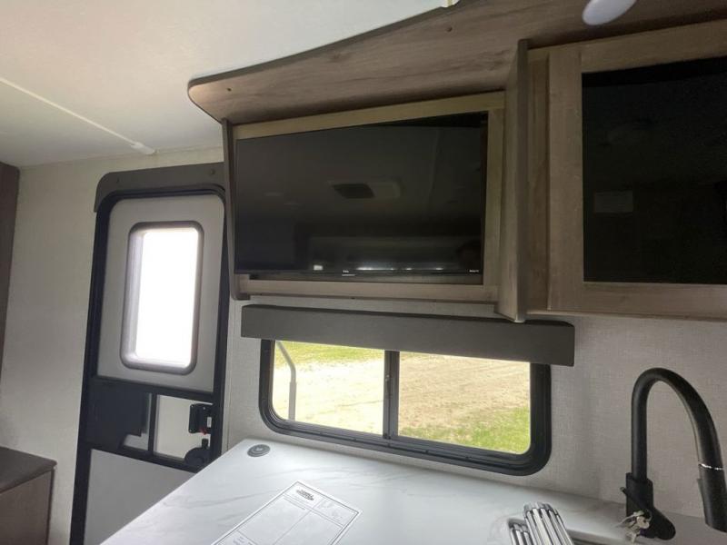 The Murphy bed is the eye-catching feature on this Imagine XLS travel trailer! Not only can it fold away in the morning to reveal a sofa for lounging, but it will also provide you with drawer storage under the sofa. Another functional feature is the theater dinette with a removable table in front or you can choose the optional U-shaped dinette if you like to gather around for game night. It rests on the single slide so that there is more floor space, and it offers you great comfort while you dine across from the LED HDTV. A full bathroom will keep you clean and fresh with its residential walk-in shower, skylight, linen closet, vanity, toilet, and power vent fan.