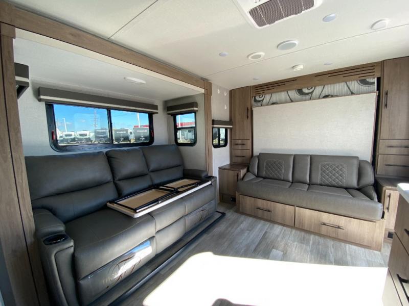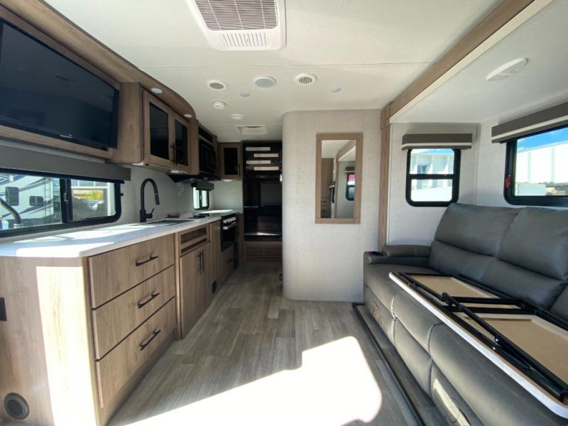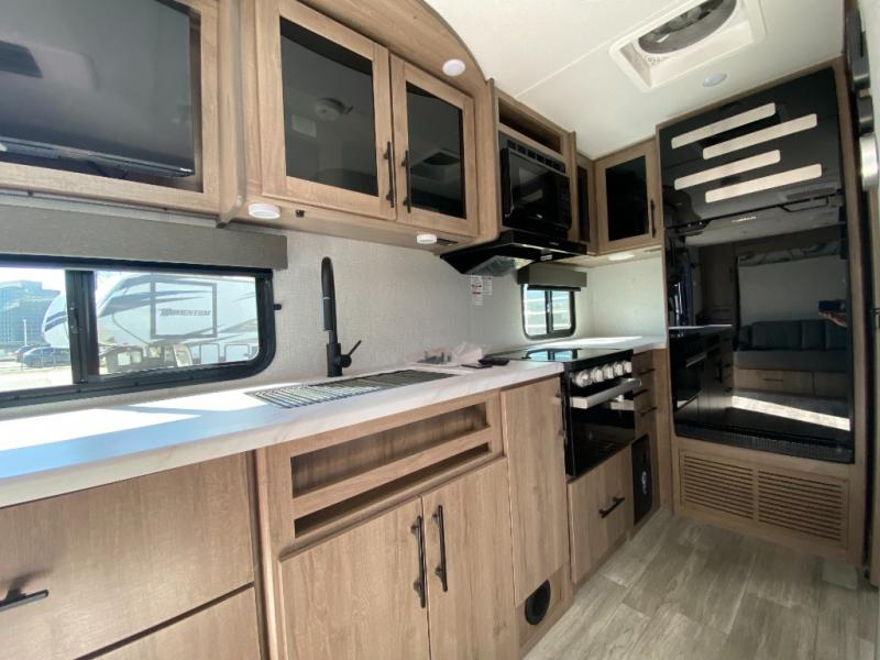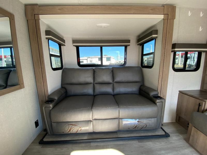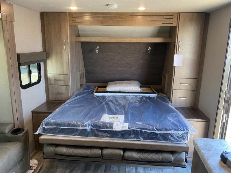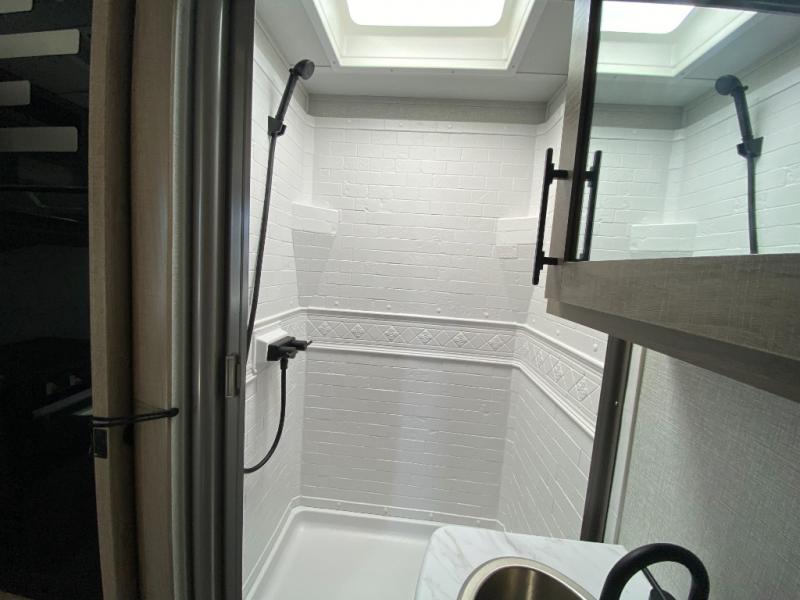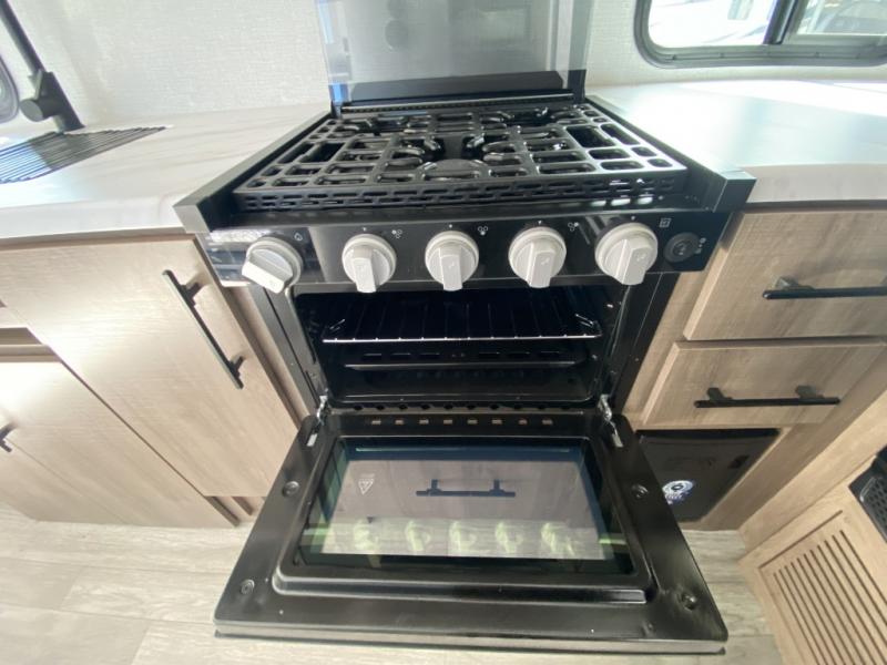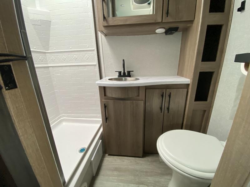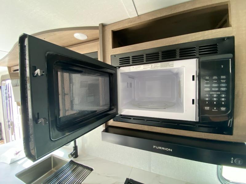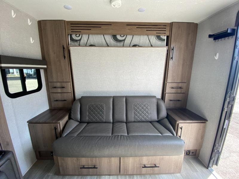 The Murphy bed is the eye-catching feature on this Imagine XLS travel trailer! Not only can it fold away in the morning to reveal a sofa for lounging, but it will also provide you with drawer storage under the sofa. Another functional feature is the theater dinette with a removable table in front or you can choose the optional U-shaped dinette if you like to gather around for game night. It rests on the single slide so that there is more floor space, and it offers you great comfort while you dine across from the LED HDTV. A full bathroom will keep you clean and fresh with its residential walk-in shower, skylight, linen closet, vanity, toilet, and power vent fan.