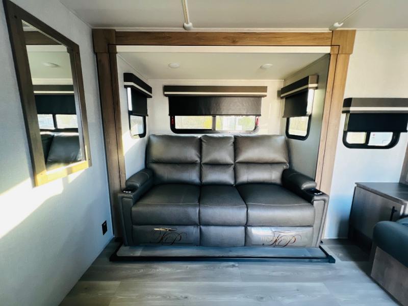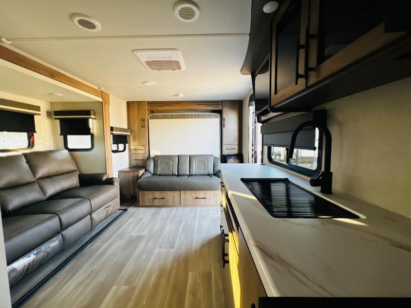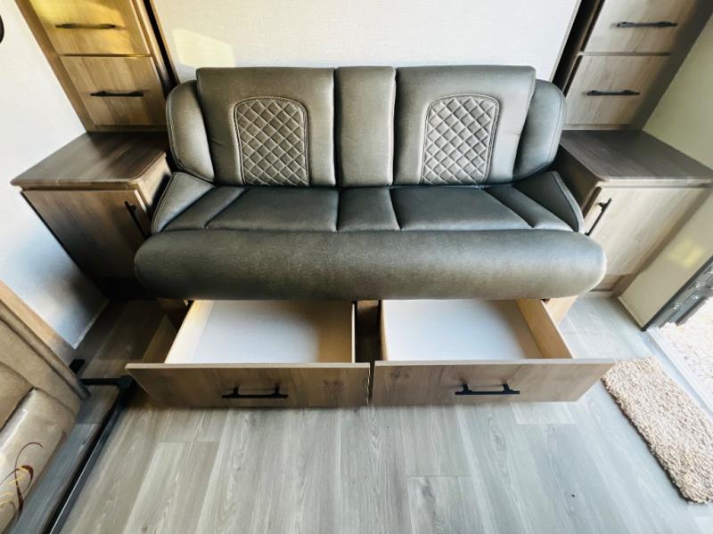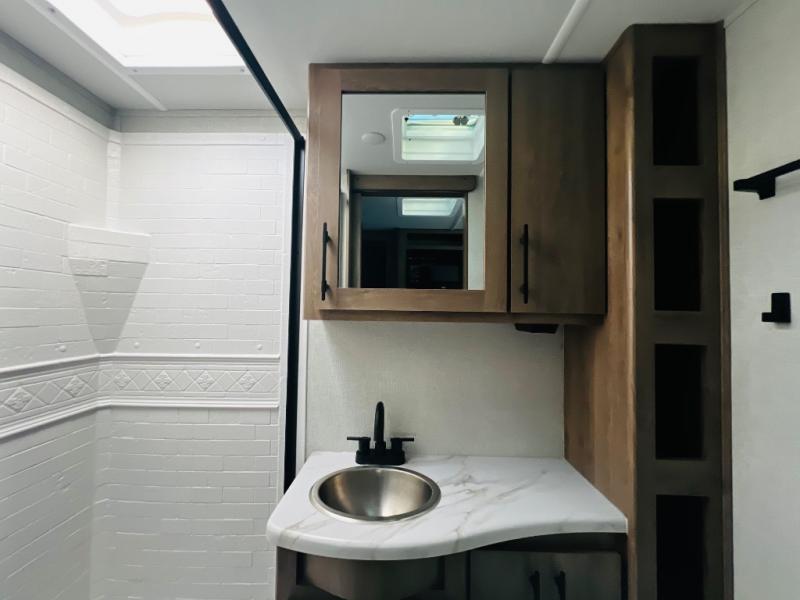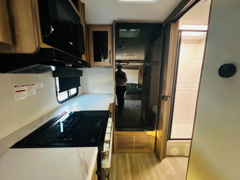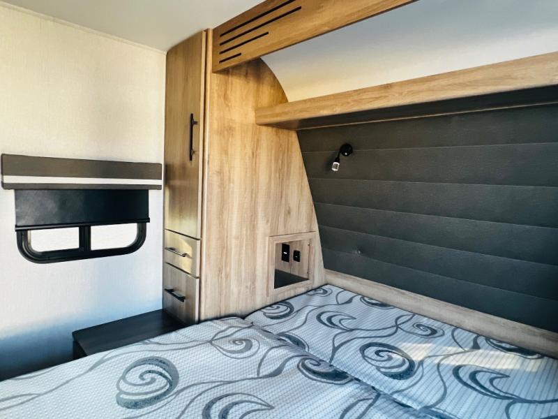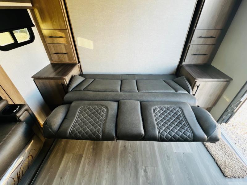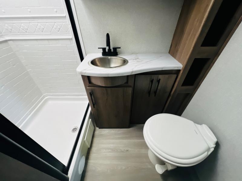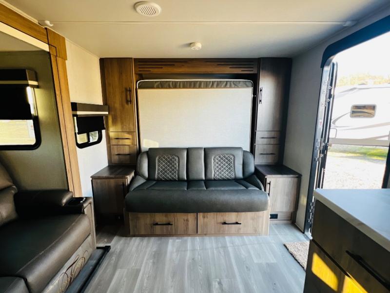 The Murphy bed is the eye-catching feature on this Imagine XLS travel trailer! Not only can it fold away in the morning to reveal a sofa for lounging, but it will also provide you with drawer storage under the sofa. Another functional feature is the theater dinette with a removable table in front or you can choose the optional U-shaped dinette if you like to gather around for game night. It rests on the single slide so that there is more floor space, and it offers you great comfort while you dine across from the LED HDTV. A full bathroom will keep you clean and fresh with its residential walk-in shower, skylight, linen closet, vanity, toilet, and power vent fan.