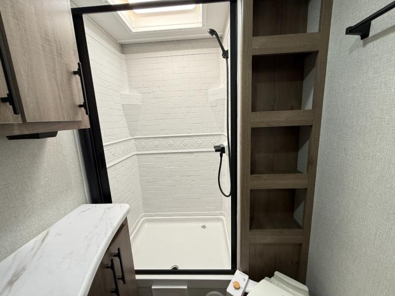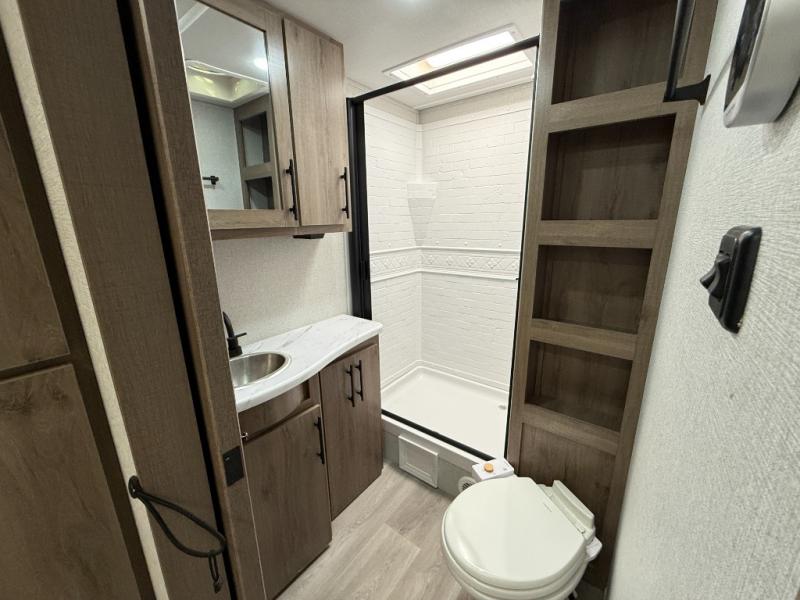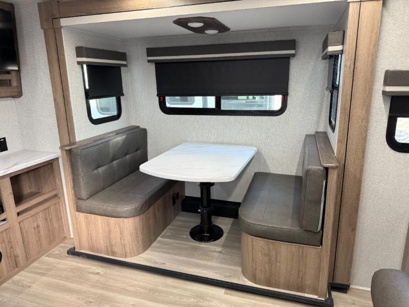 Your family will love camping in this spacious and versatile trailer thanks to the double slides and Murphy bed provided. During the day the Murphy bed is tucked away to provide more space and seating, and at night when folded down, there is a curtain for some privacy as you sleep. The booth dinette slides out to provide even more space and features windows on three sides so you can look out at your surroundings while you enjoy breakfast. The 30" flip top and bottom bunks each have some privacy with the sliding door, and the bunks are right next to the full bathroom for easy access in the middle of the night. The kitchen features everything you need to create meals and snacks as you travel, and you can have some more prep space by using the flip-up countertop extension.