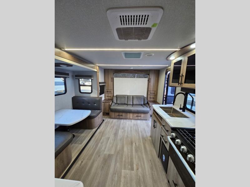 Your family will love camping in this spacious and versatile trailer thanks to the double slides and Murphy bed provided. During the day the Murphy bed is tucked away to provide more space and seating, and at night when folded down, there is a curtain for some privacy as you sleep. The booth dinette slides out to provide even more space and features windows on three sides so you can look out at your surroundings while you enjoy breakfast. The 30" flip top and bottom bunks each have some privacy with the sliding door, and the bunks are right next to the full bathroom for easy access in the middle of the night. The kitchen features everything you need to create meals and snacks as you travel, and you can have some more prep space by using the flip-up countertop extension.