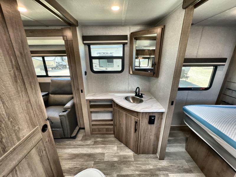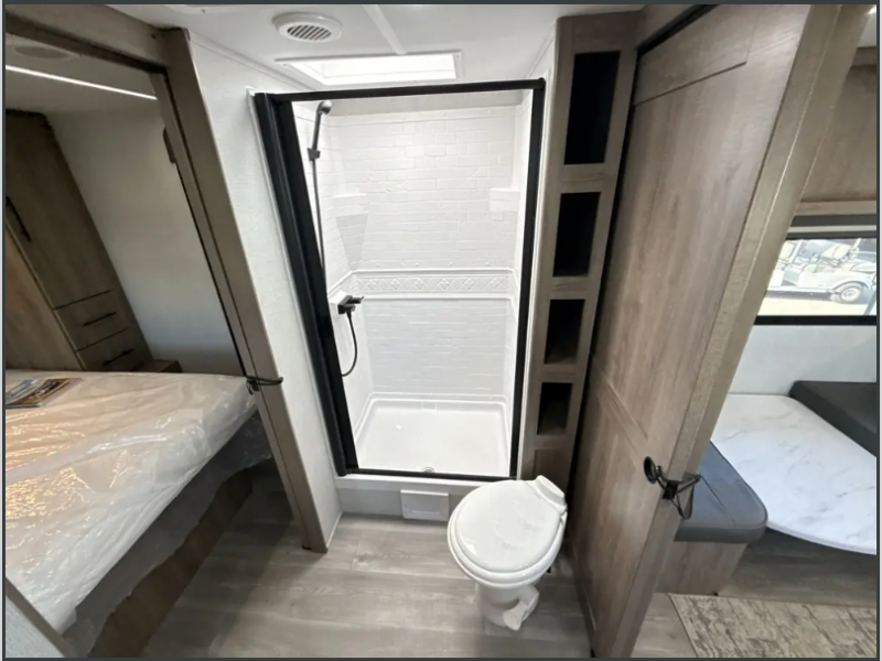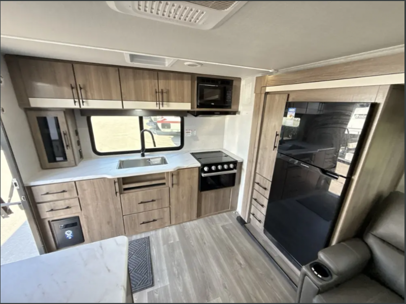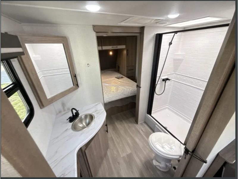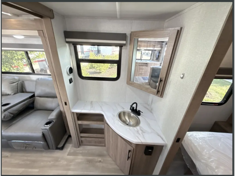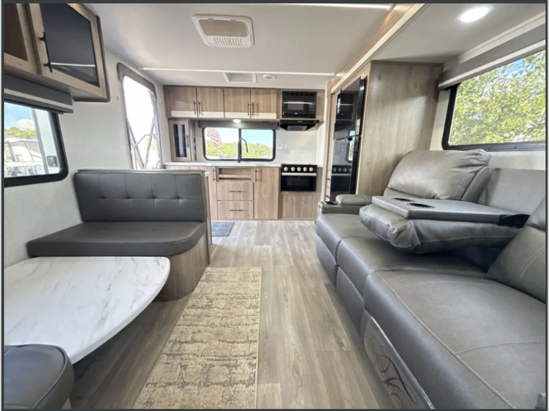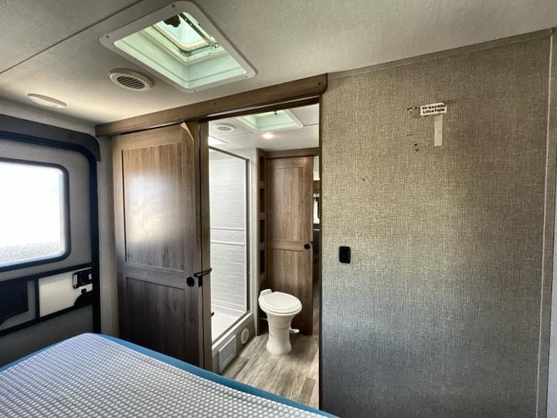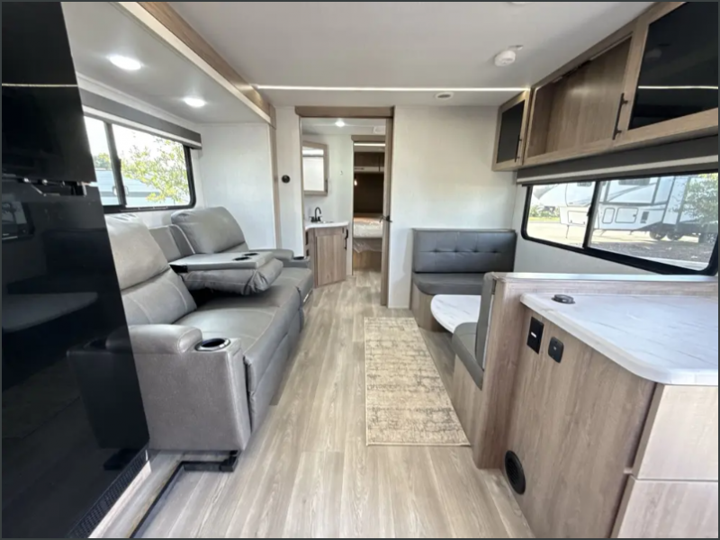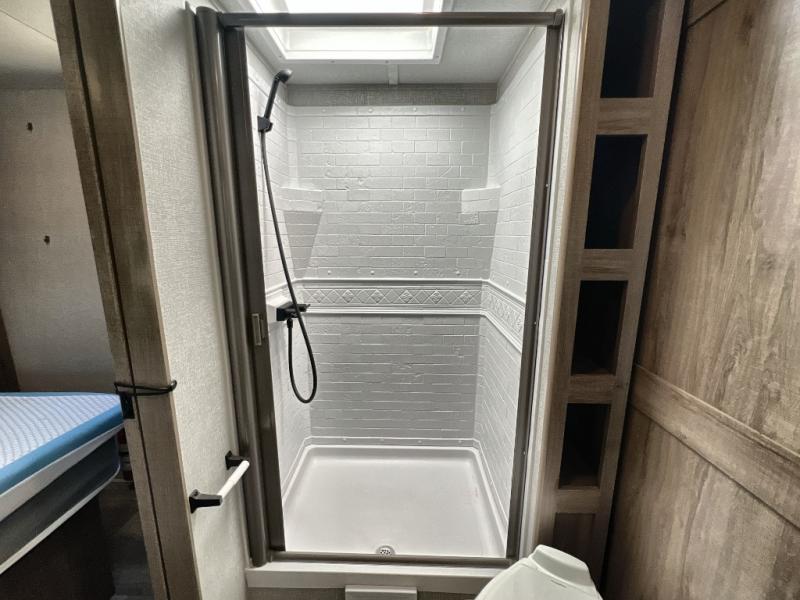 Treat yourself to a weekend of fun in this Imagine XLS travel trailer! Whether it's just you and your spouse, or you've chosen to bring along a group of friends, this trailer will meet the need. The front bedroom can sleep two people on the walk-around queen-size bed. The bedroom is quite functional because it not only contains the second exterior entry door, but it also has a private entrance into the walk-through bathroom since it is located on the other side of the bathroom. The booth dinette is functional too because it can transform from a dining location into a sleeping location, and the theater seating is directly across from the LED TV for easy viewing.