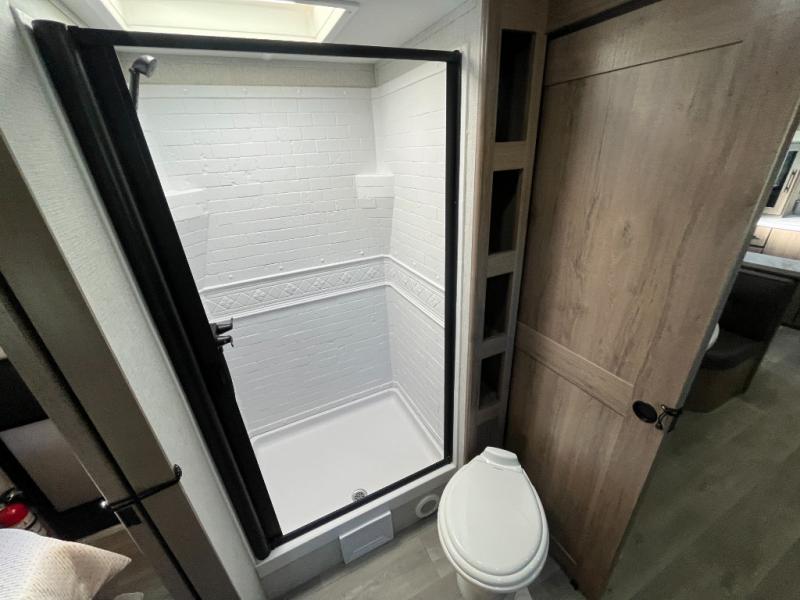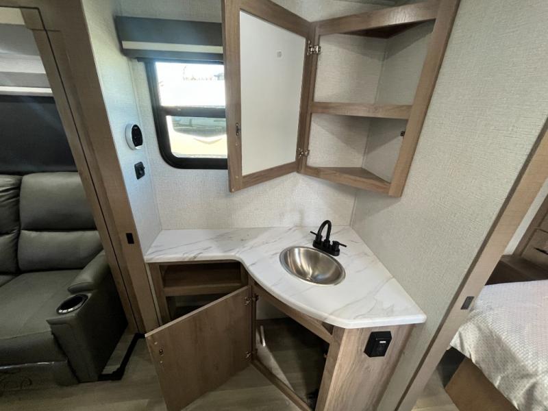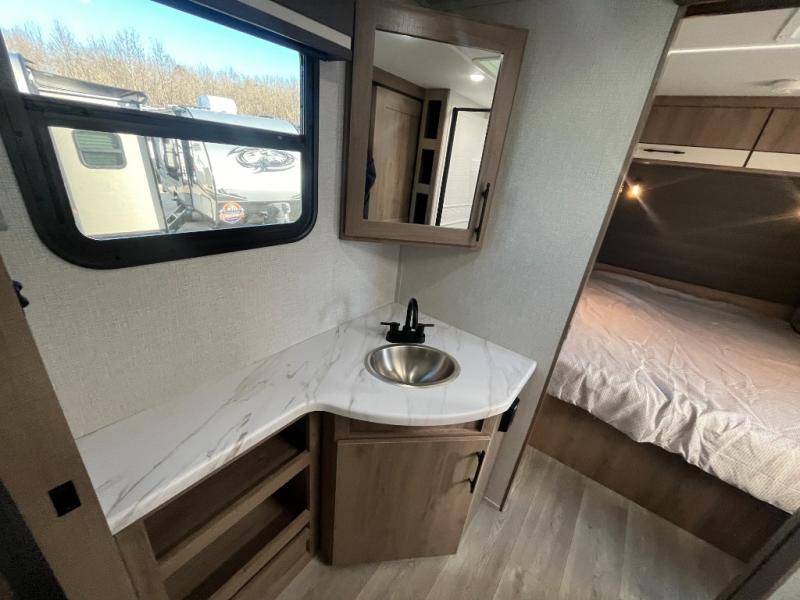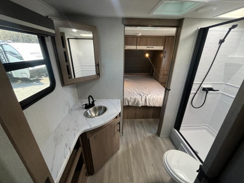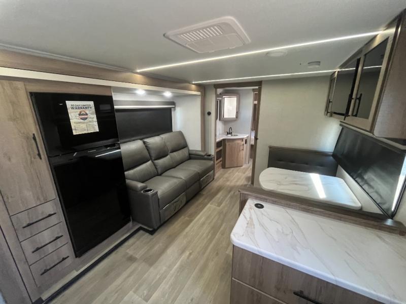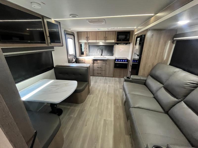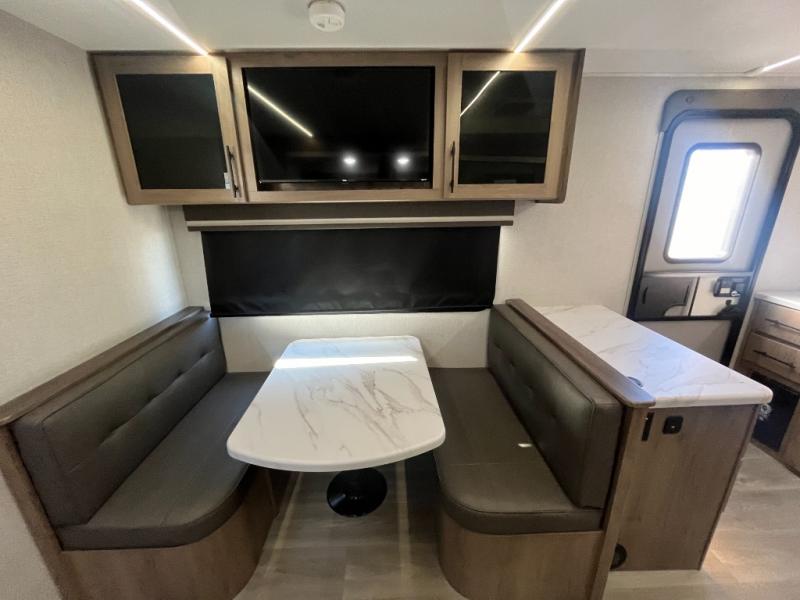 Treat yourself to a weekend of fun in this Imagine XLS travel trailer! Whether it's just you and your spouse, or you've chosen to bring along a group of friends, this trailer will meet the need. The front bedroom can sleep two people on the walk-around queen-size bed. The bedroom is quite functional because it not only contains the second exterior entry door, but it also has a private entrance into the walk-through bathroom since it is located on the other side of the bathroom. The booth dinette is functional too because it can transform from a dining location into a sleeping location, and the theater seating is directly across from the LED TV for easy viewing.