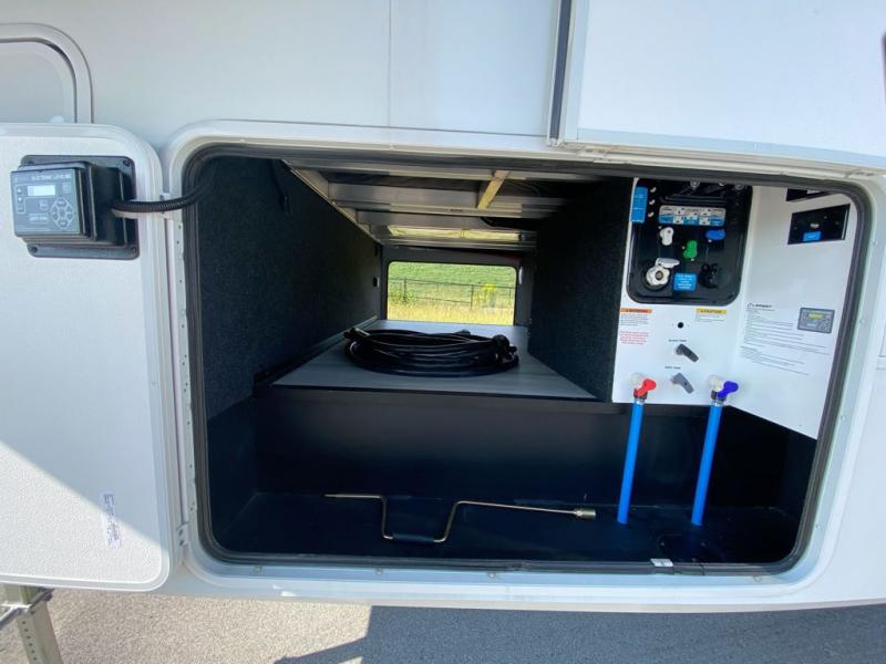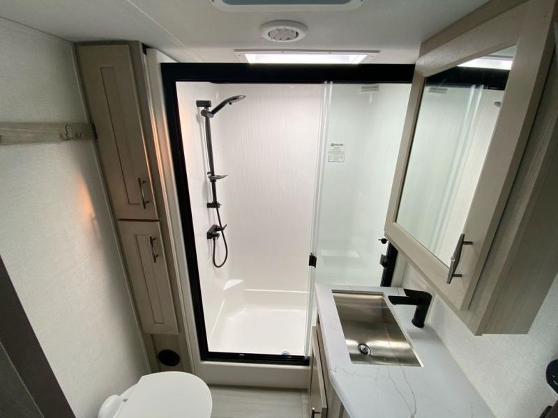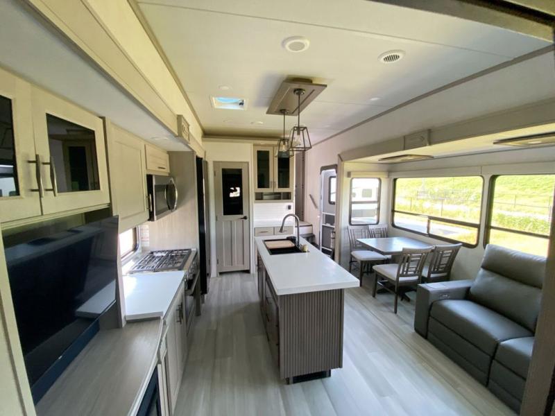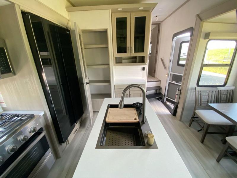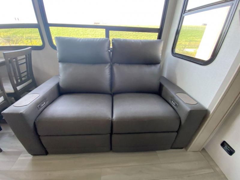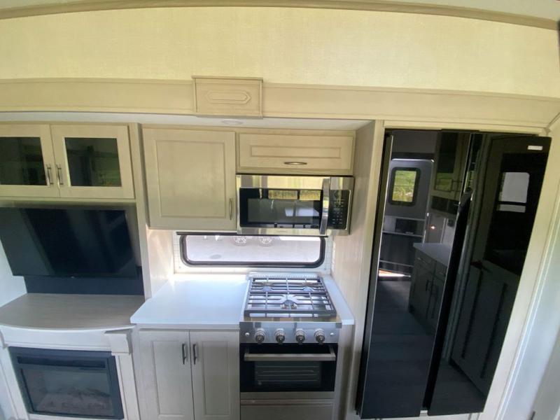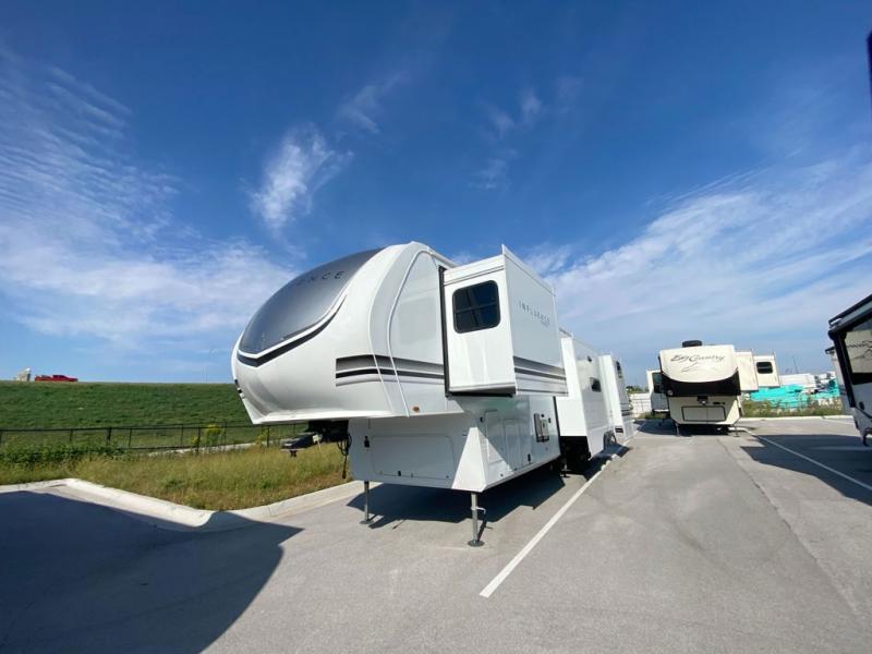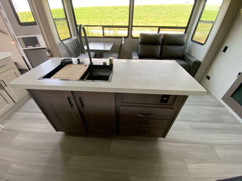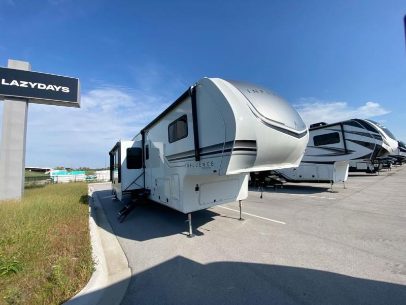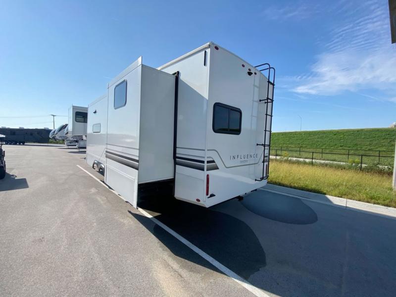 Any Grand Design Influence fifth wheel features five-sided aluminum cage construction with a walk-on roof and a fully enclosed underbelly with heated tanks and storage for all weather camping. For peace of mind, the MORryde CRE3000 Suspension system and ABS braking system will provide safe and smooth towing, and the 101" widebody construction offers all the room you need and that is before multiple slides are fully engaged. You will appreciate the keyed alike locks, slam-latch baggage doors with magnetic door catches, exterior security light, and solid surface entry steps. On the inside, Congoleum flooring, premium roller shades for privacy, a hallway handrail for safety, and nightstands with USB ports to keep all of your electronics fully charged. You will also love the On Demand tankless water heater when showering, plus the added heat and ambiance from an electric fireplace, and so much more!