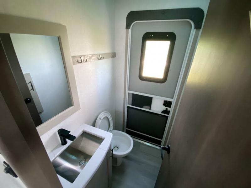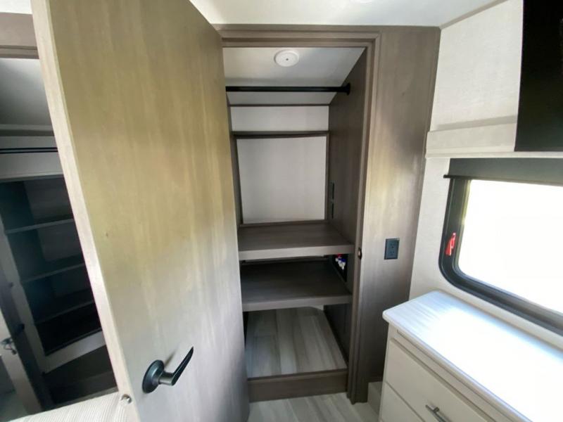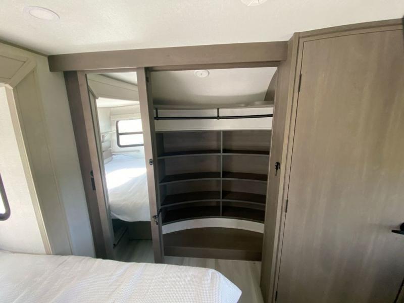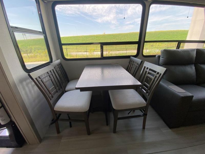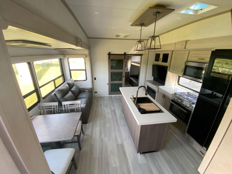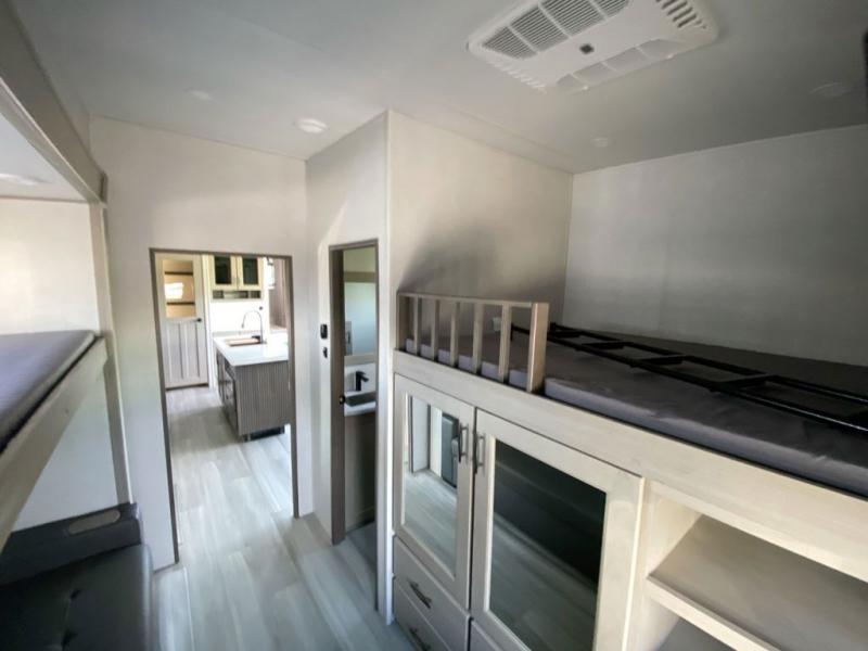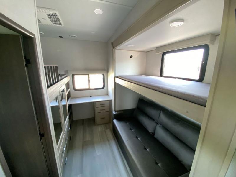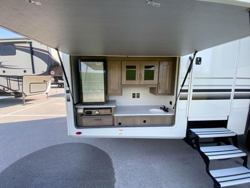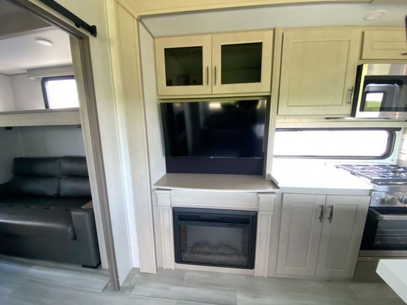 Grab the whole gang and head out in this fifth wheel featuring a private bunkhouse that sleeps five. This unit also features dual entry doors for added convenience with one set leading into a half bath, and quad slides for even more space in this widebody layout. The combined kitchen and living area featuring dual opposing slides offer space to dine and relax including theater seating for two opposite the entertainment center and fireplace. The chef in your group will appreciate the amenities for dreaming up dishes to feed everyone, and the outside griddle, sink and beverage cooler provides even more options. In front, a private bedroom and full bath with a queen bed or optional king, your choice. You can even add a washer and dryer with a space in front prepped for both if you like.