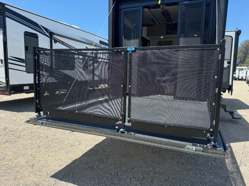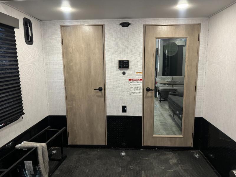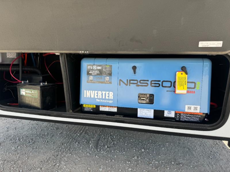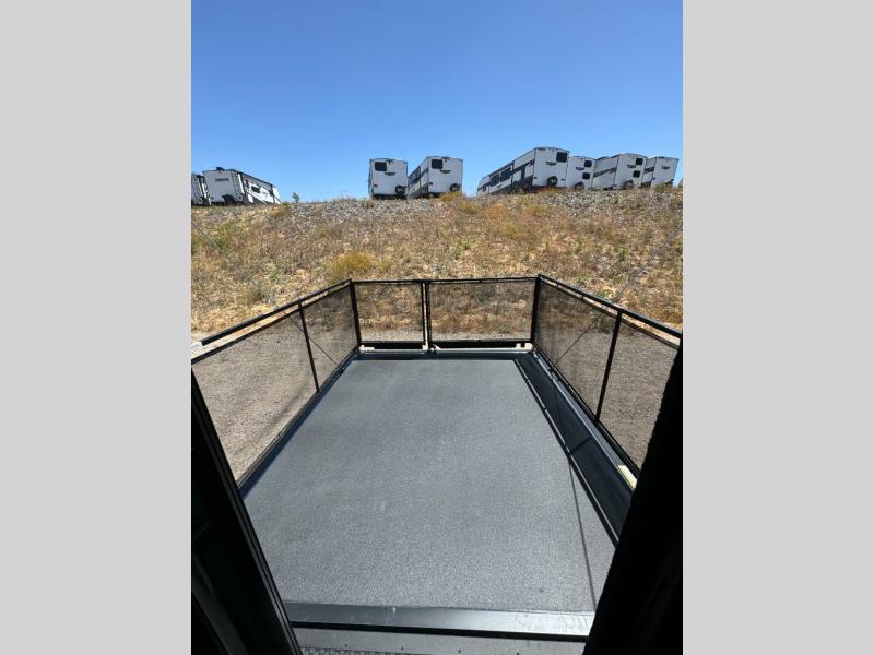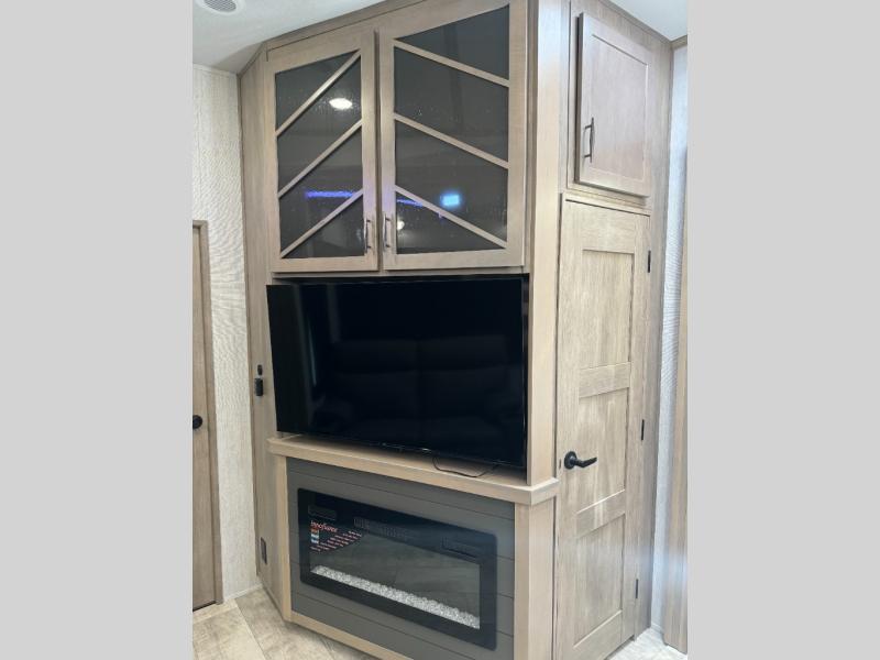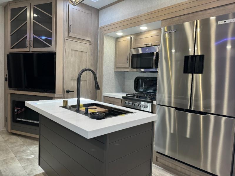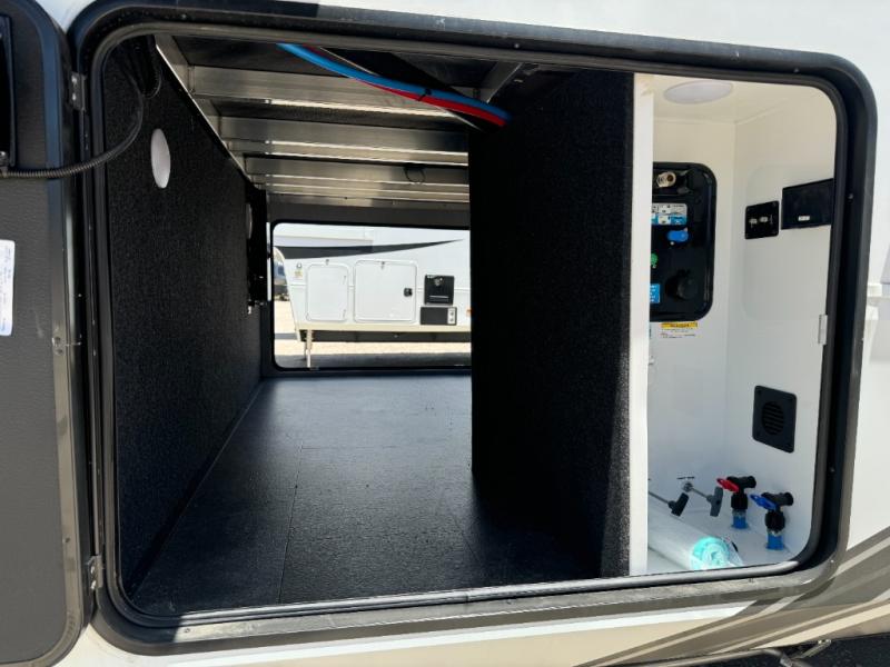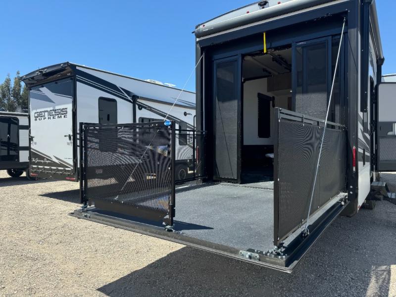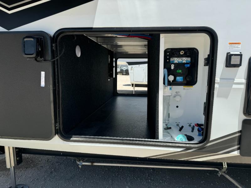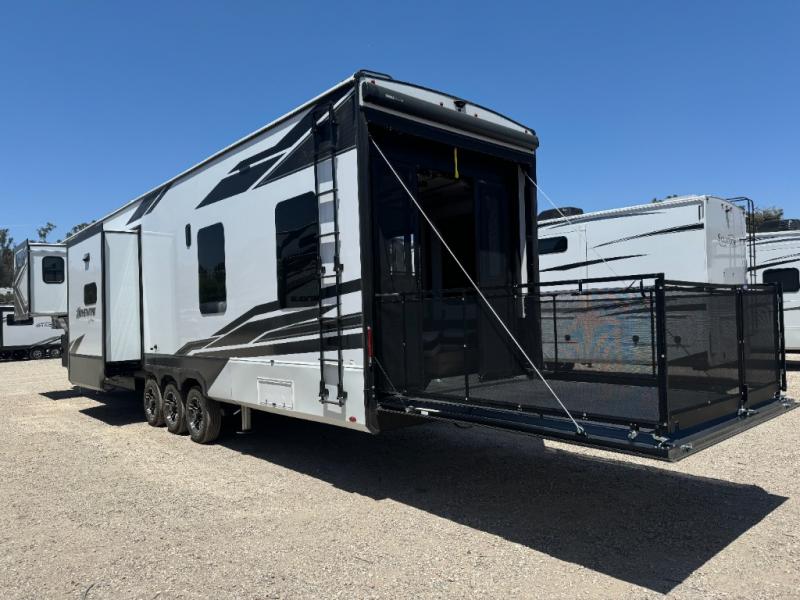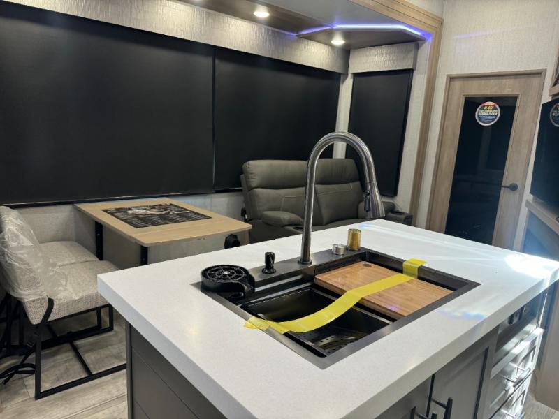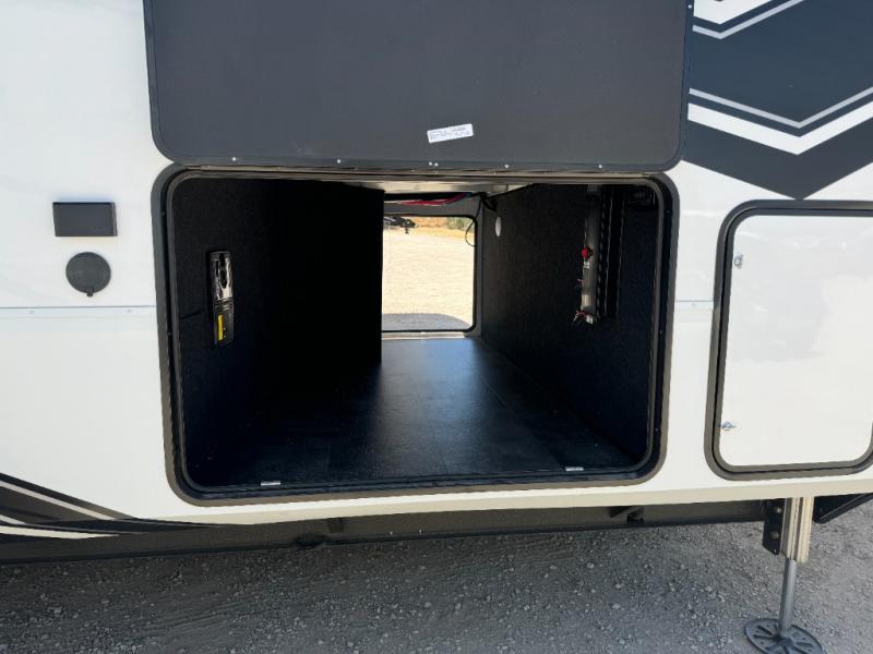 Load up your toys, your clothes and food and start your adventure as you smoothing tow this fifth wheel to your campsite. You will enjoy the Fast Ramp rear ramp door, the Ram-Air garage vents on both sides, and the 2,500 lb. rated flush-mount tie-downs to keep your toys secure. You will surely appreciate the full bathroom and LED TV, plus the option to add Happi-Jac rollover sofas/table with a top bed. The main area provides a living and kitchen area with a 49" LED TV and a fireplace, theatre seating and a free standing dinette, plus full kitchen amenities. There is also a new Smart Sink with a removable cutting board, produce strainer and glass rinser you are sure to love. Head up front to use the full bathroom with a one-piece fiberglass shower with a glass door and teak seat, and fall quickly to sleep on your own queen bed or choose a king option in the front bedroom.