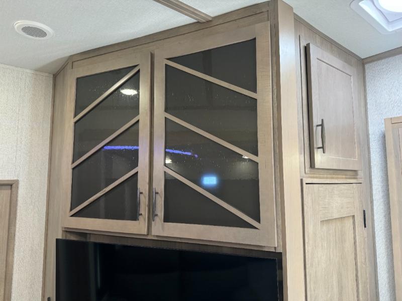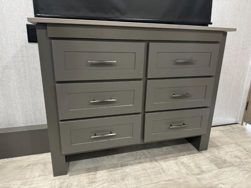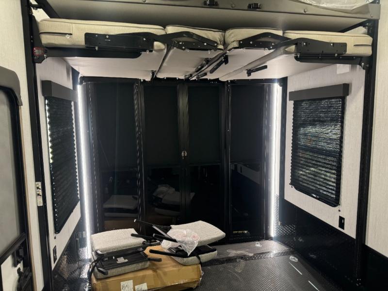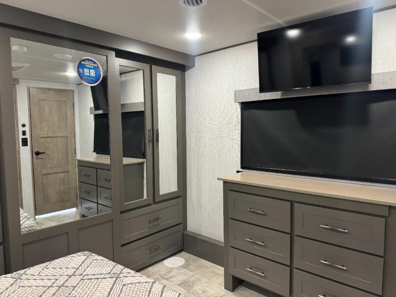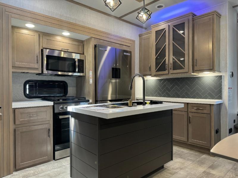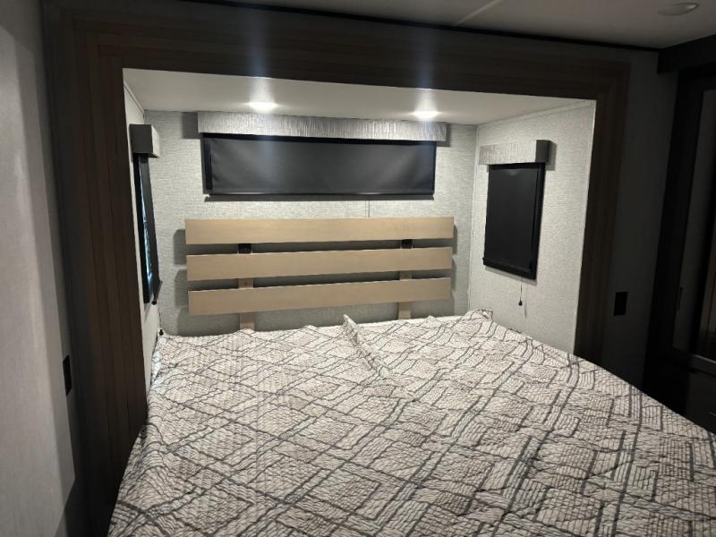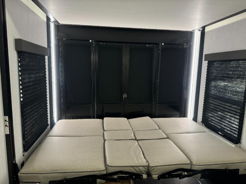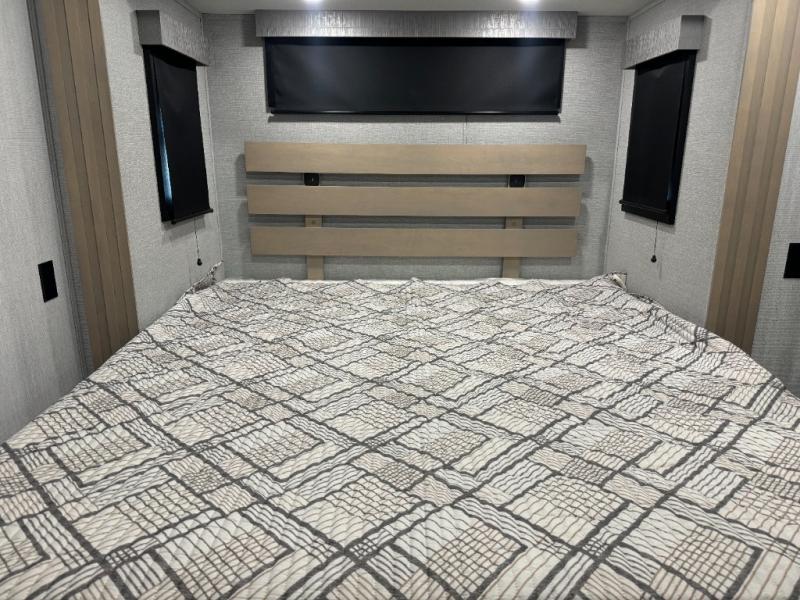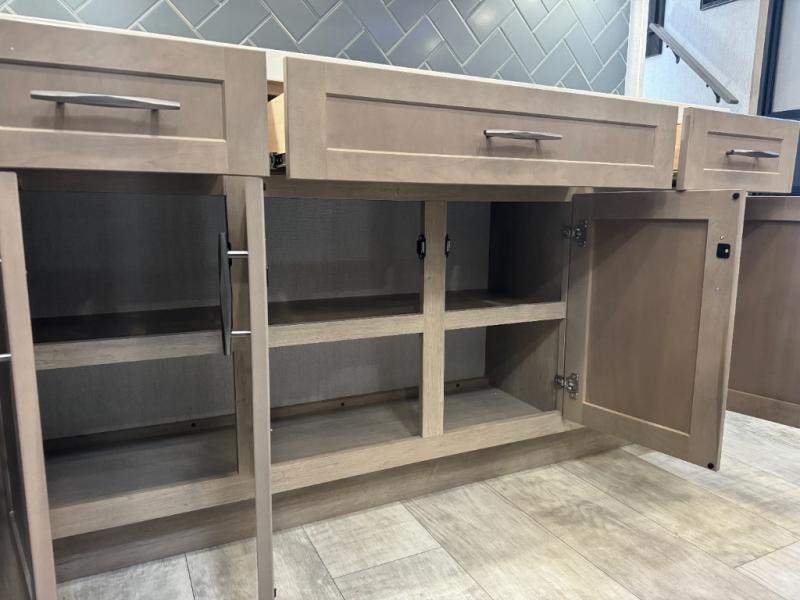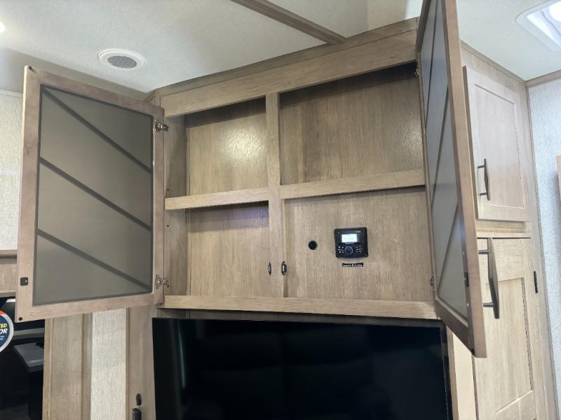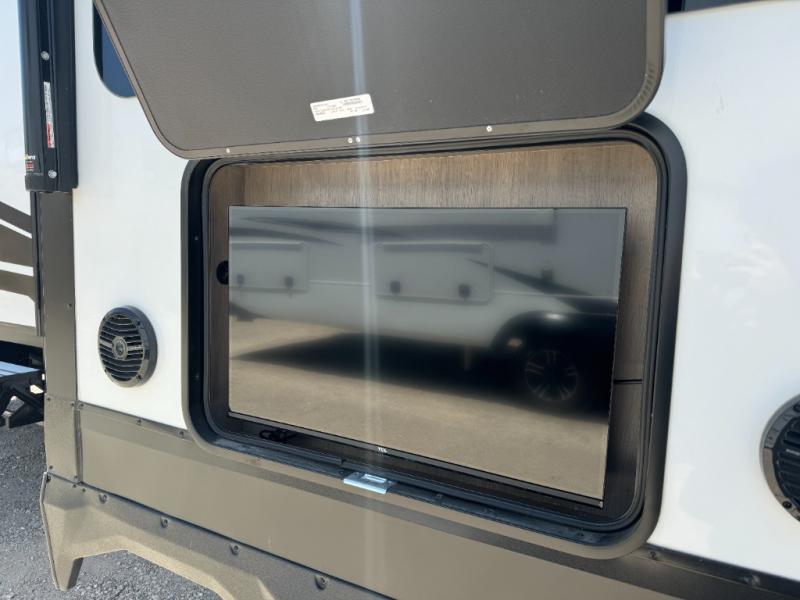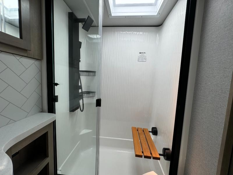 Load up your toys, your clothes and food and start your adventure as you smoothing tow this fifth wheel to your campsite. You will enjoy the Fast Ramp rear ramp door, the Ram-Air garage vents on both sides, and the 2,500 lb. rated flush-mount tie-downs to keep your toys secure. You will surely appreciate the full bathroom and LED TV, plus the option to add Happi-Jac rollover sofas/table with a top bed. The main area provides a living and kitchen area with a 49" LED TV and a fireplace, theatre seating and a free standing dinette, plus full kitchen amenities. There is also a new Smart Sink with a removable cutting board, produce strainer and glass rinser you are sure to love. Head up front to use the full bathroom with a one-piece fiberglass shower with a glass door and teak seat, and fall quickly to sleep on your own queen bed or choose a king option in the front bedroom.
