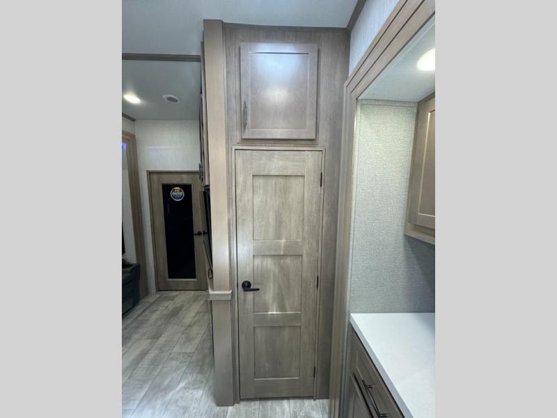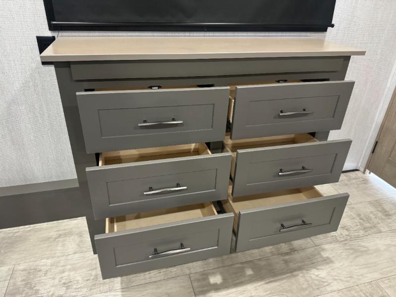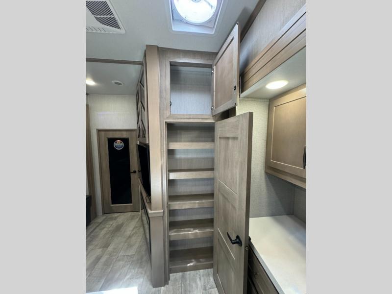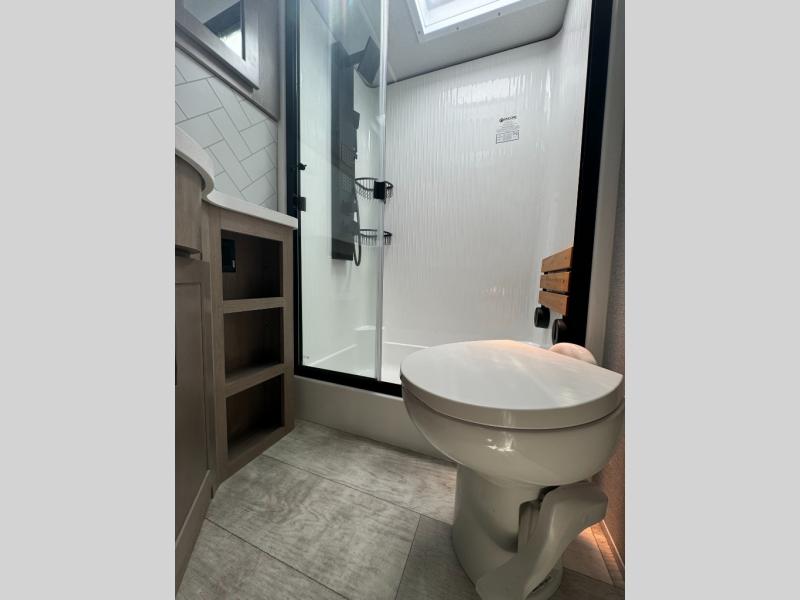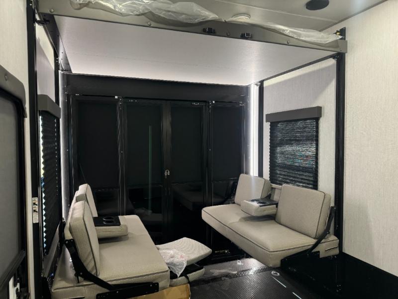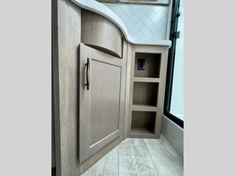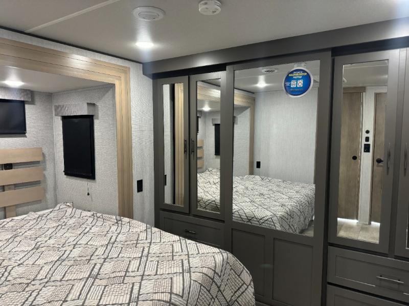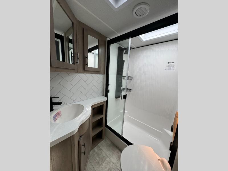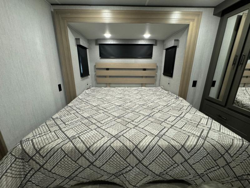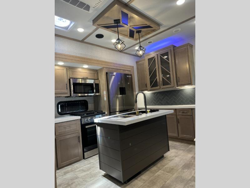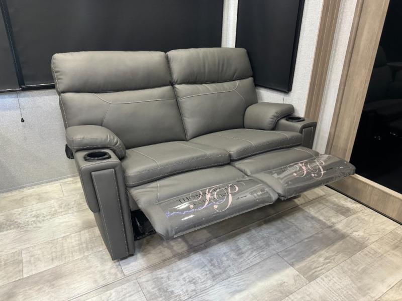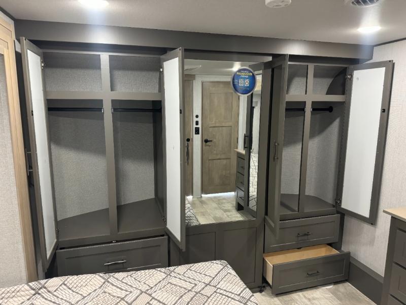 Load up your toys, your clothes and food and start your adventure as you smoothing tow this fifth wheel to your campsite. You will enjoy the Fast Ramp rear ramp door, the Ram-Air garage vents on both sides, and the 2,500 lb. rated flush-mount tie-downs to keep your toys secure. You will surely appreciate the full bathroom and LED TV, plus the option to add Happi-Jac rollover sofas/table with a top bed. The main area provides a living and kitchen area with a 49" LED TV and a fireplace, theatre seating and a free standing dinette, plus full kitchen amenities. There is also a new Smart Sink with a removable cutting board, produce strainer and glass rinser you are sure to love. Head up front to use the full bathroom with a one-piece fiberglass shower with a glass door and teak seat, and fall quickly to sleep on your own queen bed or choose a king option in the front bedroom.