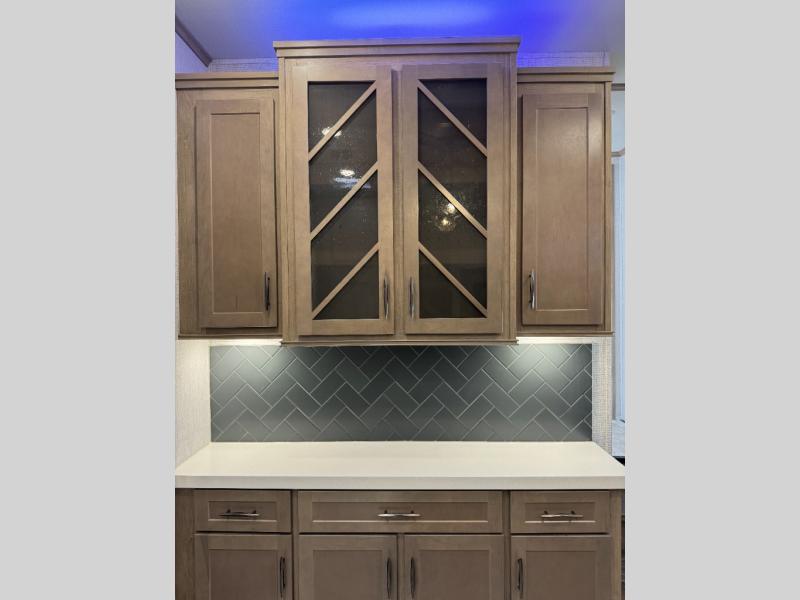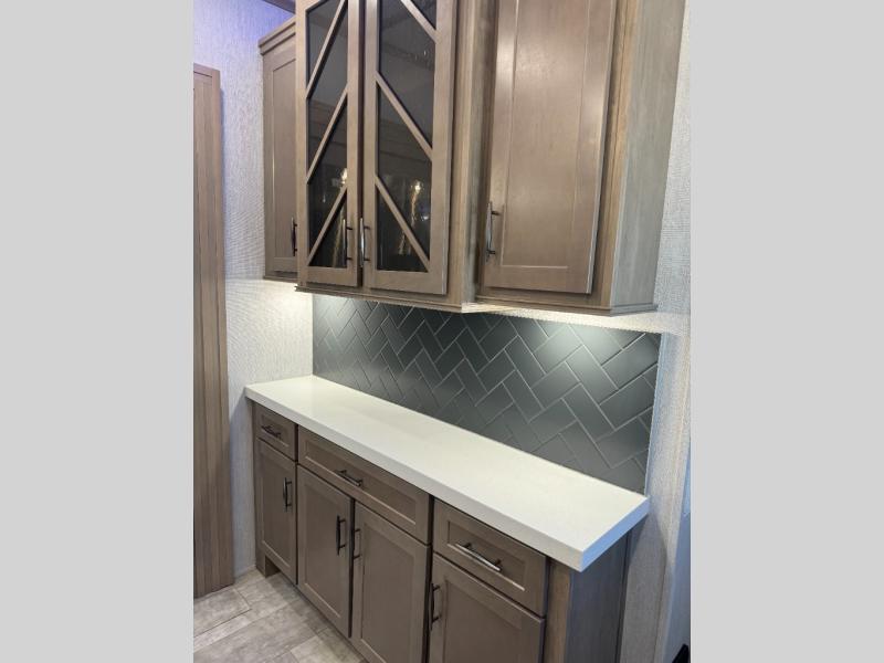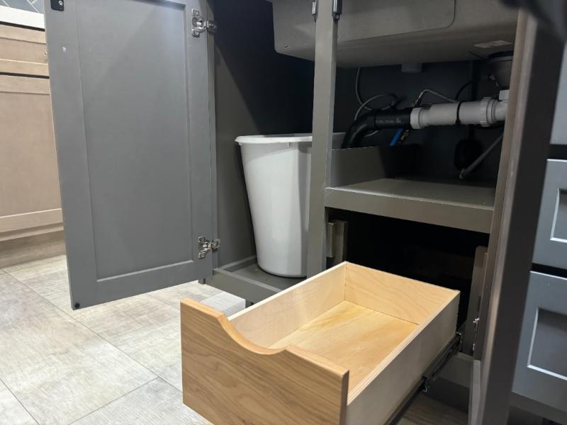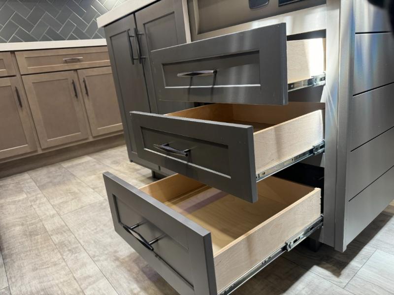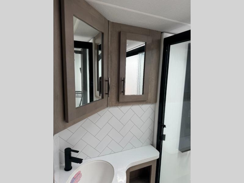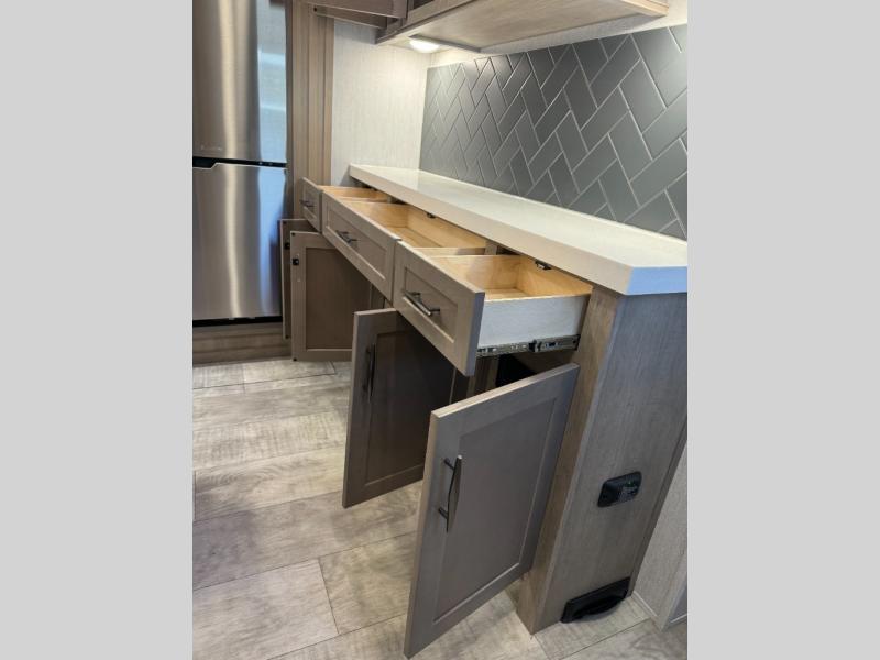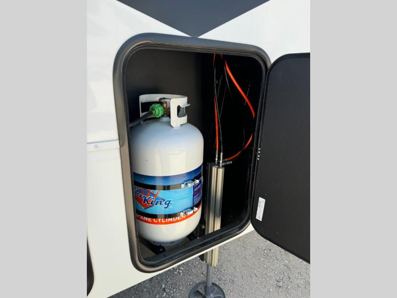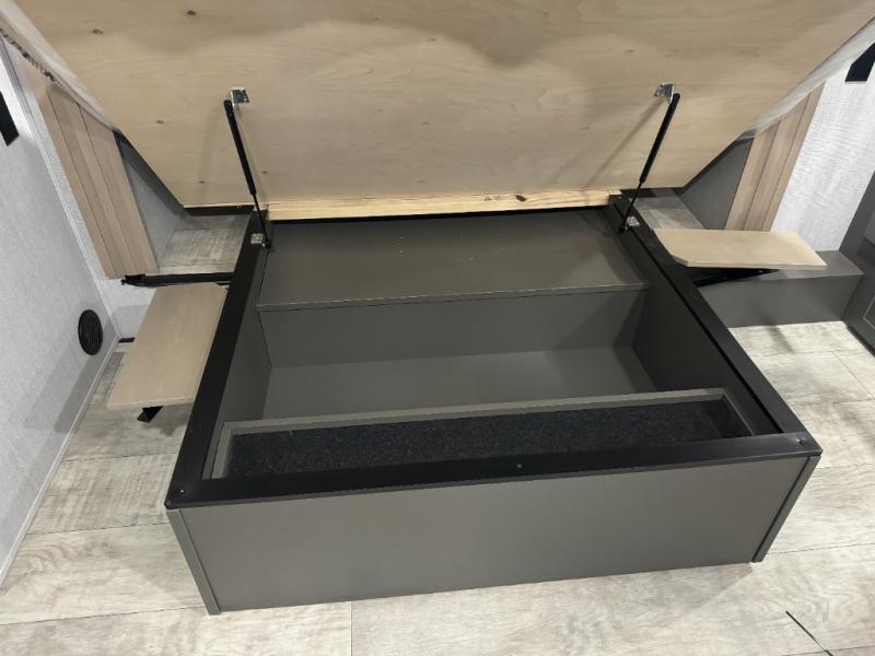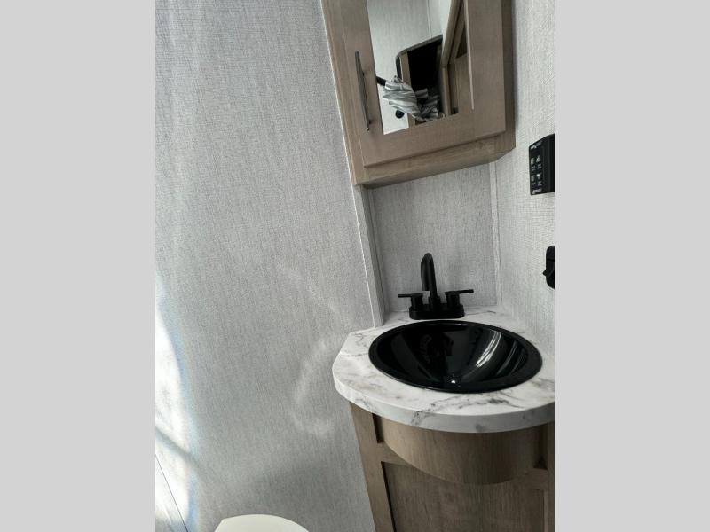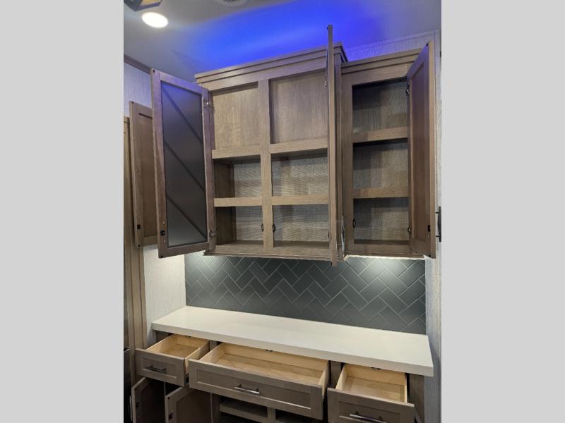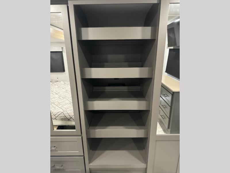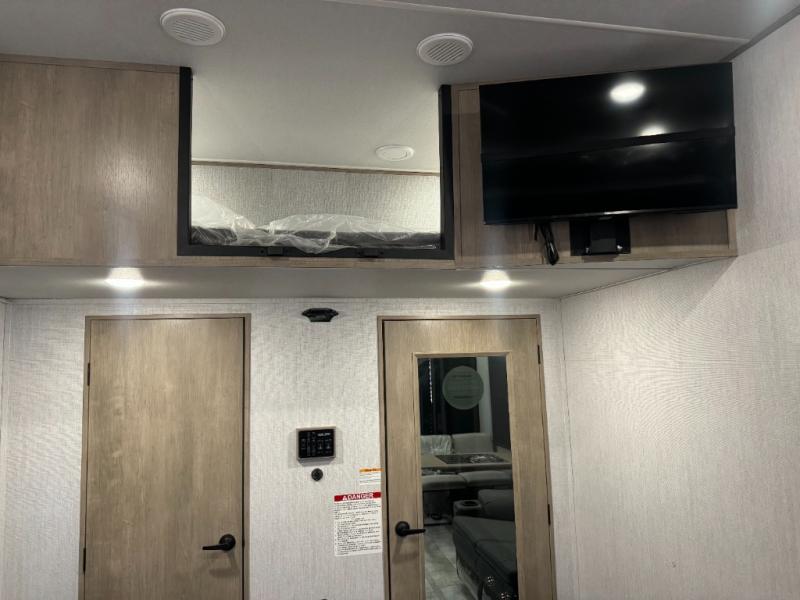 Load up your toys, your clothes and food and start your adventure as you smoothing tow this fifth wheel to your campsite. You will enjoy the Fast Ramp rear ramp door, the Ram-Air garage vents on both sides, and the 2,500 lb. rated flush-mount tie-downs to keep your toys secure. You will surely appreciate the full bathroom and LED TV, plus the option to add Happi-Jac rollover sofas/table with a top bed. The main area provides a living and kitchen area with a 49" LED TV and a fireplace, theatre seating and a free standing dinette, plus full kitchen amenities. There is also a new Smart Sink with a removable cutting board, produce strainer and glass rinser you are sure to love. Head up front to use the full bathroom with a one-piece fiberglass shower with a glass door and teak seat, and fall quickly to sleep on your own queen bed or choose a king option in the front bedroom.