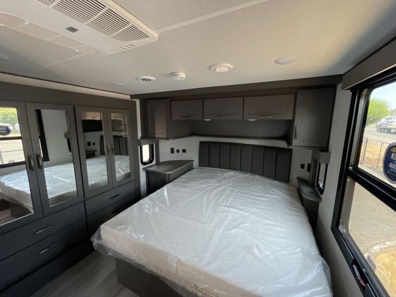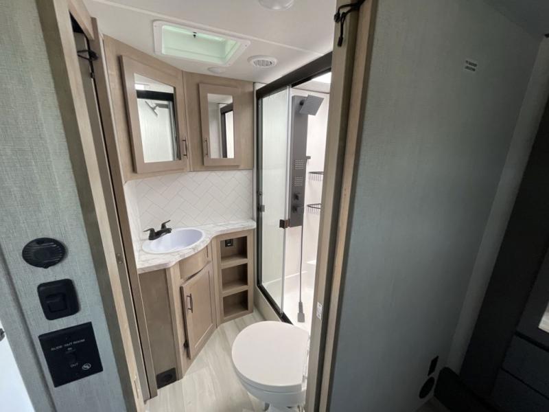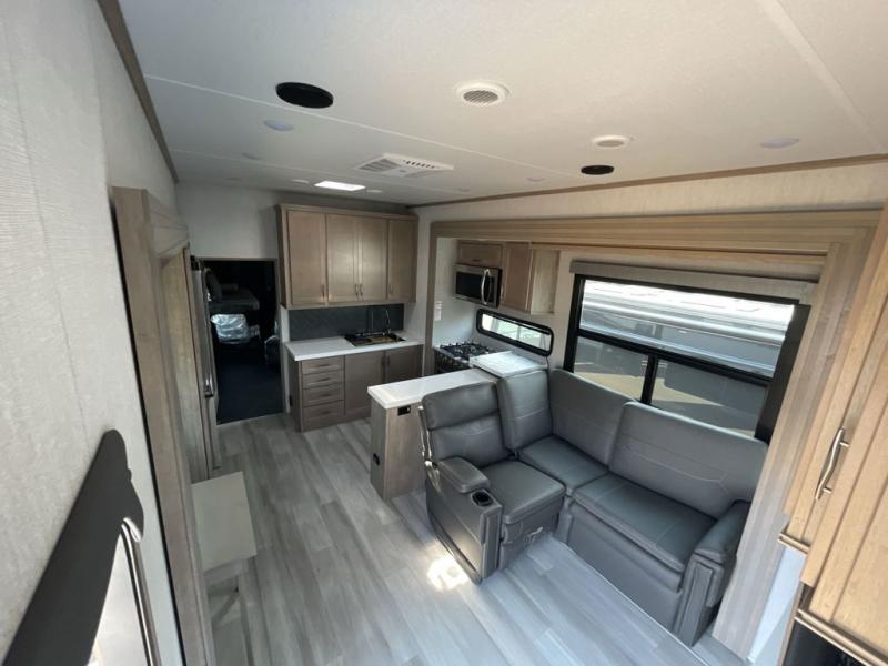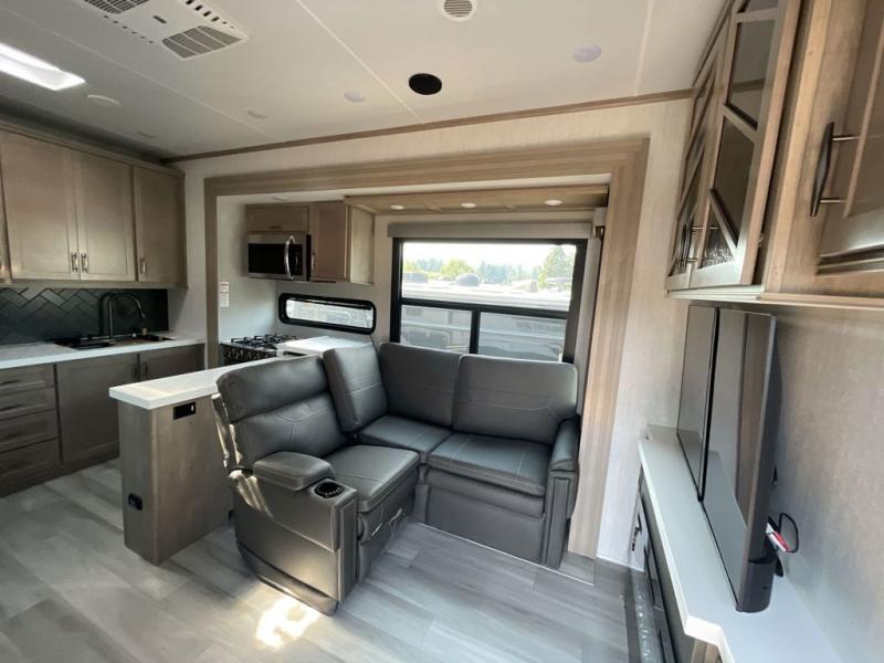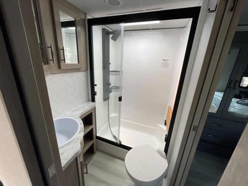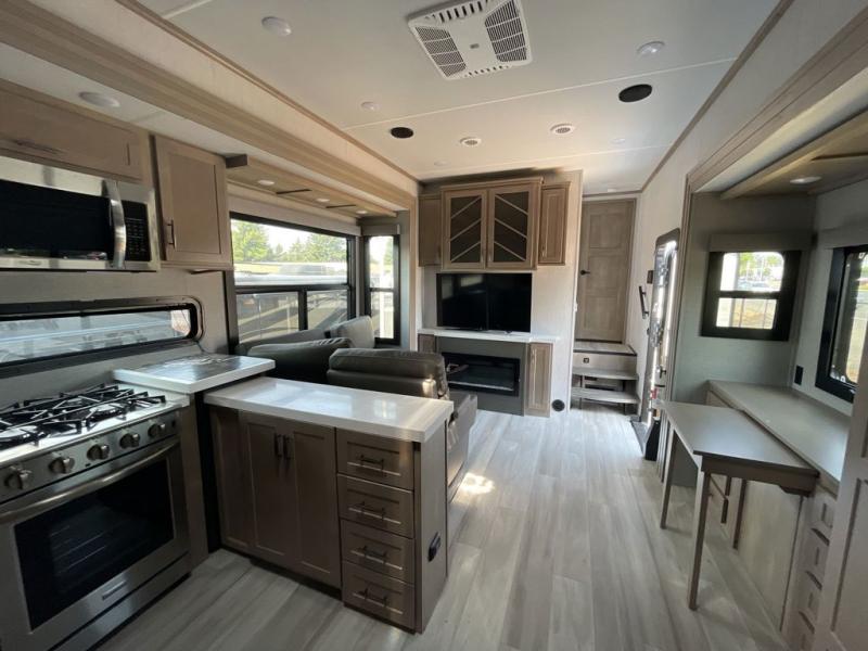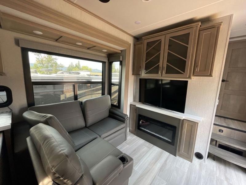 Step into the main living area and discover generous counter space, a 20 cu. ft. refrigerator, an L-shaped sofa, and a hybrid desk/dinette perfect for dining or remote work. The dual-entry bath ensures easy access to the front master bedroom, featuring a queen bed (optional king), overhead storage, and a wardrobe slide to keep all your belongings organized. A fireplace adds a cozy touch, perfect for relaxing after a day of adventure.