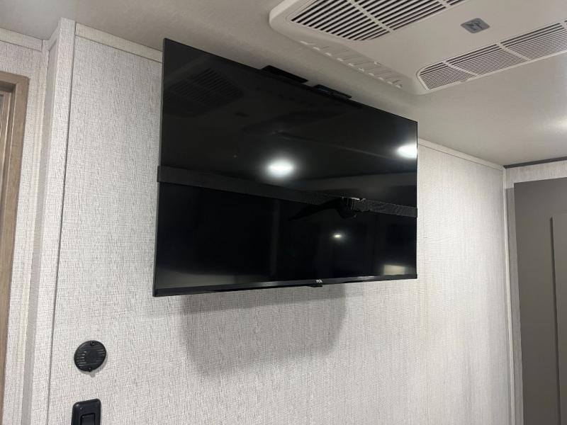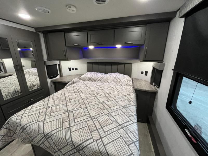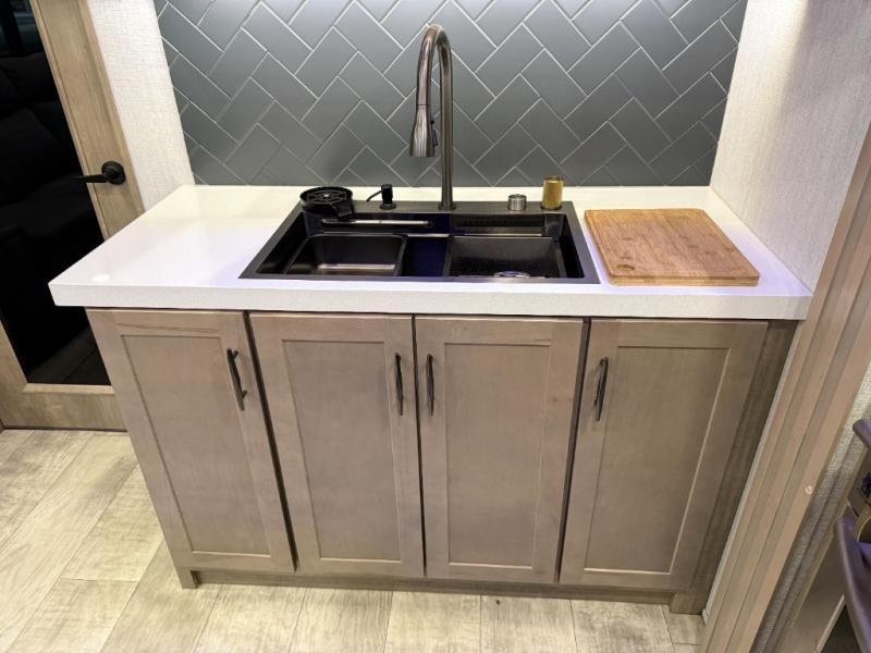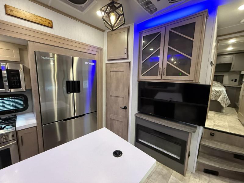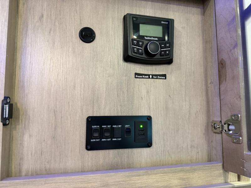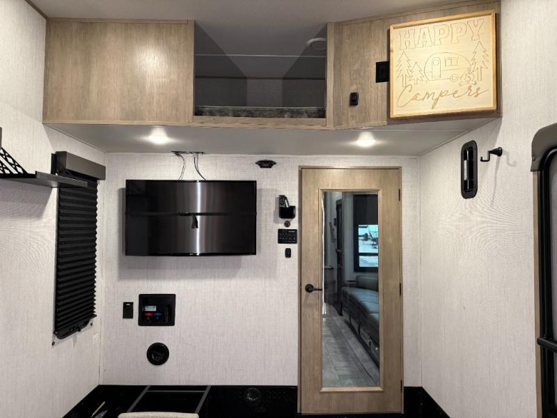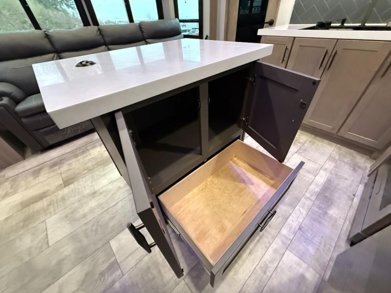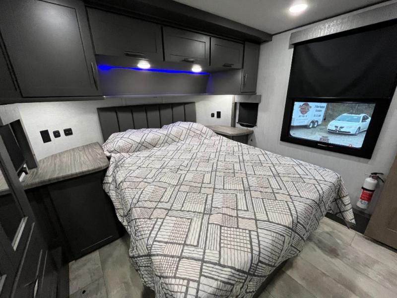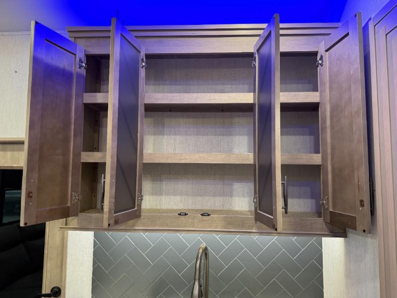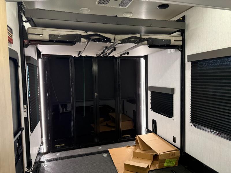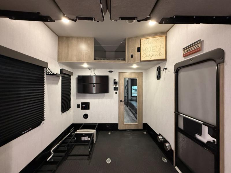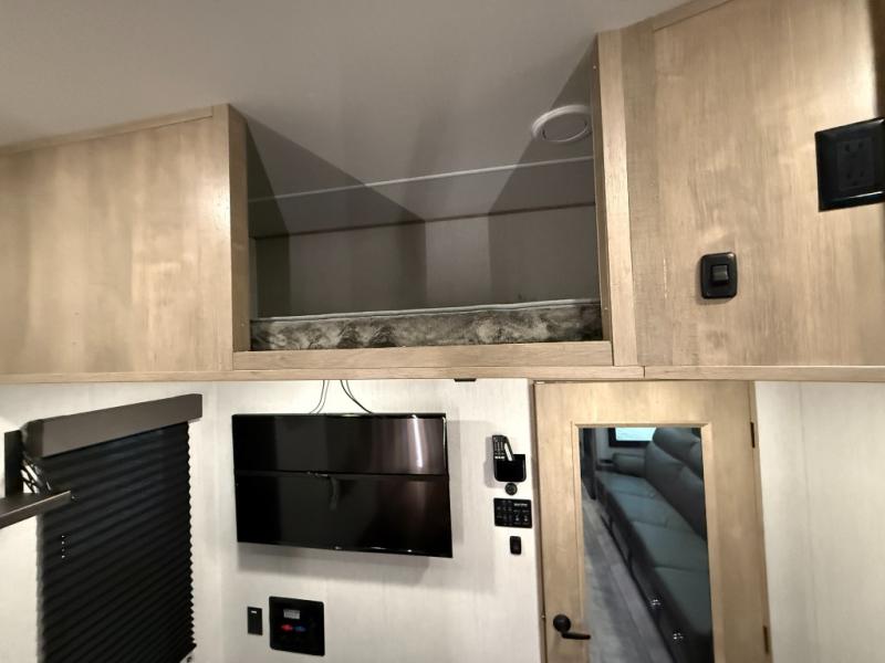 Load up your toys, gear, clothes and food to enjoy some off-road fun with your toys and friends! Once at the RV park, unload your toys and set up the three slide outs, the two awnings, and begin planning your trail rides! You might decide to make a meal or snack in the combined kitchen and main living area which offers all the appliances you need, plus a kitchen island with two bar stools, a pantry, an LED TV with a fireplace below, plus a slide out four-seat sofa. The garage even offers the option to add Happi-Jac rollover sofas and a table with a top bed if you want seating and sleeping space, plus there is storage, washer/dryer prep, and an optional half bath. The overhead loft bed provides sleeping space as well. You will love the sunken tub/shower with a seat in the full bathroom with a space savings sliding door, and the front bedroom can be your escape. There is a queen bed, a slide out wardrobe and USB charging outlets.