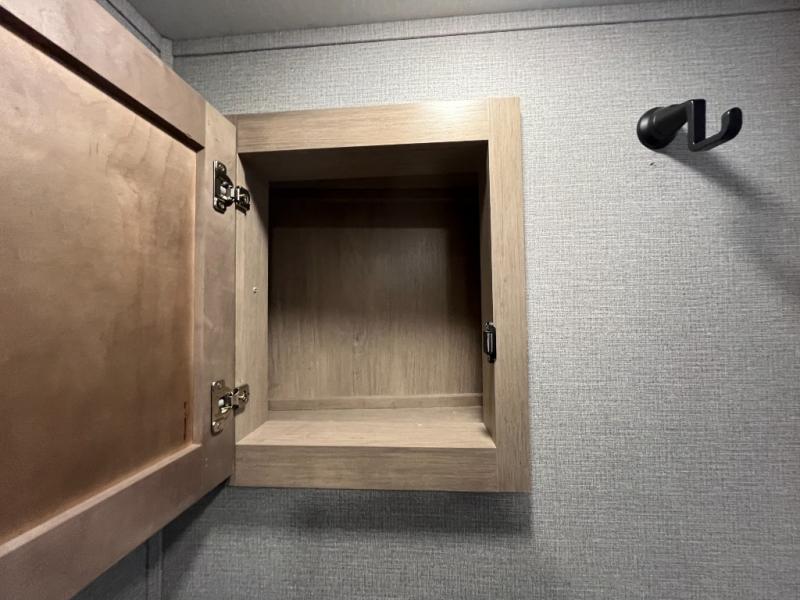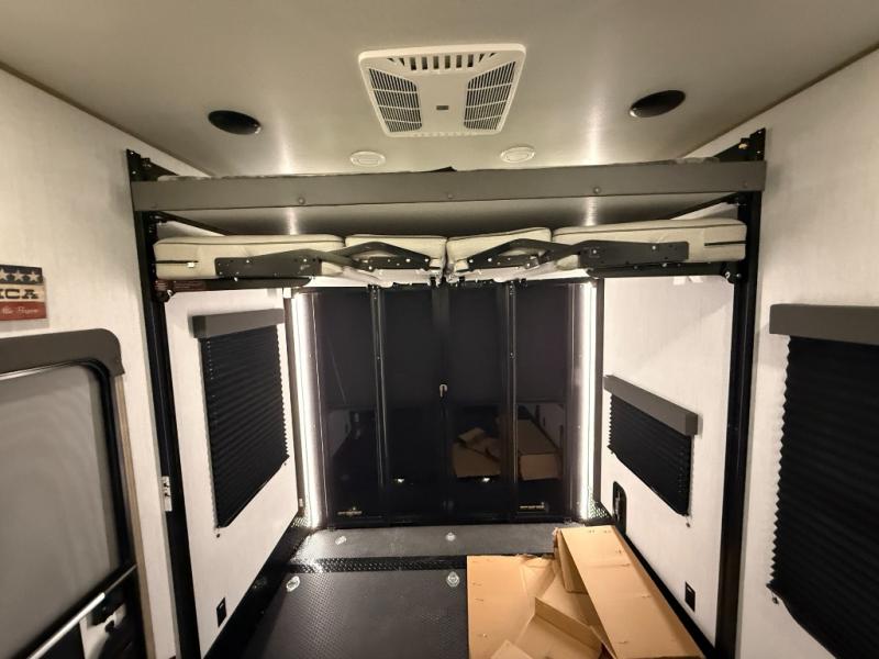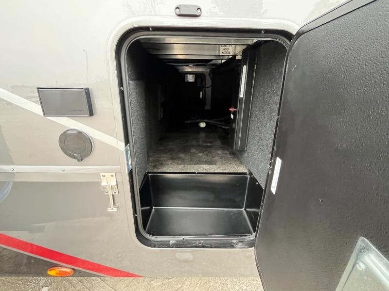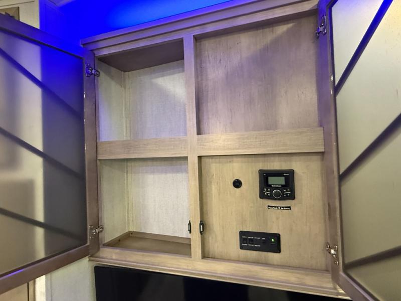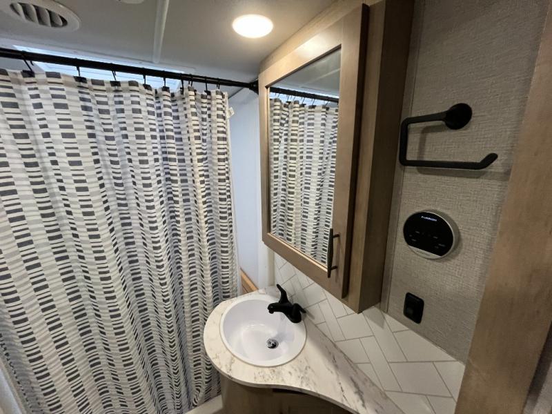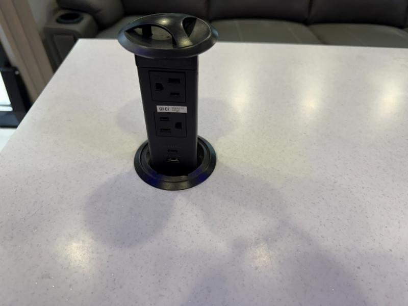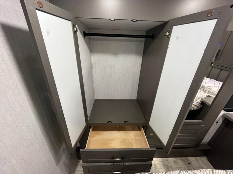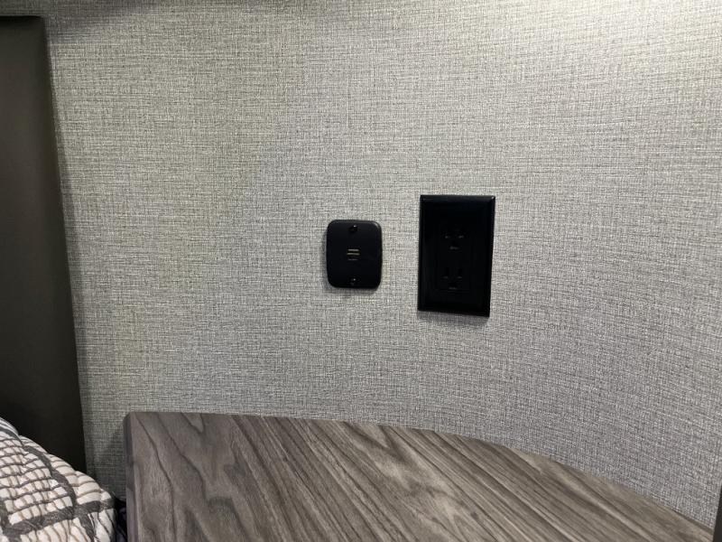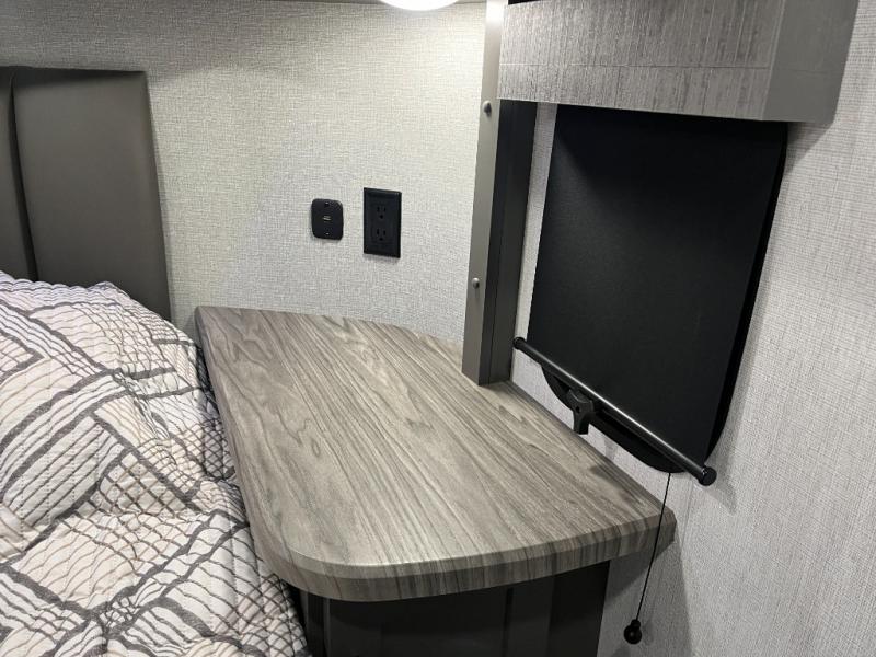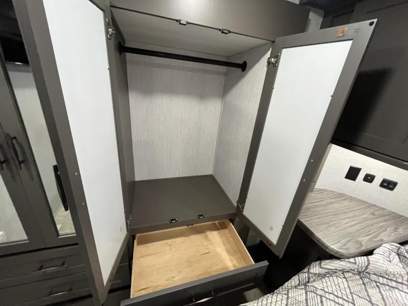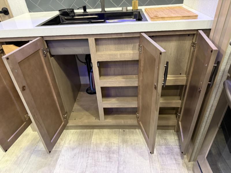 Load up your toys, gear, clothes and food to enjoy some off-road fun with your toys and friends! Once at the RV park, unload your toys and set up the three slide outs, the two awnings, and begin planning your trail rides! You might decide to make a meal or snack in the combined kitchen and main living area which offers all the appliances you need, plus a kitchen island with two bar stools, a pantry, an LED TV with a fireplace below, plus a slide out four-seat sofa. The garage even offers the option to add Happi-Jac rollover sofas and a table with a top bed if you want seating and sleeping space, plus there is storage, washer/dryer prep, and an optional half bath. The overhead loft bed provides sleeping space as well. You will love the sunken tub/shower with a seat in the full bathroom with a space savings sliding door, and the front bedroom can be your escape. There is a queen bed, a slide out wardrobe and USB charging outlets.