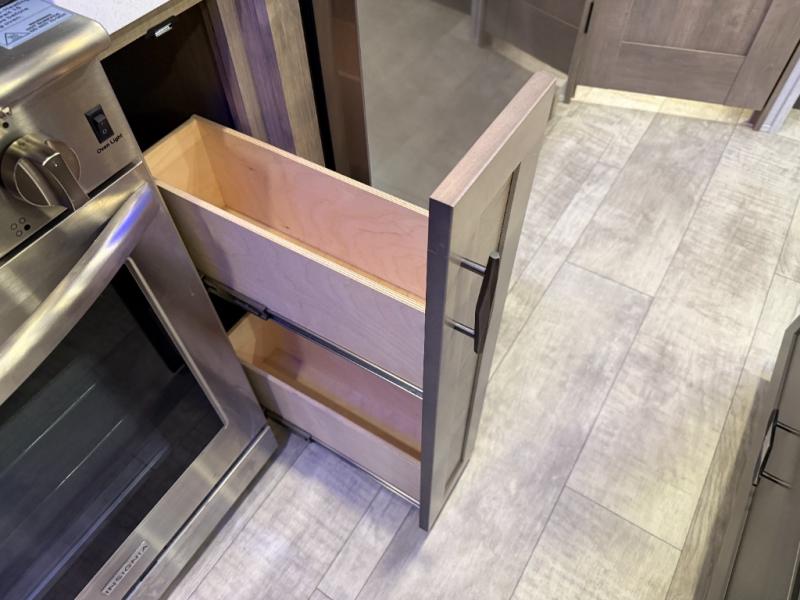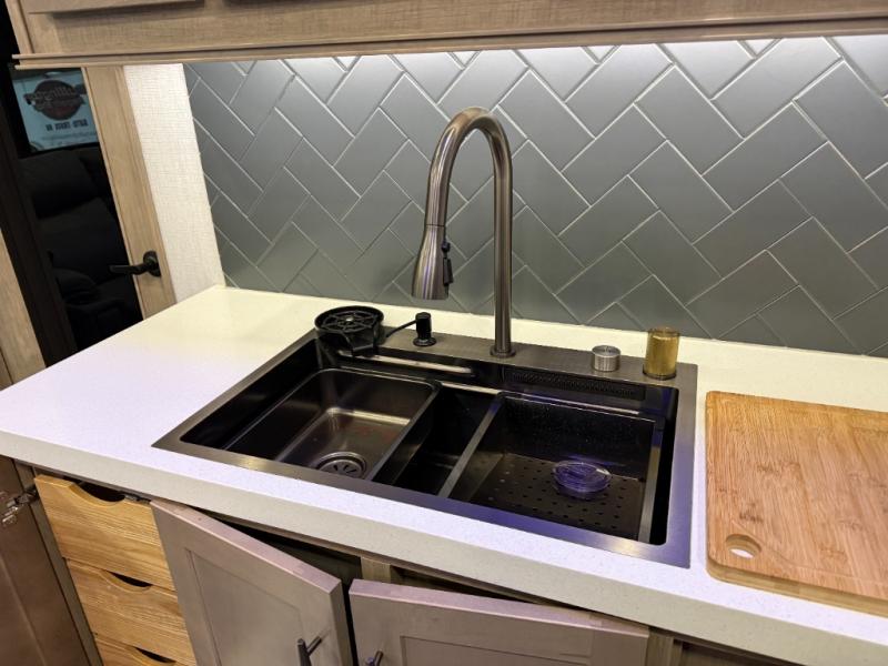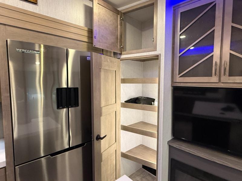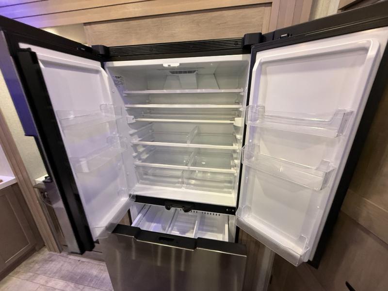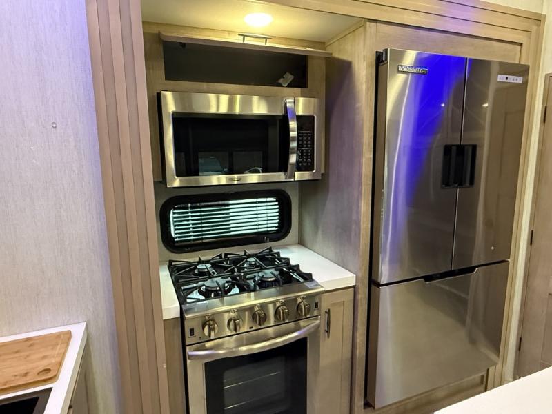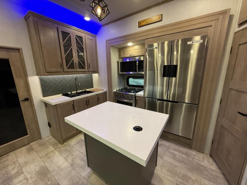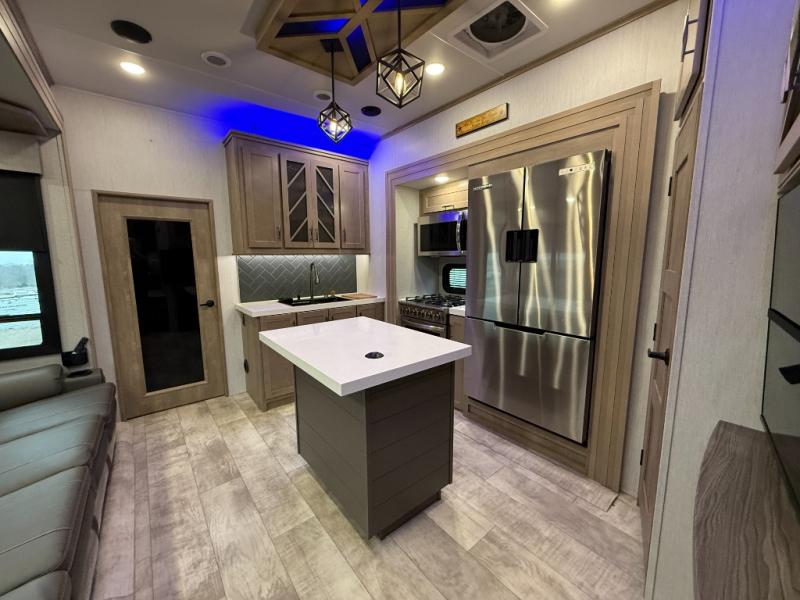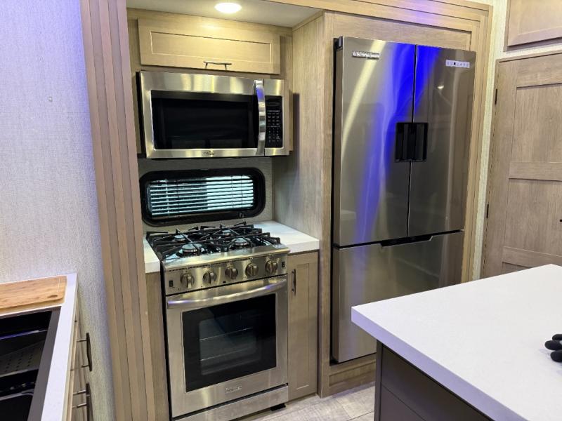 With any Momentum M-Class toy hauler by Grand Design, you will enjoy luxury at every turn! They have been constructed to a superior standard with a thermal roof design, triple insulated main floor and garage floor, and a Rail-Tite underbelly seal that will allow you to camp in all elements. Each model also features an 8' 5" wide body chassis with a wide rail design, no wheel wheels, and a dovetail entry for easier loading. The Stealth A/C system provides maximum cooling power, and the CRE3000 suspension system means you can enjoy a smooth tow each time. You will love the luxurious interior with a professional grade stainless steel cooktop, interior color changing LED accent lighting, a fiberglass shower with a glass door, and solid surface countertops.