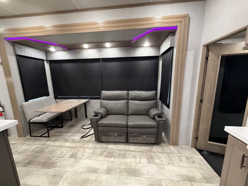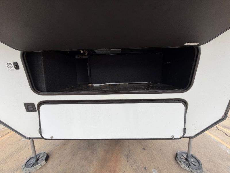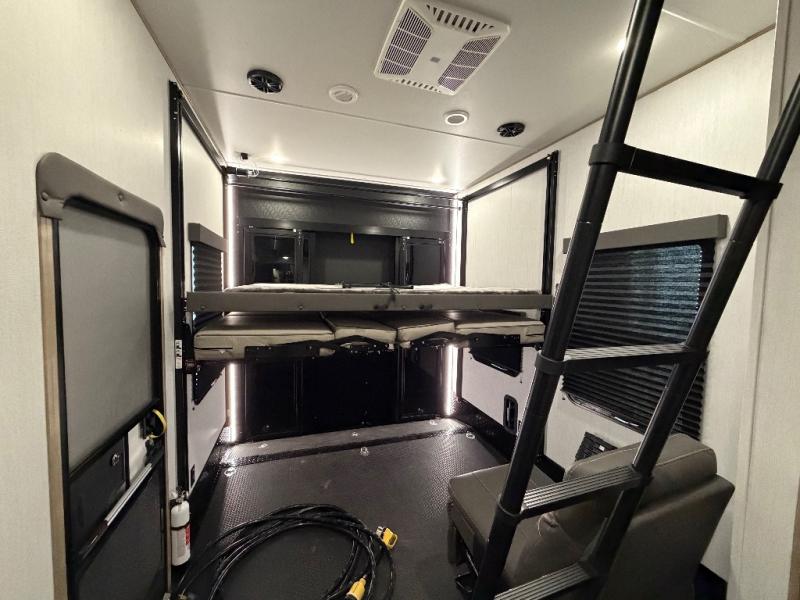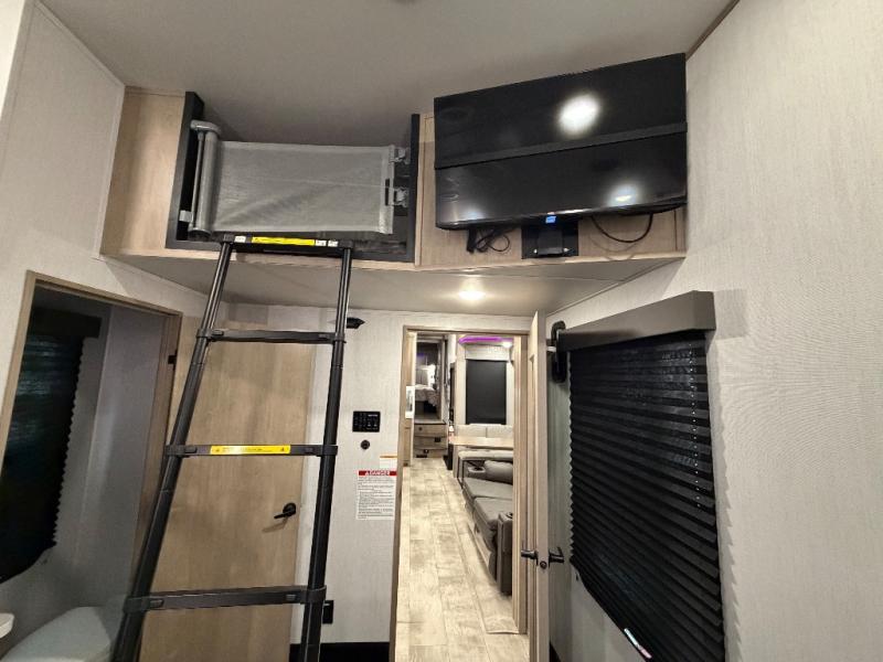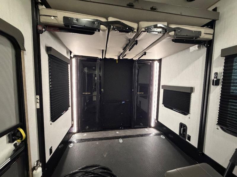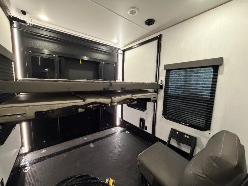 You want a toy hauler to carry your toys to the trails, and you can get an extra living room/bedroom out of this space once everything is unload when you add the Happi-Jac rollover sofas with a table with a top bed option. You might even like to add more optional features such a half bath and washer/dryer. There is an overhead loft bed and an L-shaped pull-out sofa in the main living area that offers sleeping space as well. Everyone can watch a movie on the LED TV with a fireplace below while sitting on the sofa, in the theatre seats, or while at the free standing dinette with four chairs. The chef will have upgraded appliances to make meals for everyone, an L-shaped countertop with a kitchen sink, and a USB charging outlet. You will love the shower with seat in the full bathroom with two space savings sliding doors that lead into the hallway, and into the front bedroom where you will have a walk-around queen bed, a slide out wardrobe and more USB charging outlets.