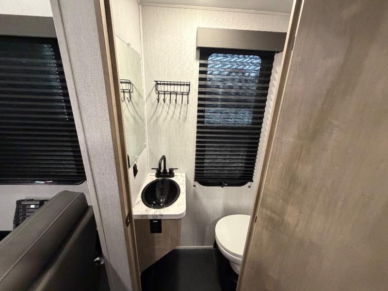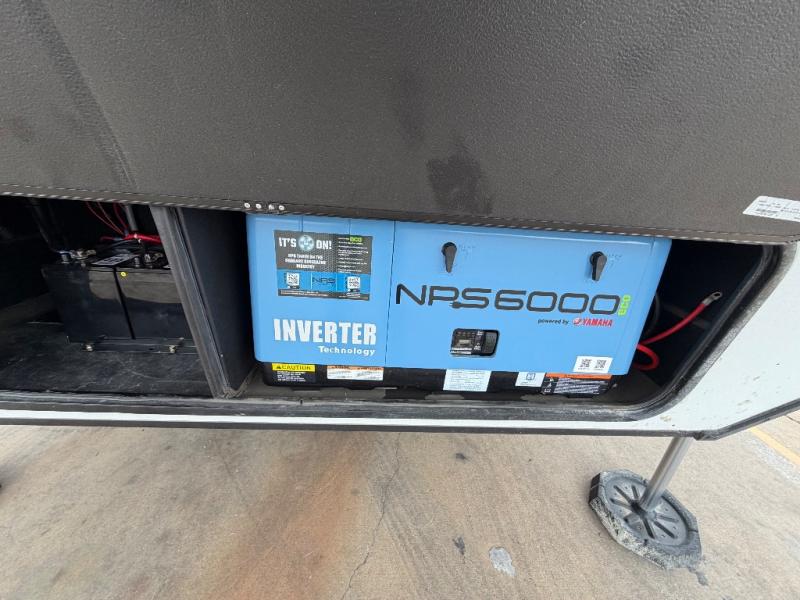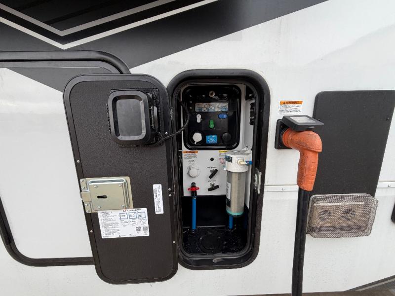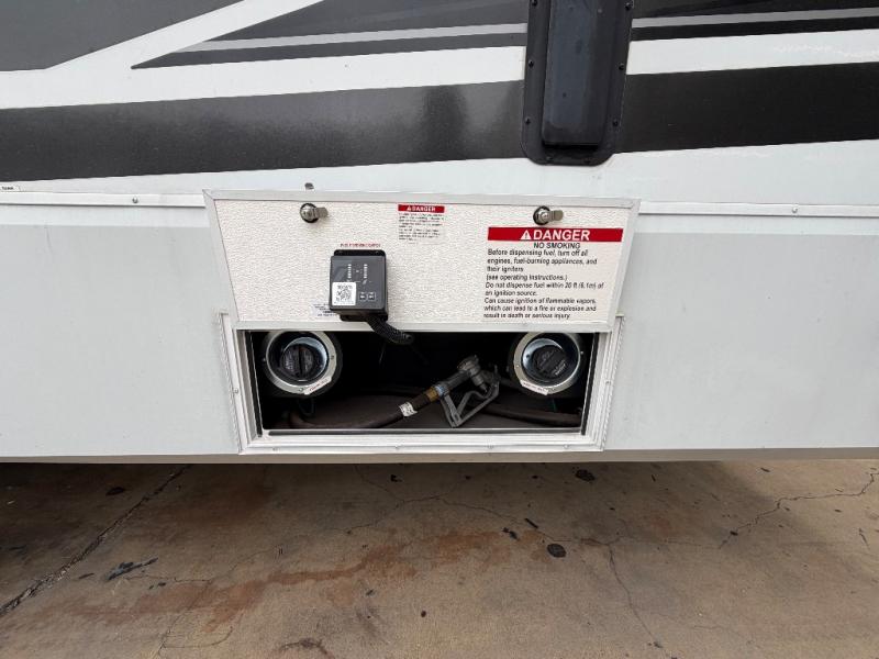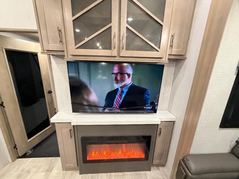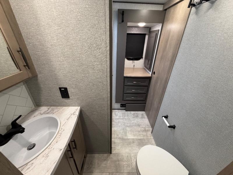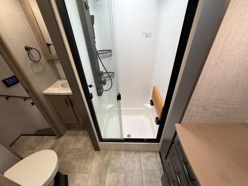 You want a toy hauler to carry your toys to the trails, and you can get an extra living room/bedroom out of this space once everything is unload when you add the Happi-Jac rollover sofas with a table with a top bed option. You might even like to add more optional features such a half bath and washer/dryer. There is an overhead loft bed and an L-shaped pull-out sofa in the main living area that offers sleeping space as well. Everyone can watch a movie on the LED TV with a fireplace below while sitting on the sofa, in the theatre seats, or while at the free standing dinette with four chairs. The chef will have upgraded appliances to make meals for everyone, an L-shaped countertop with a kitchen sink, and a USB charging outlet. You will love the shower with seat in the full bathroom with two space savings sliding doors that lead into the hallway, and into the front bedroom where you will have a walk-around queen bed, a slide out wardrobe and more USB charging outlets.